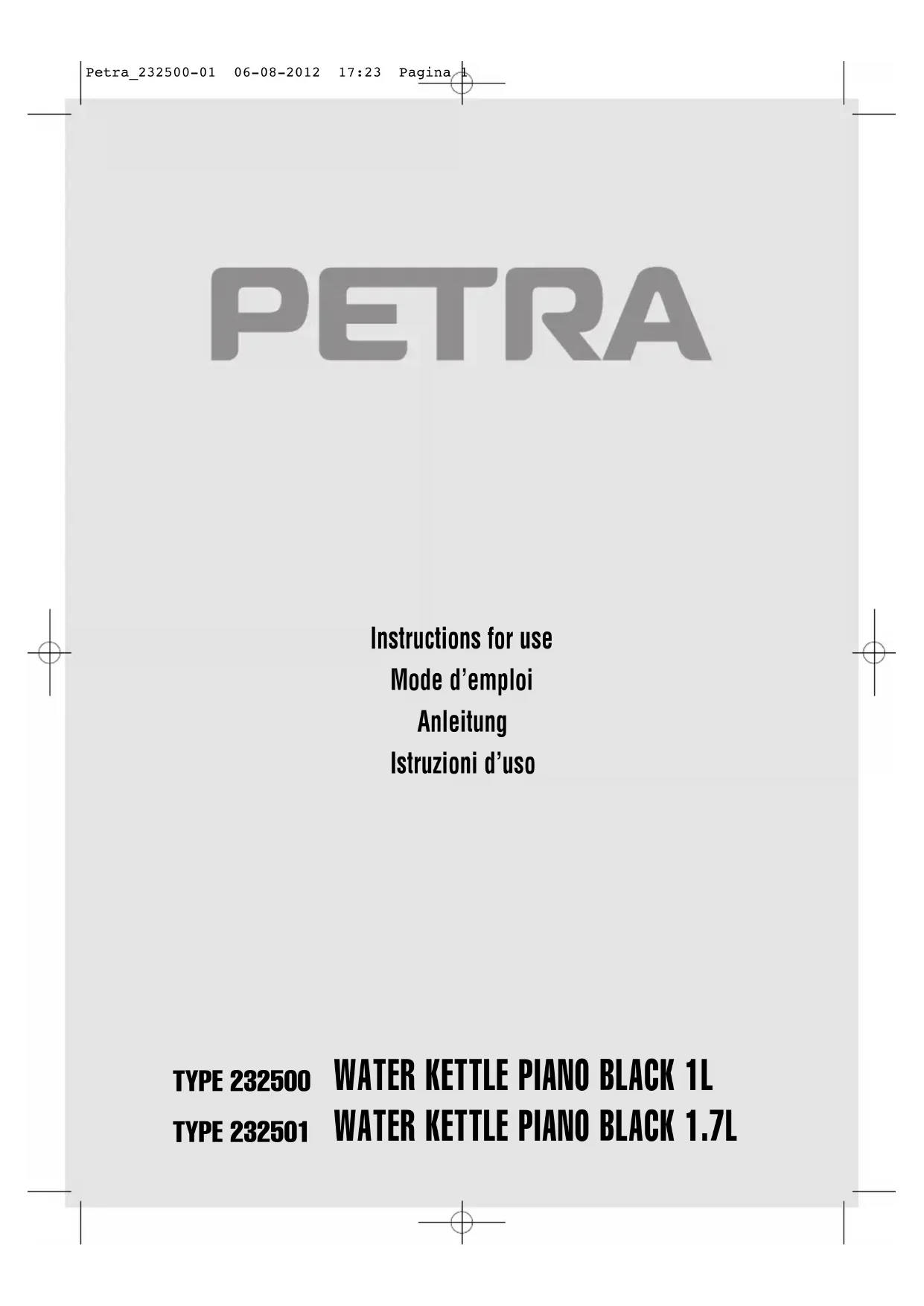 PETRA WATER KETTLE PIANO BLACK 1L / 1.7L ART. 232500 / 232501 AVANT L'EMPLOI Lisez attentivement ce mode d'emploi et conservez-le afin de pouvoir le consulter ultérieurement si nécessaire. Assurez-vous que le voltage de votre logement correspond à celui indiqué sur l'appareil. Raccordez l’appareil uniquement à une prise de terre. La bouilloire est équipée d’un filtre (amovible) intégré dans l’orifice du verseur. La bouilloire se détache de son socle et peut pivoter de 360 degrés ce qui la rend très pratique à utiliser aussi bien pour les droitiers que les gauchers. L’élément de chauffe intégré est résistant au calcaire ce qui lui garantit une longue durée de vie. Equipée d’un interrupteur marche/arrêt éclairé et d’un dispositif de verrouillage du couvercle pour la sécurité. Pour ouvrir le couvercle, il suffit d’appuyer sur le bouton. Triple sécurité intégrée : arrêt automatique, protection anti-usage à sec et protection anti-surchauffe.