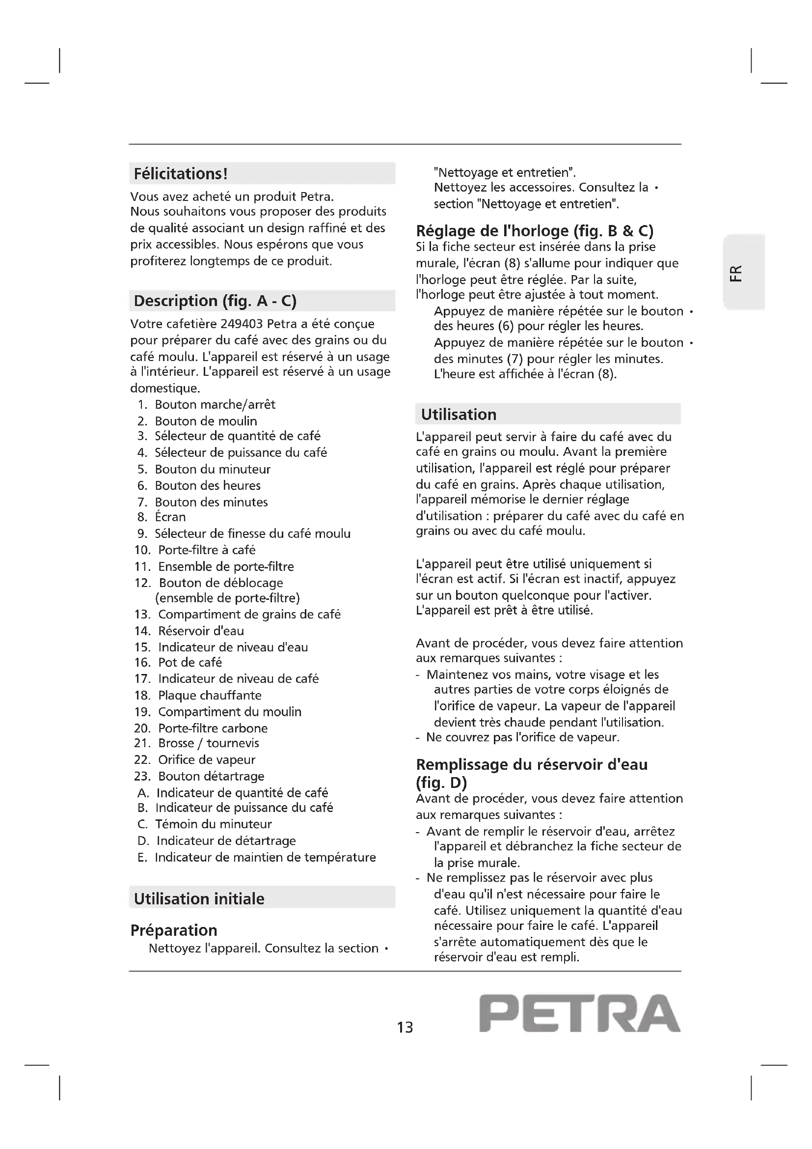 Félicitations! Vous avez acheté un produit Petra. Nous souhaitons vous proposer des produits de qualité associant un design raffiné et des prix accessibles. Nous espérons que vous profiterez longtemps de ce produit. Description (fig. A - C) Votre cafetière 249403 Petra a été conçue pour préparer du café avec des grains ou du café moulu. L'appareil est réservé à un usage à l'intérieur. L'appareil est réservé à un usage domestique.
