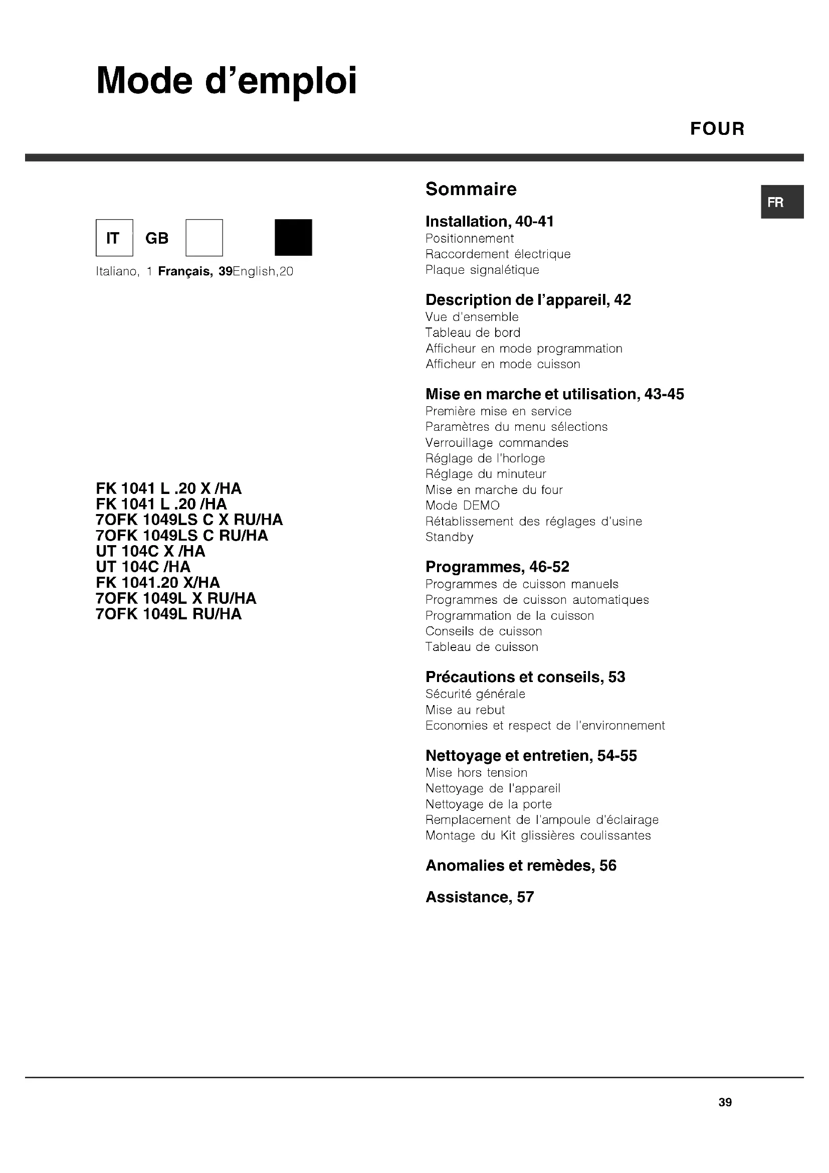 Sommaire Installation, 40-41 Positionnement Raccordement électrique Plaque signalétique Description de l’appareil, 42 Vue d’ensemble Tableau de bord Afficheur en mode programmation Afficheur en mode cuisson Mise en marche et utilisation, 43-45 Première mise en service Paramètres du menu sélections Verrouillage commandes Réglage de l’horloge Réglage du minuteur Mise en marche du four Mode DEMO Rétablissement des réglages d’usine Standby Programmes, 46-52 Programmes de cuisson manuels Programmes de cuisson automatiques Programmation de la cuisson Conseils de cuisson Tableau de cuisson Précautions et conseils, 53 Sécurité générale Mise au rebut Economies et respect de l’environnement Nettoyage et entretien, 54-55 Mise hors tension Nettoyage de l’appareil Nettoyage de la porte Remplacement de l’ampoule d’éclairage Montage du Kit glissières coulissantes Anomalies et remèdes, 56 Assistance, 57 Mode d’emploi Italiano, 1 Français, 39English,20 IT FRGB40