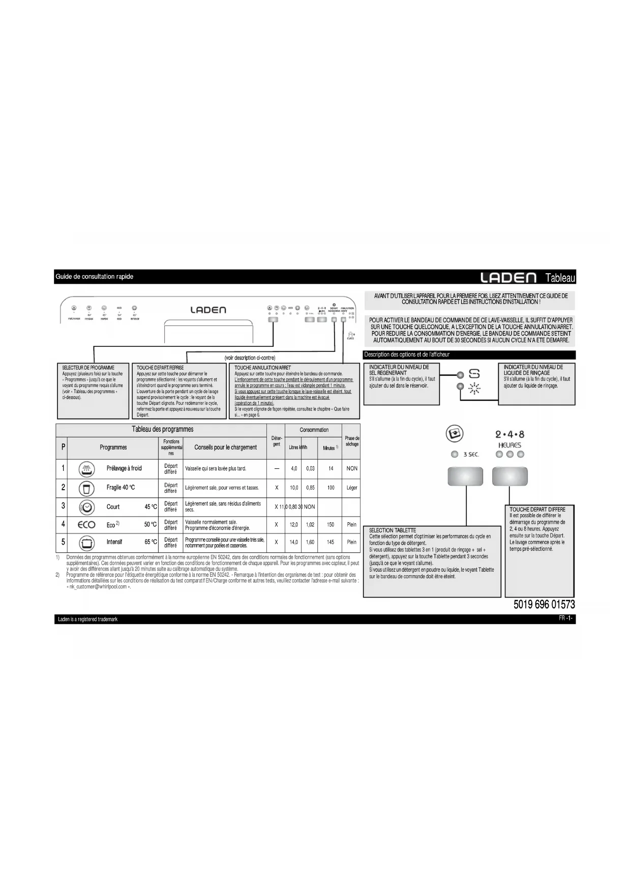 AVANT D'UTILISER L'APPAREIL POUR LA PREMIERE FOIS, LISEZ ATTENTIVEMENT CE GUIDE DE CONSULTATION RAPIDE ET LES INSTRUCTIONS D'INSTALLATION ! Description des options et de l'afficheur INDICATEUR DU NIVEAU DE SEL REGENERANTS'il s'allume (à la fin du cycle), il faut ajouter du sel dans le réservoir. TOUCHE DEPART DIFFEREIl est possible de différer le démarrage du programme de 2, 4 ou 8 heures. Appuyez ensuite sur la touche Départ. Le lavage commence après le temps pré-sélectionné.INDICATEUR DU NIVEAU DE LIQUIDE DE RINÇAGES'il s'allume (à la fin du cycle), il faut ajouter du liquide de rinçage. POUR ACTIVER LE BANDEAU DE COMMANDE DE CE LAVE-VAISSELLE, IL SUFFIT D'APPUYER SUR UNE TOUCHE QUELCONQUE, A L'EXCEPTION DE LA TOUCHE ANNULATION/ARRET. POUR REDUIRE LA CONSOMMATION D'ENERGIE, LE BANDEAU DE COMMANDE S'ETEINT AUTOMATIQUEMENT AU BOUT DE 30 SECONDES SI AUCUN CYCLE N'A ETE DEMARRE. SELECTION TABLETTECette sélection permet d'optimiser les performances du cycle en fonction du type de détergent.Si vous utilisez des tablettes 3 en 1 (produit de rinçage + sel + détergent), appuyez sur la touche Tablette pendant 3 secondes (jusqu'à ce que le voyant s'allume).Si vous utilisez un détergent en poudre ou liquide, le voyant Tablette sur le bandeau de commande doit être éteint. Guide de consultation rapideFR -2- Première utilisation
