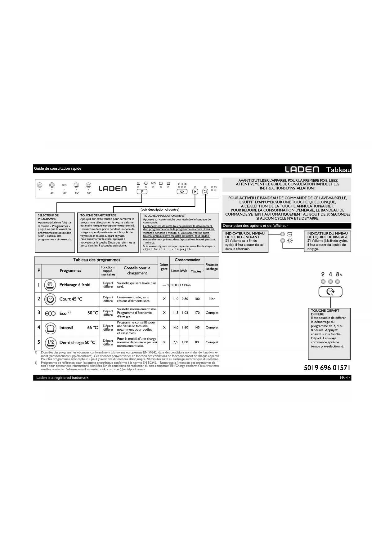 AVANT D'UTILISER L'APPAREIL POUR LA PREMIERE FOIS, LISEZ ATTENTIVEMENT CE GUIDE DE CONSULTATION RAPIDE ET LES INSTRUCTIONS D'INSTALLATION ! POUR ACTIVER LE BANDEAU DE COMMANDE DE CE LAVE-VAISSELLE, IL SUFFIT D'APPUYER SUR UNE TOUCHE QUELCONQUE, A L'EXCEPTION DE LA TOUCHE ANNULATION/ARRET. POUR REDUIRE LA CONSOMMATION D'ENERGIE, LE BANDEAU DE COMMANDE S'ETEINT AUTOMATIQUEMENT AU BOUT DE 30 SECONDES SI AUCUN CYCLE N'A ETE DEMARRE. INDICATEUR DU NIVEAU DE SEL REGENERANTS'il s'allume (à la fin du cycle), il faut ajouter du sel dans le réservoir. TOUCHE DEPART DIFFEREIl est possible de différer le démarrage du programme de 2, 4 ou 8heures. Appuyez ensuite sur la touche Départ. Le lavage commence après le temps pré-sélectionné.INDICATEUR DU NIVEAU DE LIQUIDE DE RINÇAGES'il s'allume (à la fin du cycle), il faut ajouter du liquide de rinçage. Description des options et de l'afficheur Guide de consultation rapideFR -2- Première utilisation