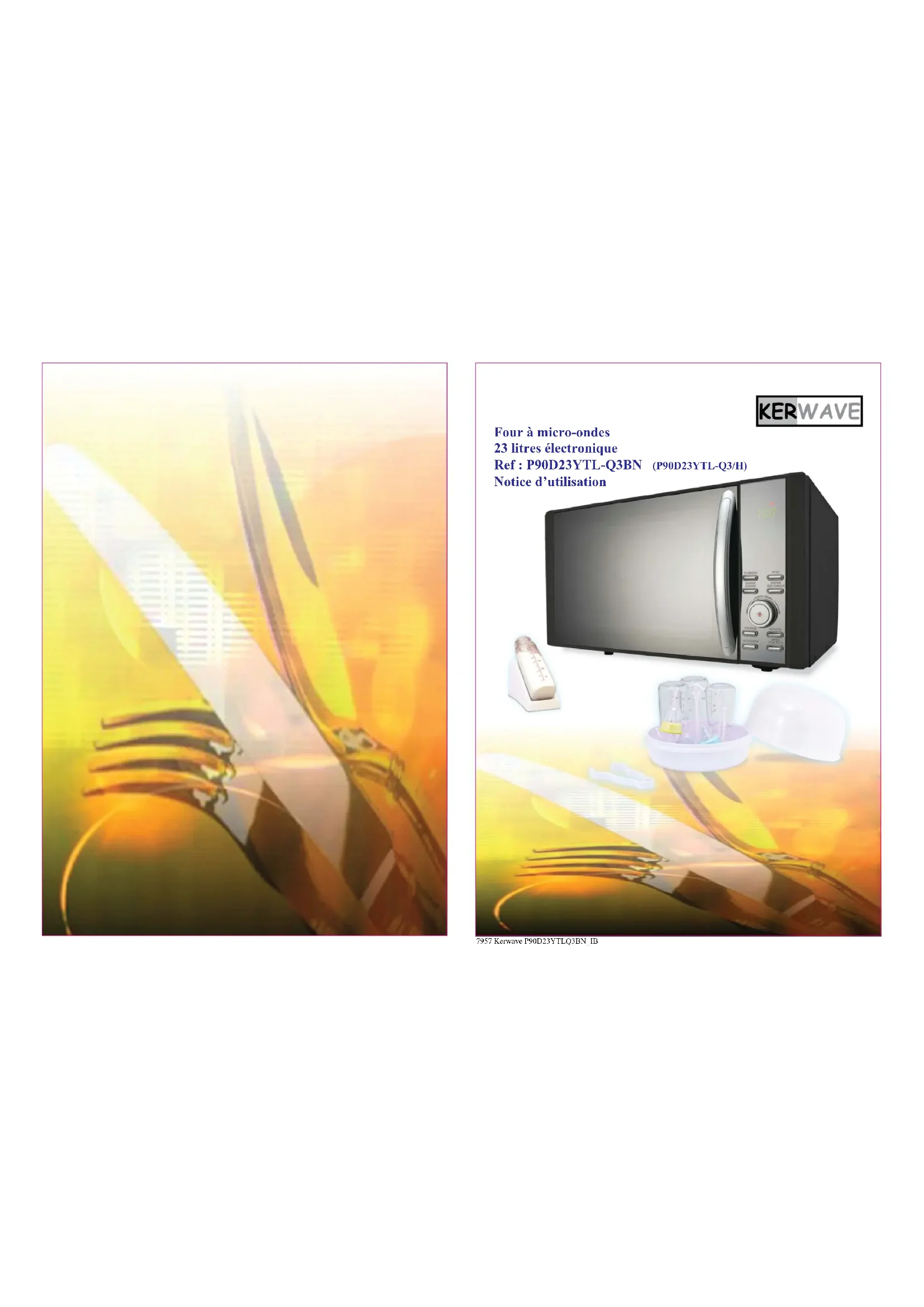 nUSTENSILES : Utilisez des récipients en verre ou en céramique. Pour des temps de cuisson courts, des récipients en plastique ou carton peuvent être utilisés, ainsi que des plats surgelés sous lm plastique, sous réserve que ces lms aient été percés avec une fourchette au préalable pour permettre à la vapeur de s’échapper. N’utilisez que des ustensiles appropriés à l’usage des fours micro-ondes. Tout ustensile métallique est à proscrire. En effet, les objets métalliques provoquent des étincelles ou des ashs qui peuvent conduire à de sérieux dommages sur votre appareil. Ne pas mettre les aliments dans des boîtes ou sous papier aluminium. Ne pas utiliser de récipients en bois, ils pourraient se consumer. Ne pas utiliser de vaisselle en métal, fonte ou en faïence ayant des parties même minimes en métal (y compris argent ou or), votre appareil pourrait être endommagé. De manière générale, ne jamais mettre de récipients fermés qui peuvent exploser par la chaleur si le couvercle n’est pas retiré ou par absence d’ouverture. Pendant le chauffage de denrées alimentaires dans des contenants en plastique ou en papier, gardez un œil sur le four en raison de la possibilité d’inammation.7957 Kerwave P90D23YTLQ3BN_IB