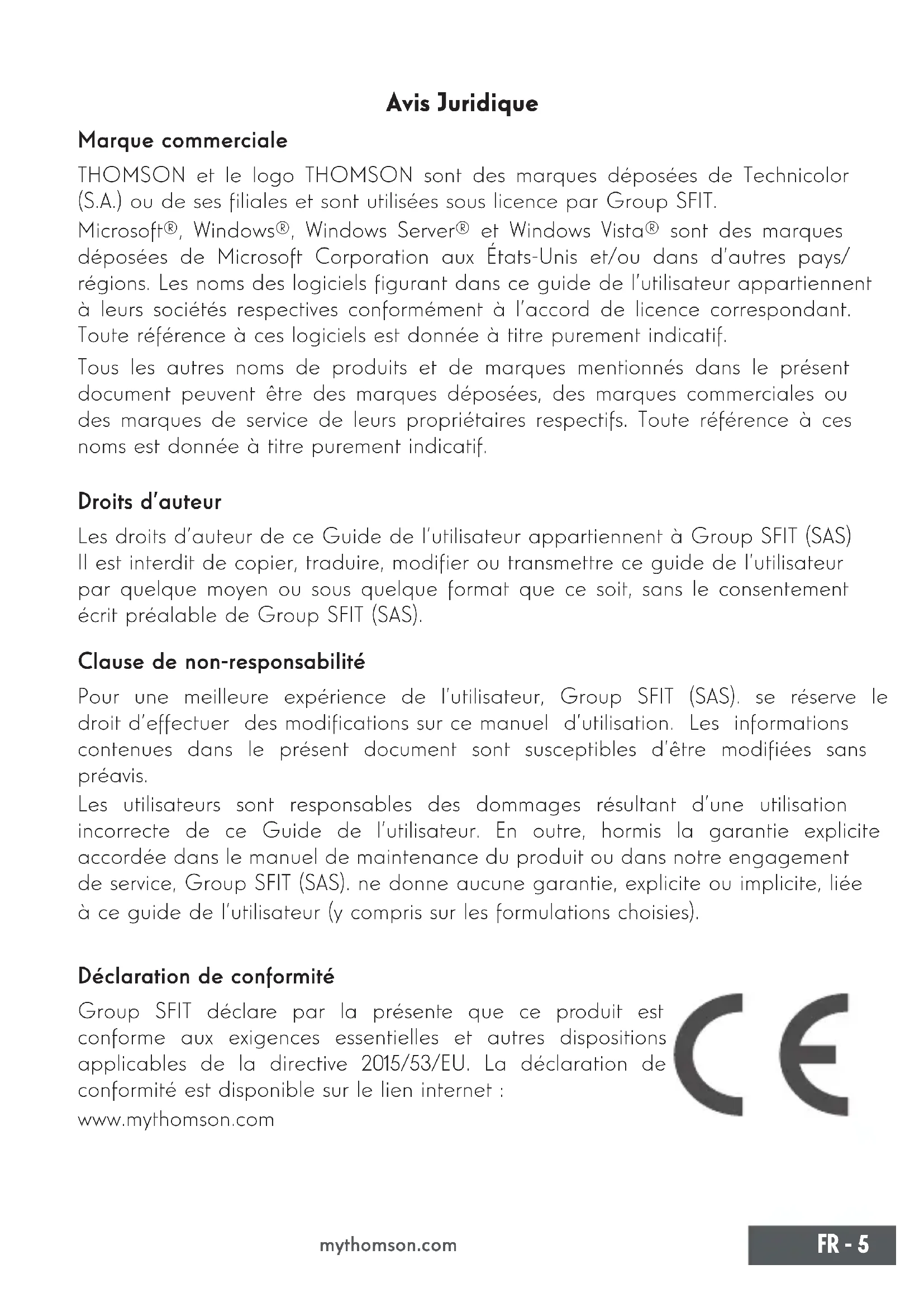 mythomson.com Avis Juridique Marque commerciale THOMSON et le logo THOMSON sont des marques déposées de Technicolor (S.A.) ou de ses liales et sont utilisées sous licence par Group SFIT. Microsoft®, Windows®, Windows Server® et Windows Vista® sont des marques déposées de Microsoft Corporation aux États-Unis et/ou dans d’autres pays/ régions. Les noms des logiciels gurant dans ce guide de l’utilisateur appartiennent à leurs sociétés respectives conformément à l’accord de licence correspondant. Toute référence à ces logiciels est donnée à titre purement indicatif. Tous les autres noms de produits et de marques mentionnés dans le présent document peuvent être des marques déposées, des marques commerciales ou des marques de service de leurs propriétaires respectifs. Toute référence à ces noms est donnée à titre purement indicatif. Droits d’auteur Les droits d’auteur de ce Guide de l’utilisateur appartiennent à Group SFIT (SAS) Il est interdit de copier, traduire, modier ou transmettre ce guide de l’utilisateur par quelque moyen ou sous quelque format que ce soit, sans le consentement écrit préalable de Group SFIT (SAS). Clause de non-responsabilité Pour une meilleure expérience de l’utilisateur, Group SFIT (SAS). se réserve le droit d’effectuer des modications sur ce manuel d’utilisation. Les informations contenues dans le présent document sont susceptibles d’être modiées sans préavis. Les utilisateurs sont responsables des dommages résultant d’une utilisation incorrecte de ce Guide de l’utilisateur. En outre, hormis la garantie explicite accordée dans le manuel de maintenance du produit ou dans notre engagement de service, Group SFIT (SAS). ne donne aucune garantie, explicite ou implicite, liée à ce guide de l’utilisateur (y compris sur les formulations choisies). Déclaration de conformité Group SFIT déclare par la présente que ce produit est conforme aux exigences essentielles et autres dispositions applicables de la directive 2015/53/EU. La déclaration de conformité est disponible sur le lien internet : www.mythomson.com6 - FR Manuel de l’utilisateur - Neo - 10.1’’ mythomson.com - Consignes de sécurité importantes - Cet appareil doit être utilisée dans un environnement dont la température ambiante est comprise entre 5°C (41°F) et 35°C (95°F). Ne pas exposer l’appareil à la pluie ou à l’humidité et le tenir éloigné des liquides. En cas de projection d’eau ou d’un autre liquide sur l’appareil, éteindre immédiatement l’appareil et attendre qu’il soit complétement sec pour le remettre sous tension. N’exposez pas directement l‘appareil aux rayonnements solaires Ne pas utiliser de solvants puissants, de détergents liquides ou autres produits chimiques sur ou à proximité de la surface de la appareil, an d’éviter toute corrosion ou détérioration de la surface de l’appareil. Ne pas exposer l‘appareil à un environnement poussiéreux. Ne pas utiliser l’appareil durant une fuite de gaz. Ne pas exposer l’appareil à des champs magnétiques ou électriques puissants. Vous pouvez faire passer l‘appareil dans les détecteurs à rayons X des aéroports. Cependant, il est recommandé de ne pas faire passer votre appareil via les portiques de détection magnétique ni de l’exposer aux détecteurs portables. Ne placez pas d’objets sur l’appareil. Ne placez pas l‘appareil sur une surface inégale ou instable. Veillez à protéger l’appareil des chutes ou de tout autre choc pouvant l’endommager Ne pas laisser l‘appareil allumée ou en charge sur les genoux ou toutes autre partie du corps an d’éviter tous risques de blessures liées à la chaleur. Eteindre l’appareil avant de le transporter ou de le recouvrir d’une matière ne permettant une circulation de l’air optimale. Ne pas utiliser de cordons d’alimentation, d’accessoires ou d’autres périphériques endommagés avec votre appareil. Nous recommandons l’utilisation exclusive des accessoires (alimentation,FR - 7 mythomson.com câbles…) fournis avec l‘appareil. Utilisez exclusivement des batteries d’origine. Le remplacement de la batterie par une batterie incorrect peut entraîner un risque d’explosion Ne démontez pas, ne modiez pas ou ne réparez pas vous-même l’appareil, sous peine d’annulation de la garantie. Veuillez sauvegarder régulièrement vos contenus importants an d’éviter toute perte de données. Notre société rejette toute responsabilité en cas de perte ou de suppression d’éléments contenus dans l’appareil suite à une utilisation non conforme du matériel ou du logiciel, à un manque d’entretien ou à tout autre évènement accidentel. À pleine puissance, une écoute prolongée peut endommager l’audition de l’utilisateur. Ce produit a été conçu pour permettre un recyclage approprié des pièces et des composants. Le symbole représentant une poubelle à roue barrée indique que l’appareil ne doit pas être mis au rebut avec les déchets municipaux. Consulter les réglementations locales pour la mise au rebut des appareils électroniques. Le symbole représentant une poubelle à roue barrée indique que la batterie ne doit pas être mis au rebut avec les déchets municipaux. Consulter les réglementations locales pour la mise au rebut des batteries.8 - FR Manuel de l’utilisateur - Neo - 10.1’’ mythomson.com - Présentation de l’appareil - Vue de face