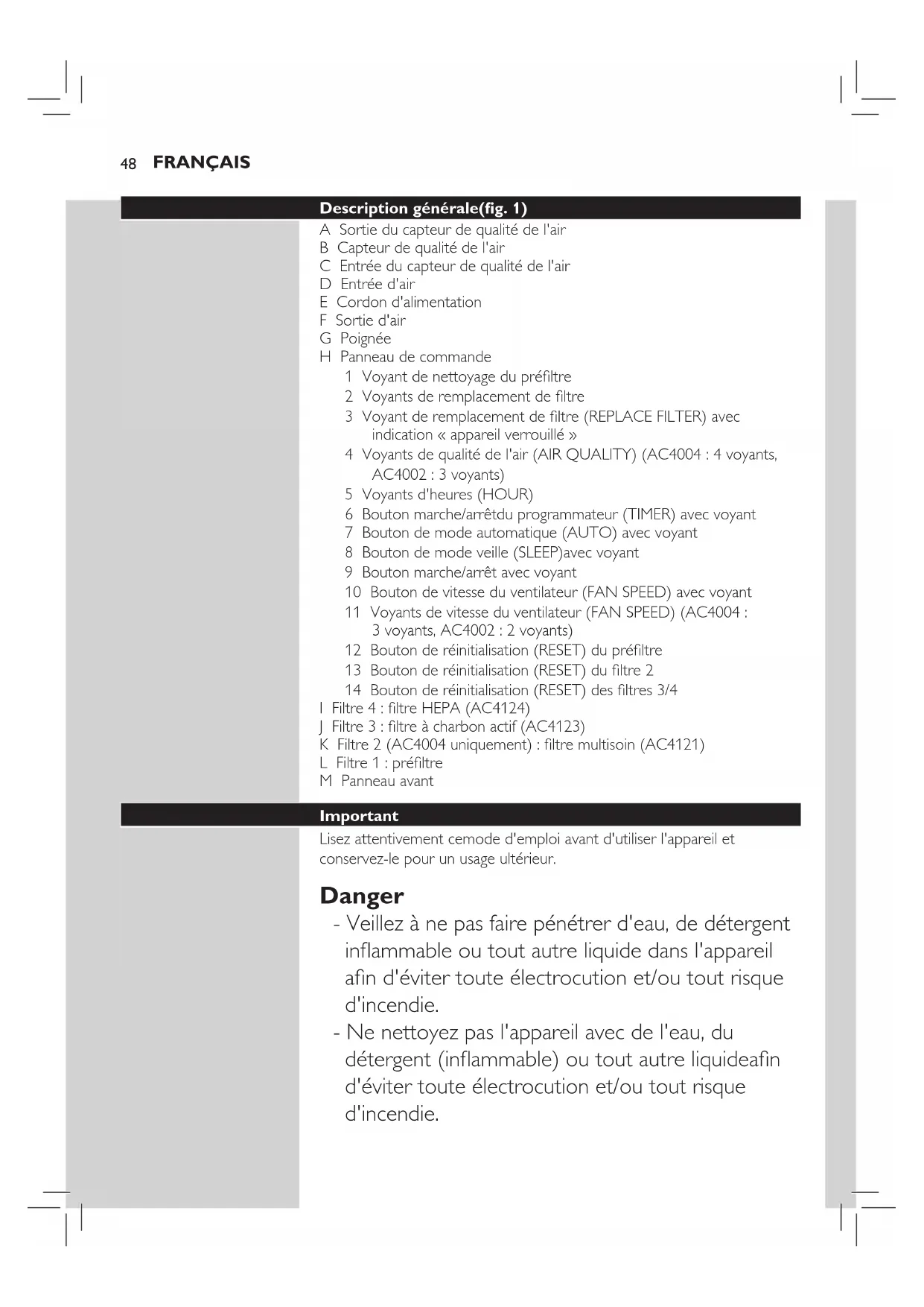FRANÇAIS Description générale(g. 1) A Sortie du capteur de qualité de l'air B Capteur de qualité de l'air C Entrée du capteur de qualité de l'air D Entrée d'air E Cordon d'alimentation F Sortie d'air G Poignée H Panneau de commande 1 Voyant de nettoyage du préltre 2 Voyants de remplacement de ltre 3 Voyant de remplacement de ltre (REPLACE FILTER) avec indication « appareil verrouillé » 4 Voyants de qualité de l'air (AIR QUALITY) (AC4004 : 4 voyants, AC4002 : 3 voyants) 5 Voyants d'heures (HOUR) 6 Bouton marche/arrêtdu programmateur (TIMER) avec voyant 7 Bouton de mode automatique (AUTO) avec voyant 8 Bouton de mode veille (SLEEP)avec voyant 9 Bouton marche/arrêt avec voyant 10 Bouton de vitesse du ventilateur (FAN SPEED) avec voyant 11 Voyants de vitesse du ventilateur (FAN SPEED) (AC4004 : 3 voyants, AC4002 : 2 voyants) 12 Bouton de réinitialisation (RESET) du préltre 13 Bouton de réinitialisation (RESET) du ltre 2 14 Bouton de réinitialisation (RESET) des ltres 3/4 I Filtre 4 : ltre HEPA (AC4124) J Filtre 3 : ltre à charbon actif (AC4123) K Filtre 2 (AC4004 uniquement) : ltre multisoin (AC4121) L Filtre 1 : préltre M Panneau avant Important Lisez attentivement cemode d'emploi avant d'utiliser l'appareil et conservez-le pour un usage ultérieur. Danger - Veillez à ne pas faire pénétrer d'eau, de détergent inammable ou tout autre liquide dans l'appareil an d'éviter toute électrocution et/ou tout risque d'incendie. - Ne nettoyez pas l'appareil avec de l'eau, du détergent (inammable) ou tout autre liquidean d'éviter toute électrocution et/ou tout risque d'incendie.49 FRANÇAIS Avertissement - Avant de brancher l'appareil, vériez que la tension indiquée sur la base correspond à la tension secteur locale. - Si le cordon d'alimentation est endommagé, il doit être remplacé par Philips, par un Centre Service Agréé Philips ou par un technicien qualié an d'éviter tout accident. - N'utilisez jamais l'appareil si la prise, le cordon d'alimentation ou l'appareil lui-même est endommagé. - Cet appareil peut être utilisé par des enfants âgés de 8 ans ou plus, des personnes dont les capacités physiques, sensorielles ou intellectuelles sont réduites ou des personnes manquant d'expérience et de connaissances, à condition que ces enfants ou personnes soient sous surveillance ou qu'ils aient reçu des instructions quant à l'utilisation sécurisée de l'appareil et qu'ils aient pris connaissance des dangers encourus. Les enfants ne doivent pas jouer avec l'appareil. Le nettoyage et l'entretien ne doivent pas être réalisés par des enfants sans surveillance. - Cet appareil n'est pas un jouet. Veillez à ce que les enfants ne puissent pas jouer avec l'appareil. - Ne bloquez pas l'entrée et la sortie d'air (par exemple, en plaçant des objets sur la sortie d'air ou devant l'entrée d'air). Attention - Cet appareil ne remplace pas une ventilation correcte, l'utilisation régulière d'un aspirateur et l'utilisation d'une hotte ou d'un ventilateur dans la cuisine.50 FRANÇAIS - Si la prise murale utilisée pour alimenter l'appareil est en mauvais état, la che de l'appareil risque de surchauffer. Veillez à brancher l'appareil sur une prise murale en bon état de marche. - Placez et utilisez toujours l'appareil sur une surface sèche, stable, plane et horizontale. - Laissez au moins 20 cm d'espace libre derrière et sur les côtés de l'appareil et au moins 30 cm au- dessus de l'appareil. - Ne placez rien sur l'appareil et ne vous asseyez pas sur l'appareil. - Ne placez pas l'appareil directement sous un climatiseur an d'éviter que de la condensations'écoule sur l'appareil. - Avant de mettre l'appareil en marche, assurez-vous que tous les ltres sont correctement assemblés. - Utilisez exclusivement les ltres Philips d'origine spécialement destinés à cet appareil. N'utilisez pas d'autres ltres. - Évitez de heurter l'appareil (l'entrée et la sortie d'air en particulier) avec des objetsdurs. - Soulevez ou déplacez toujours l'appareil à l'aide dela poignée située à l'arrière de l'appareil. - N'insérez pas vos doigts ou des objets dans la sortie d'air. - N'utilisez pas l'appareilaprès avoir utilisé un insecticide ou à proximité de résidus huileux, d'encens se consumant ou de fumées chimiques. - N'utilisez pas l'appareil à proximité d'un appareil fonctionnant au gaz, d'une installation de chauffageou d'une cheminée. - Débranchez toujours l'appareil après utilisation et avant de le nettoyer.51 FRANÇAIS - N'utilisez pas l'appareil dans une pièce soumise à des changements de température importants ; de la condensation pourrait se former à l'intérieur. - Pour éviter les interférences, placezl'appareil à une distance minimale de 2 mètres des appareils électriques qui utilisent des ondes hertziennes (téléviseurs, radios, horloges radiosynchronisées, etc.). - Lorsque le puricateur d'air n'est pas utilisé pendant une longue période, des bactéries peuvent se former sur les ltres. Vériez les ltres après une longue période de non-utilisation.Si les ltres sont très sales, remplacez-les (voir le chapitre « Remplacement des ltres »). - Cet appareil est destiné uniquement à un usage domestique dans des conditions de fonctionnement normales. - N'utilisez jamais l'appareil dans des environnements humides ou soumis à des températures ambiantes élevées (salle de bain, toilettes,cuisine, etc.). - L'appareil n'élimine pasle monoxyde de carbone (CO) ni le radon (Rn). Il ne peut pas être utilisé comme dispositif de sécurité en cas d'accidents impliquant des processus de combustion et des produits chimiques dangereux. Champs électromagnétiques (CEM) Cet appareil Philips est conforme à toutes les normes et à tous les règlements applicables relatifs à l'exposition aux champs électromagnétiques.52 FRANÇAIS Avant la première utilisation Mise en place des ltres L'appareil est fourni avec tousles ltrespréinstallés à l'intér