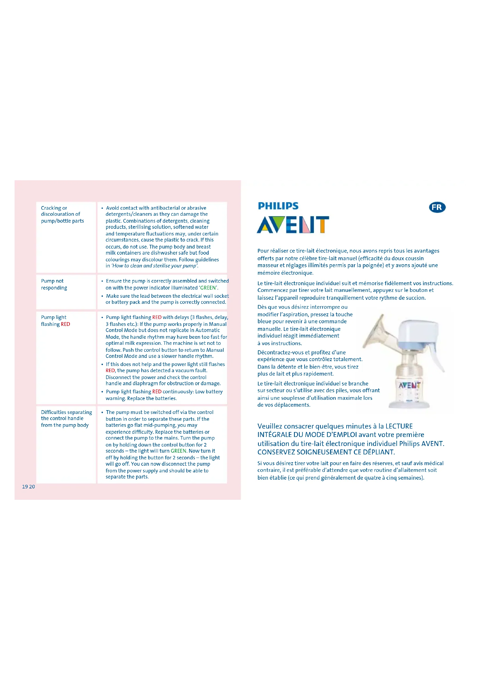 - The pump must be switched off via the control button in order to separate these parts. If the batteries go flat mid-pumping, you may experience difficulty. Replace the batteries or connect the pump to the mains. Turn the pump on by holding down the control button for 2 seconds – the light will turn GREEN. Now turn it off by holding the button for 2 seconds – the light will go off. You can now disconnect the pump from the power supply and should be able to separate the parts. Difficulties separating the control handle from the pump body Pour réaliser ce tire-lait électronique, nous avons repris tous les avantages offerts par notre célèbre tire-lait manuel (efficacité du doux coussin masseur et réglages illimités permis par la poignée) et y avons ajouté une mémoire électronique. Le tire-lait électronique individuel suit et mémorise fidèlement vos instructions. Commencez par tirer votre lait manuellement, appuyez sur le bouton et laissez l’appareil reproduire tranquillement votre rythme de succion. Dès que vous désirez interrompre ou modifier l’aspiration, pressez la touche bleue pour revenir à une commande manuelle. Le tire-lait électronique individuel réagit immédiatement à vos instructions. Décontractez-vous et profitez d’une expérience que vous contrôlez totalement. Dans la détente et le bien-être, vous tirez plus de lait et plus rapidement. Le tire-lait électronique individuel se branche sur secteur ou s’utilise avec des piles, vous offrant ainsi une souplesse d’utilisation maximale lors de vos déplacements. Veuillez consacrer quelques minutes à la LECTURE INTÉGRALE DU MODE D’EMPLOI avant votre première utilisation du tire-lait électronique individuel Philips AVENT. CONSERVEZ SOIGNEUSEMENT CE DÉPLIANT. Si vous désirez tirer votre lait pour en faire des réserves, et sauf avis médical contraire, il est préférable d’attendre que votre routine d’allaitement soit bien établie (ce qui prend généralement de quatre à cinq semaines).