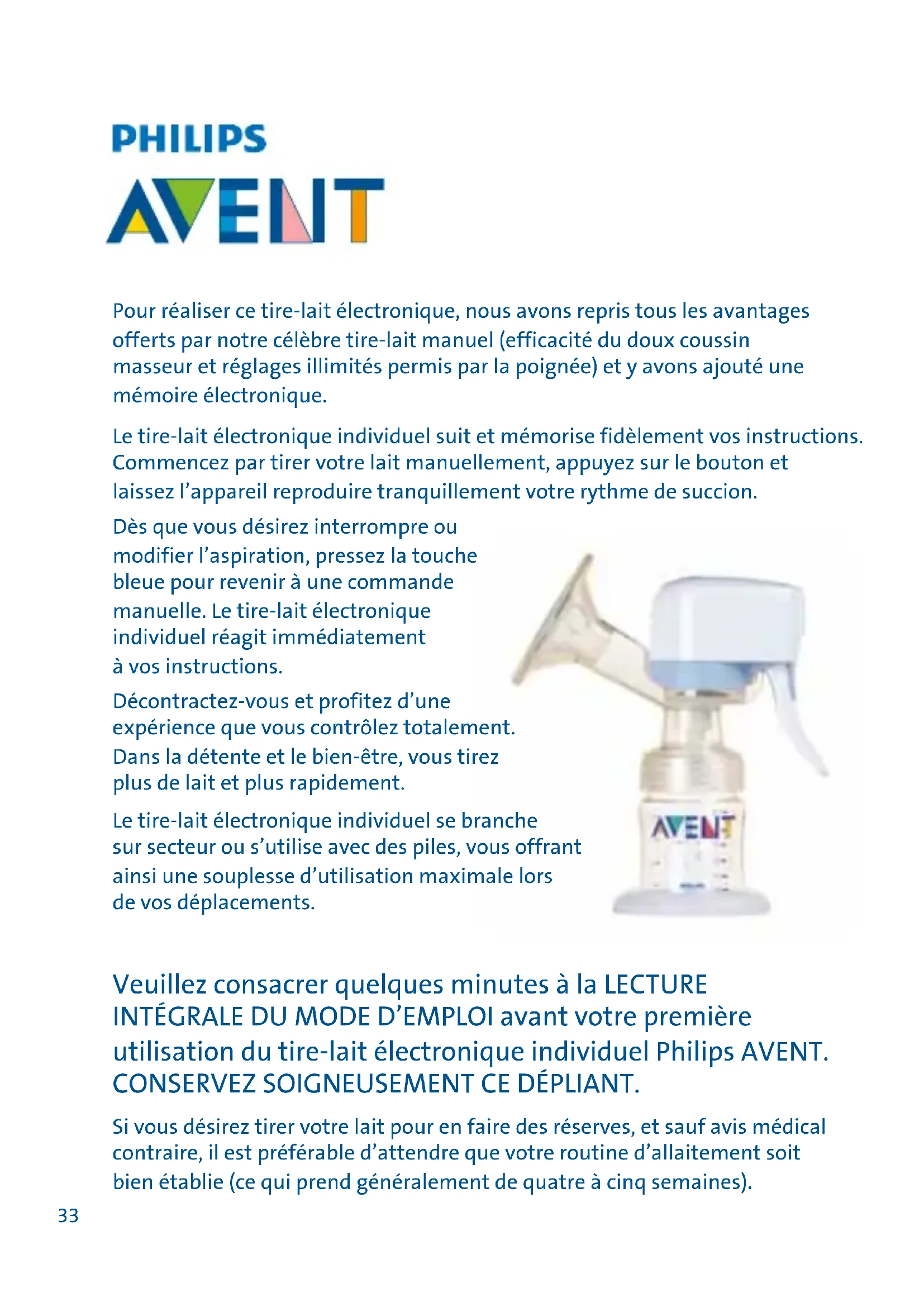 Pour réaliser ce tire-lait électronique, nous avons repris tous les avantages offerts par notre célèbre tire-lait manuel (efficacité du doux coussin masseur et réglages illimités permis par la poignée) et y avons ajouté une mémoire électronique. Le tire-lait électronique individuel suit et mémorise fidèlement vos instructions. Commencez par tirer votre lait manuellement, appuyez sur le bouton et laissez l’appareil reproduire tranquillement votre rythme de succion. Dès que vous désirez interrompre ou modifier l’aspiration, pressez la touche bleue pour revenir à une commande manuelle. Le tire-lait électronique individuel réagit immédiatement à vos instructions. Décontractez-vous et profitez d’une expérience que vous contrôlez totalement. Dans la détente et le bien-être, vous tirez plus de lait et plus rapidement. Le tire-lait électronique individuel se branche sur secteur ou s’utilise avec des piles, vous offrant ainsi une souplesse d’utilisation maximale lors de vos déplacements. Veuillez consacrer quelques minutes à la LECTURE INTÉGRALE DU MODE D’EMPLOI avant votre première utilisation du tire-lait électronique individuel Philips AVENT. CONSERVEZ SOIGNEUSEMENT CE DÉPLIANT. Si vous désirez tirer votre lait pour en faire des réserves, et sauf avis médical contraire, il est préférable d’attendre que votre routine d’allaitement soit bien établie (ce qui prend généralement de quatre à cinq semaines).34 Poignée Couvercle Tire-lait (photos A1) Pièces du tire-lait Poignée de commande* Diaphragme en silicone et tige Valves blanches Entonnoir Biberons de conservation (125ml) Base (comme ) Coussin masseur à alvéoles Couvercle d’entonnoir (comme ) Unité piles
