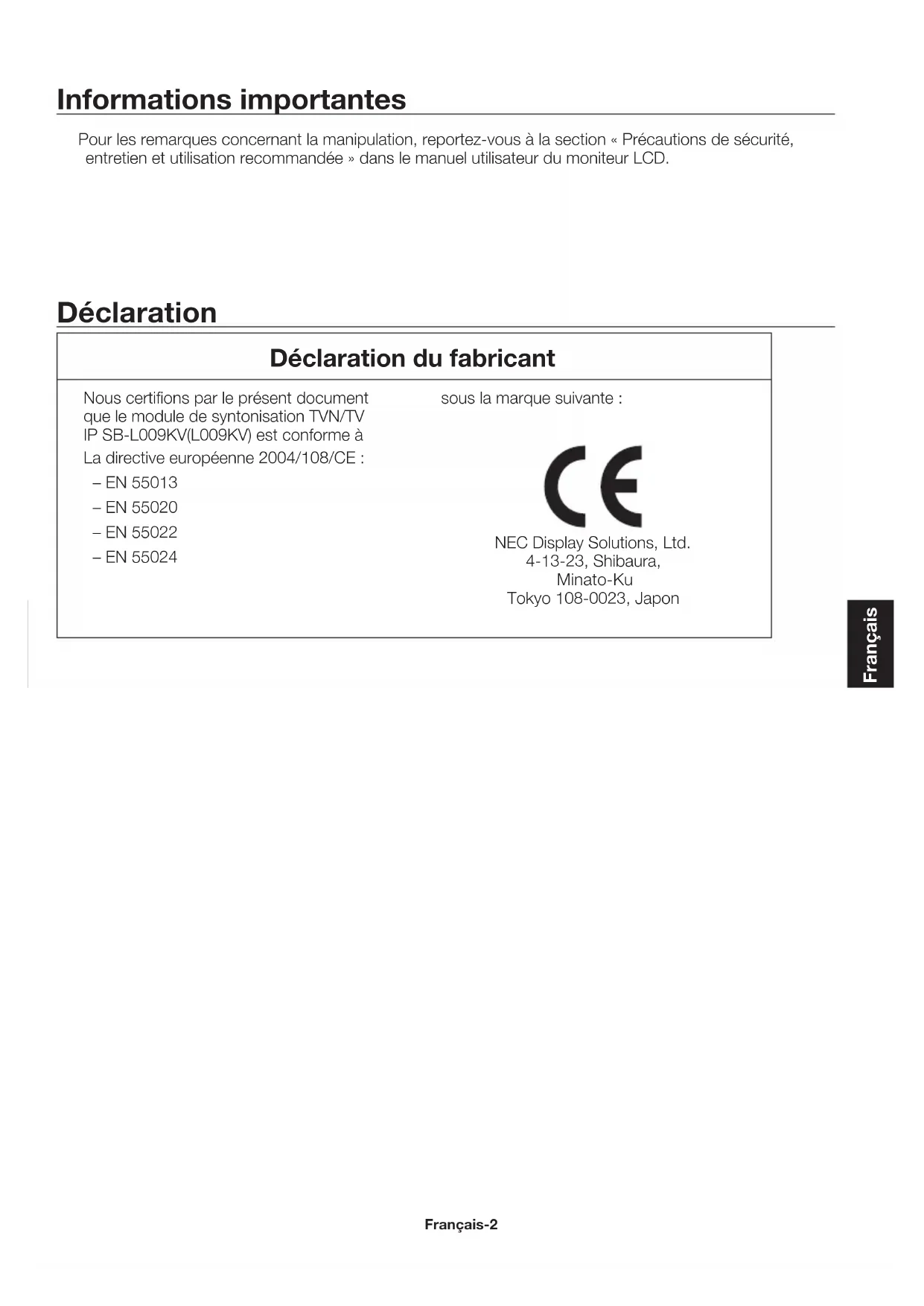 Téléchargez la notice de votre Récepteur TV au format PDF gratuitement ! Retrouvez votre notice SBL009KV - NEC et reprennez votre appareil électronique en main. Sur cette page sont publiés tous les documents nécessaires à l'utilisation de votre appareil SBL009KV de la marque NEC.