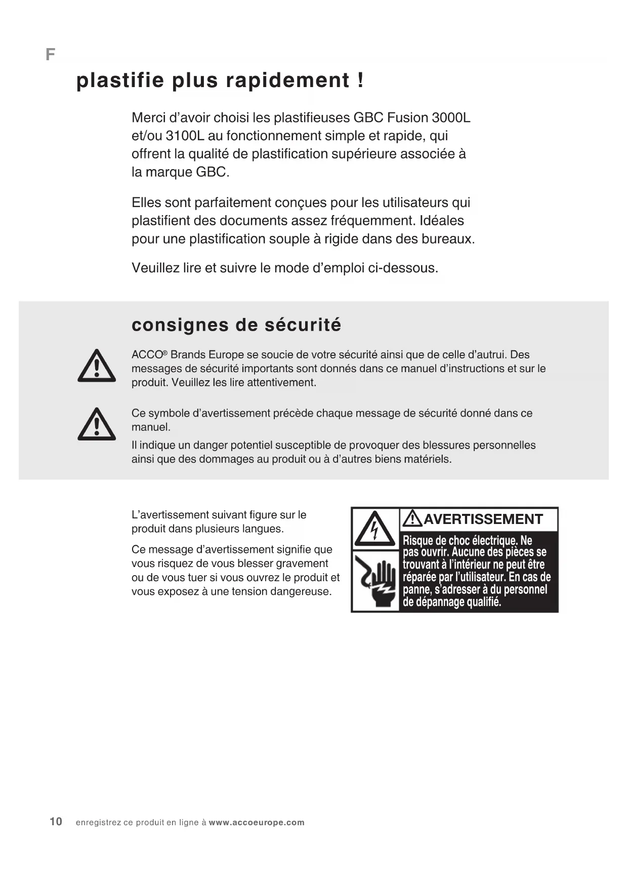 plastifie plus rapidement ! Merci d’avoir choisi les plastieuses GBC Fusion 3000L et/ou 3100L au fonctionnement simple et rapide, qui orent la qualité de plastication supérieure associée à la marque GBC.Elles sont parfaitement conçues pour les utilisateurs qui plastient des documents assez fréquemment. Idéales pour une plastication souple à rigide dans des bureaux.Veuillez lire et suivre le mode d’emploi ci-dessous.Risque de choc électrique. Ne pas ouvrir. Aucune des pièces se trouvant à l’intérieur ne peut être réparée par l’utilisateur. En cas de panne, s’adresser à du personnel de dépannage qualié. AVERTISSEMENT
