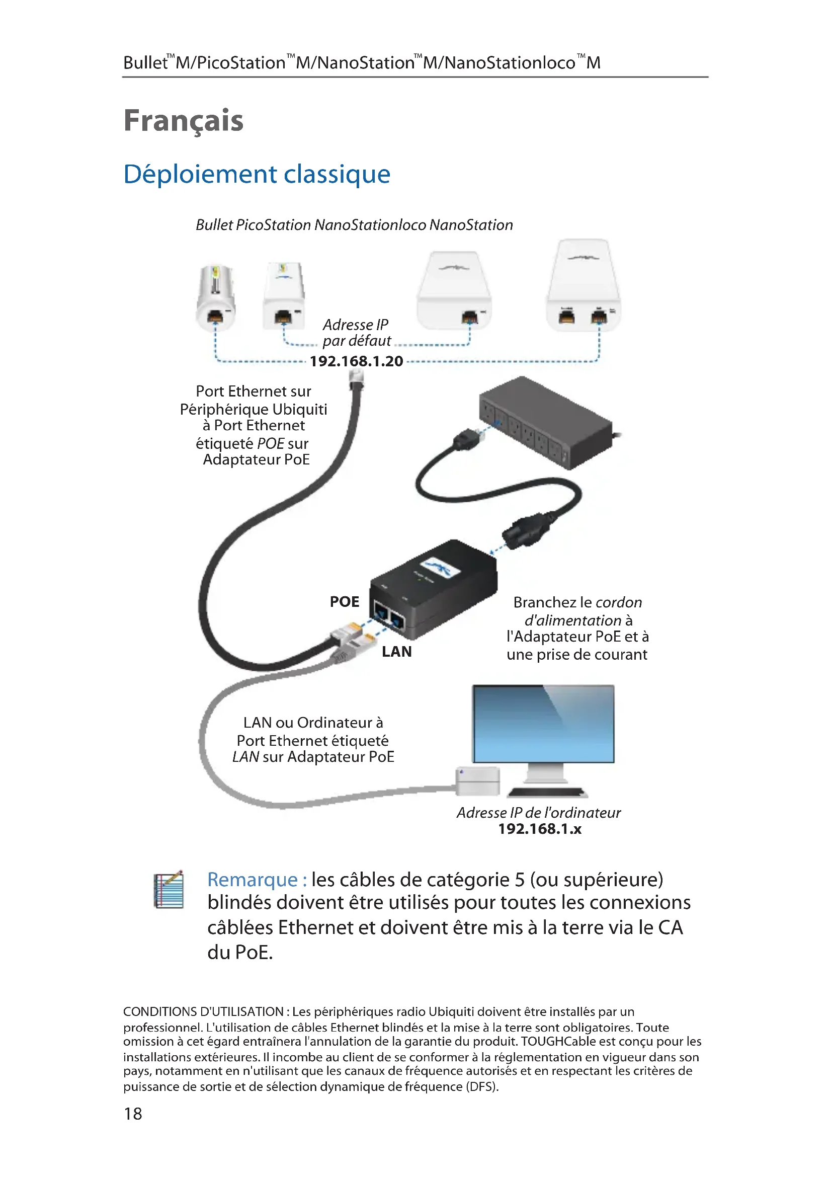 Bullet PicoStation NanoStationloco NanoStation LAN ou Ordinateur à Port Ethernet étiqueté LAN sur Adaptateur PoE Port Ethernet sur Périphérique Ubiquiti à Port Ethernet étiqueté POE sur Adaptateur PoE Branchez le cordon d'alimentation à l'Adaptateur PoE et à une prise de courant POE Adresse IP de l'ordinateur