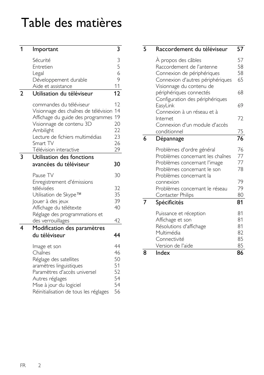 caractéristiques d'affichage - 81 caractéristiques d'alimentation - 81 chaînes - 16 chaînes analogiques, installation - 47 chaînes analogiques, réglage précis - 47 chaînes analogiques, sous-titres - 52 chaînes favorites, liste - 16 accès pour malentendants - 52 accès pour malvoyants - 53 accès universel, activation - 52 accès universel, malentendants - 52 accès universel, malvoyants - 53 aide, à l'écran - 11 aide, version - 85 Ambilight - 22 Ambilight, activation - 22 Ambilight, éclairage d'ambiance - 22 Ambilight, réglages - 22 amplificateur, sélection de la sortie - 70 appareil photo numérique - 63 arrêt programmé - 42 assistant de configuration - 44 chaînes numériques, installation - 47 chaînes numériques, sous-titres - 52 chaînes, changement - 16 chaînes, favorites - 16 chaînes, installation (analogique) - 47 chaînes, installation (automatique) - 46 chaînes, installation (numérique) - 47 chaînes, installation (satellite) - 50 chaînes, logo - 16 chaînes, masquer ou afficher - 16 chaînes, mise à jour - 48 chaînes, modification du nom - 16 chaînes, réglage précis (analogique) - 47 chaînes, réinstaller - 56 chaînes, tri - 16 clavier USB - 67