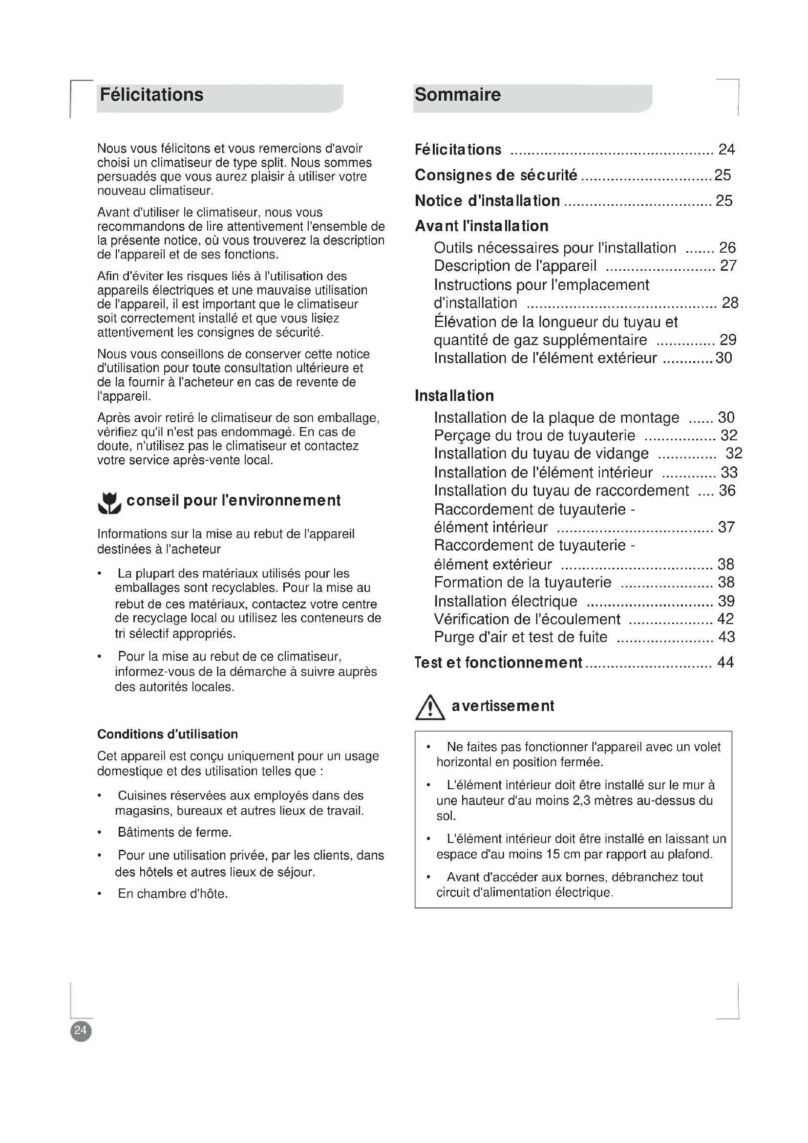 - Test et fonctionnement Ne faites pas fonctionner l'appareil avec un volet horizontal en position fermée. L'élément intérieur doit être installé sur le mur à une hauteur d'au moins 2,3 mètres au-dessus du sol. L'élément intérieur doit être installé en laissant un espace d'au moins 15 cm par rapport au plafond. $YDQWGDFFpGHUDX[ERUQHVGpEUDQFKH]WRXW circuit d'alimentation électrique. Félicitations Nous vous félicitons et vous remercions d'avoir choisi un climatiseur de type split. Nous sommes persuadés que vous aurez plaisir à utiliser votre nouveau climatiseur. Avant d'utiliser le climatiseur, nous vous recommandons de lire attentivement l'ensemble de la présente notice, où vous trouverez la description de l'appareil et de ses fonctions. $¿QGpYLWHUOHVULVTXHVOLpVjOXWLOLVDWLRQGHV appareils électriques et une mauvaise utilisation de l'appareil, il est important que le climatiseur soit correctement installé et que vous lisiez attentivement les consignes de sécurité. Nous vous conseillons de conserver cette notice d'utilisation pour toute consultation ultérieure et de la fournir à l'acheteur en cas de revente de l'appareil. Après avoir retiré le climatiseur de son emballage, YpUL¿H]TXLOQHVWSDVHQGRPPDJp(QFDVGH doute, n'utilisez pas le climatiseur et contactez votre service après-vente local. Informations sur la mise au rebut de l'appareil destinées à l'acheteur /DSOXSDUWGHVPDWpULDX[XWLOLVpVSRXUOHV emballages sont recyclables. Pour la mise au UHEXWGHFHVPDWpULDX[FRQWDFWH]YRWUHFHQWUH de recyclage local ou utilisez les conteneurs de tri sélectif appropriés. Pour la mise au rebut de ce climatiseur, informez-vous de la démarche à suivre auprès des autorités locales. Conditions d'utilisation Cet appareil est conçu uniquement pour un usage domestique et des utilisation telles que : &XLVLQHVUpVHUYpHVDX[HPSOR\pVGDQVGHV p. 44