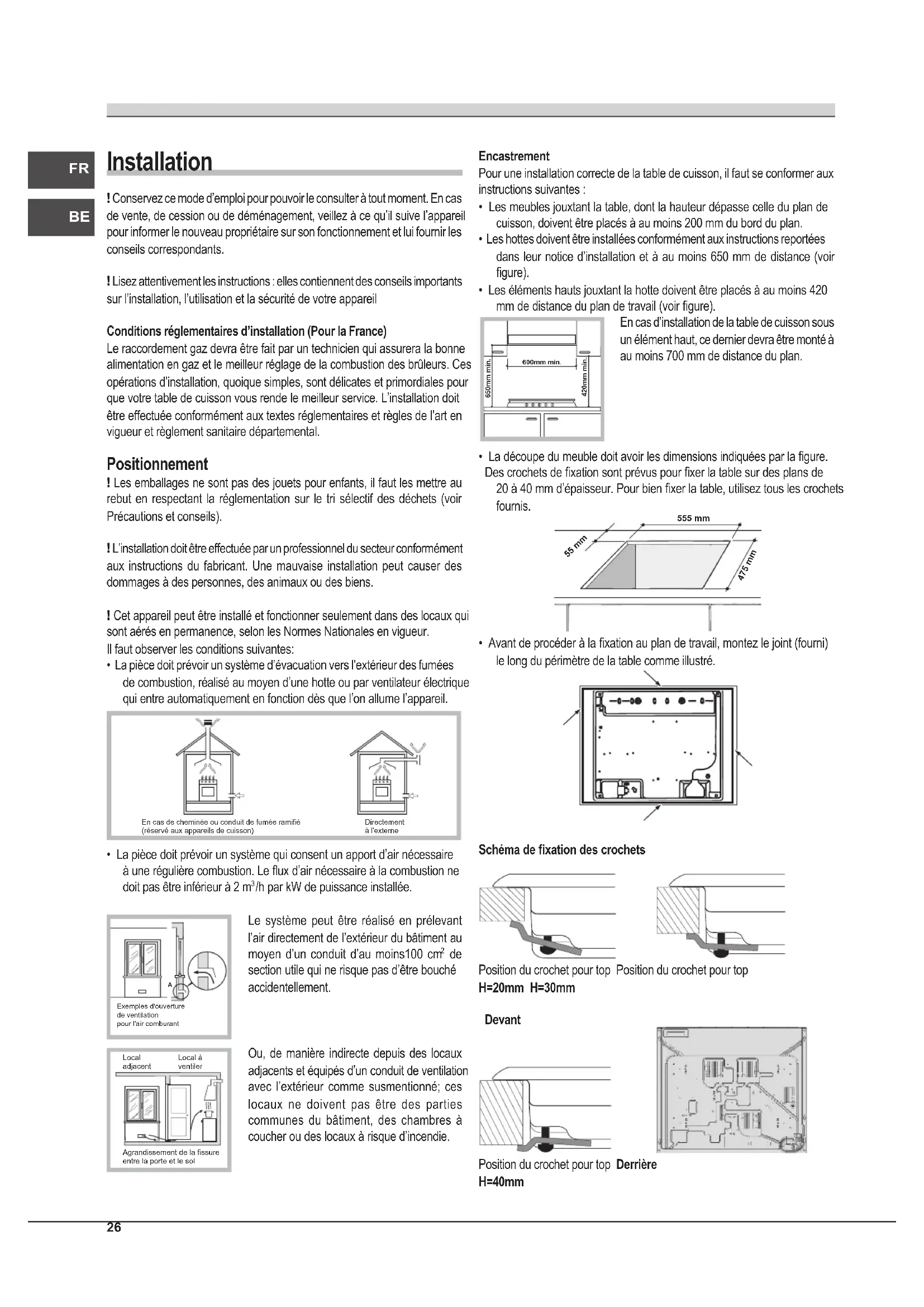 Installation ! Conservez ce mode d’emploi pour pouvoir le consulter à tout moment. En cas de vente, de cession ou de déménagement, veillez à ce qu’il suive l’appareil pour informer le nouveau propriétaire sur son fonctionnement et lui fournir les conseils correspondants. ! Lisez attentivement les instructions : elles contiennent des conseils importants sur l’installation, l’utilisation et la sécurité de votre appareil Conditions réglementaires d’installation (Pour la France) Le raccordement gaz devra être fait par un technicien qui assurera la bonne alimentation en gaz et le meilleur réglage de la combustion des brûleurs. Ces opérations d’installation, quoique simples, sont délicates et primordiales pour que votre table de cuisson vous rende le meilleur service. L’installation doit être effectuée conformément aux textes réglementaires et règles de l’art en vigueur et règlement sanitaire départemental. Positionnement ! Les emballages ne sont pas des jouets pour enfants, il faut les mettre au rebut en respectant la réglementation sur le tri sélectif des déchets (voir Précautions et conseils). ! L’installation doit être effectuée par un professionnel du secteur conformément aux instructions du fabricant. Une mauvaise installation peut causer des dommages à des personnes, des animaux ou des biens. ! Cet appareil peut être installé et fonctionner seulement dans des locaux qui sont aérés en permanence, selon les Normes Nationales en vigueur. Il faut observer les conditions suivantes: