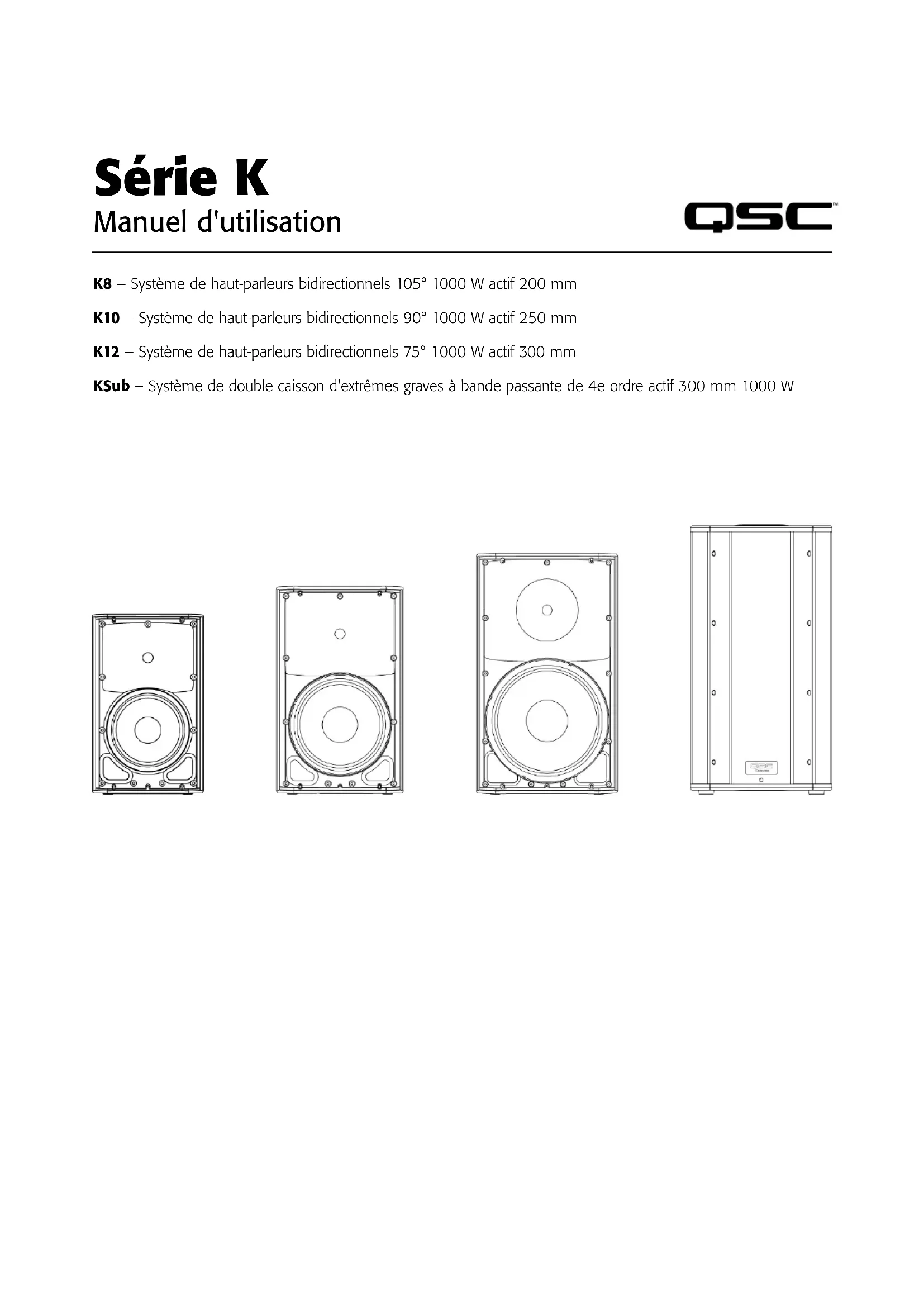 KSub COVER Caractéristiques techniques20 FRE FRE © Copyright 2009 – 2011, QSC Audio Products, LLC., US D591724, US D609216, brevet mondial en instance QSC™ est une marque déposée de QSC Audio Products, LLC. QSC et le logo QSC sont des marques déposées auprès de l’U.S. Patent and Trademark Office. Tilt-Direct, Intrinsic Correction, DEEP et GuardRail sont toutes des marques de QSC Audio Products, LLC. Toutes les marques de commerce appartiennent à leur propriétaire respectif. Adresse postale : QSC Audio Products, LLC 1675 MacArthur Boulevard Costa Mesa, CA 92626-1468, États-Unis Téléphone : Standard : 714-754-6175 Ventes & Marketing : 714-957-7100 ou numéro vert (États-Unis seulement) 800-854-4079 Service clientèle : 714-957-7150 ou numéro vert (États-Unis seulement) 800-772-2834 Télécopieur : Ventes & Marketing : 714-754-6174 Service clientèle : 714-754-6173 Site Web : qscaudio.com E-mail : info@qscaudio.com service@qscaudio.com K Series User Manual French 07/21/11K Serie Benutzerhandbuch K8 – Aktives 105°-, 1000-W-Zwei-Wege-Lautsprechersystem," 8-Zoll-(200-mm-)Modell K10 – Aktives 90°-, 1000-W-Zwei-Wege-Lautsprechersystem," 10-Zoll-(250-mm-)Modell K12 – Aktives 75°-, 1000-W-Zwei-Wege-Lautsprechersystem," 12-Zoll-(300-mm-)Modell KSub – Aktives 1000-W-Subwoofersystem, zweimal 12 Zoll (300 mm)," mit Bandpass vierter Ordnung2 GER GER