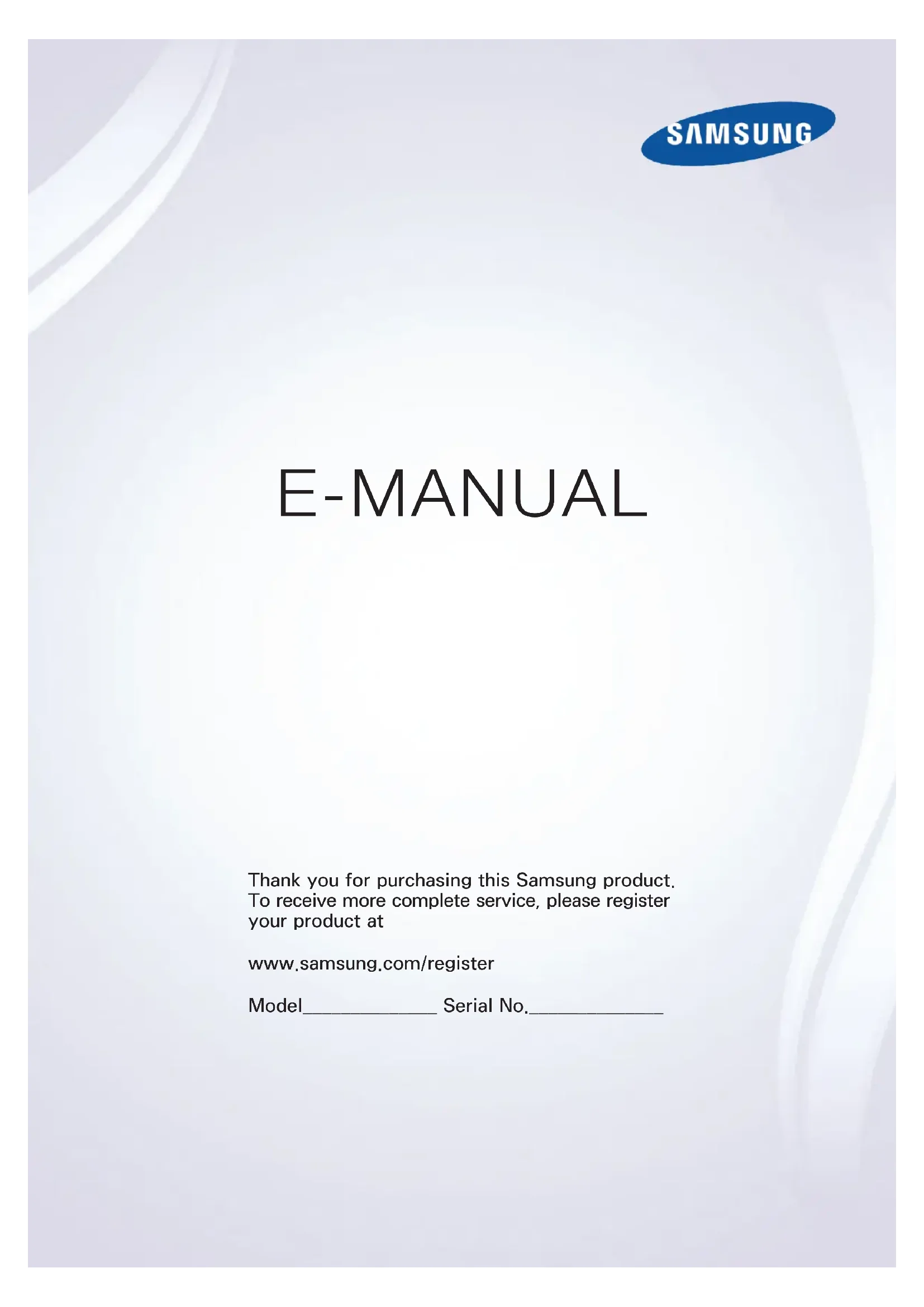 E-MANUAL Thank you for purchasing this Samsung product. To receive more complete service, please register your product at www.samsung.com/register Model______________ Serial No.______________Contents Guides de démarrage Utilisation de Smart Hub 1 Connexion à Internet 1 Configuration de Smart Hub 1 Utilisation de Smart Hub Commande vocale du téléviseur 2 Configuration de Reconnaissance vocale 3 Commande vocale du téléviseur Commande par mouvement du téléviseur 4 Configuration de Commande par mouv. 5 Contrôle du téléviseur à l'aide de gestes Utilisation du Samsung Smart Control 6 Utilisation du téléviseur avec le bouton POINTER 7 Configuration du Samsung Smart Control 7 Pairage du téléviseur au Samsung Smart Control Amélioration de l'expérience visuelle des événements sportifs 8 Activation de la fonction Mode Sport Modification des chaînes 9 Activation de la fonction Modifier la chaîne 9 Réorganisation ou suppression de chaînes Lecture de plusieurs écrans Connexions Raccordement d'une antenne (Antenne) Connexion à Internet 12 Mise en place d'une connexion câblée à Internet 13 Mise en place d'une connexion sans fil à Internet Connexion à un réseau au moyen d'un dongle mobile Résolution des problèmes de connectivité Internet 16 Résolution des problèmes de connectivité Internet câblée 17 Résolution des problèmes de connectivité Internet sans fil Connexion de périphériques vidéo 18 Connexion à l'aide d'un câble HDMI 19 Connexion à l'aide d'un câble composant 20 Connexion à l'aide d'un câble composite (A/V) Connexions d'entrée et de sortie audio 21 Connexion à l'aide d'un câble HDMI (ARC) 22 Connexion à l'aide d'un câble audio numérique (optique) 22 Branchement d'un casque Connexion à un ordinateur 23 Connexion via le port HDMI 24 Connexion à l'aide d'un câble HDMI vers DVI 24 Connexion via votre réseau domestique Connexion d'un périphérique mobile 25 Connexion à l'aide d'un câble MHL vers HDMI 26 Utilisation de Réplication de l'écran 27 Connexion de périphériques mobiles sans routeur sans fil (Wi-Fi Direct) 28 Connexion d'un périphérique mobile via Samsung Smart View 2.0 Pairage d'un ordinateur portable et du téléviseur - Mise en miroir de PC sans fil (ou KINO TV) Modification du signal d'entrée avec des périphériques externes Remarques sur la connexion 30 Remarque sur la connexion HDMI 31 Remarque sur la connexion des périphériques audio 31 Remarque sur la connexion des ordinateurs 32 Remarque sur la connexion des périphériques mobiles 32 Remarques concernant la connexion pour la mise en miroir de PC sans fil (ou KINO TV) Télécommande et périphériques À propos du Samsung Smart Control Utilisation du Samsung Smart Control 35 Utilisation du téléviseur avec le bouton POINTER 35 Utilisation du téléviseur avec les touches de direction et le bouton Entrer 36 Affichage et utilisation de la télécommande visuelle 37 Pairage du téléviseur au Samsung Smart Control IICommande des périphériques externes à l'aide de la télécommande du téléviseur - Utilisation de la télécommande universelle 38 Réglage de la télécommande universelle Commande du téléviseur à l'aide d'un clavier 39 Connexion d'un clavier 40 Utilisation du clavier Commande du téléviseur à l'aide d'une souris 41 Connexion d'une souris USB 41 Utilisation d'une souris Connexion d'une manette Bluetooth Saisie de texte à l'aide du clavier QWERTY à l'écran 42 Utilisation des autres fonctions Fonctions Smart Affichage de plusieurs écrans ou fonctions avec Multi-Link Screen 43 Utilisation de Multi-Link Screen Smart Hub 45 Supprimer ou épingler un élément dans le groupe Récente 45 Lancement automatique de Smart Hub 45 Test des connexions Smart Hub 46 Utilisation du didacticiel Smart Hub 46 Réinitialisation de Smart Hub Utilisation de Smart Hub avec un Compte Samsung 47 Création d'un compte Samsung 48 Ouverture d'un compte Samsung 48 Association de votre compte Samsung à vos comptes de services externes 49 Modification et ajout d'informations à un compte Samsung 49 Suppression d'un compte Samsung du téléviseur Utilisation du service GAMES 50 Gestion des jeux via le menu contextuel Options 50 Affichage de l'écran d'informations détaillées 51 Installation et exécution d'un jeu 51 Gestion des jeux téléchargés ou achetés Utilisation du service Mes Applications 53 Gestion des applications téléchargées avec le menu contextuel Options 54 Installation d'une application 54 Activation des mises à jour automatiques des applications 54 Suppression d'une application du téléviseur 55 Déplacement des applications 55 Verrouillage et déverrouillage des applications 55 Mise à jour des applications 55 Réorganisation des applications 55 Notation des applications achetées 55 Utilisation des autres caractéristiques et fonctions de l'application Utilisation de l'e-Manual 56 Lancement du manuel électronique 56 Utilisation des boutons du manuel électronique Utilisation du navigateur Web. 57 Préférences de navigation Utilisation du service MON CONTENU 58 À lire avant de lire du contenu multimédia 59 Lecture de contenu multimédia sur un ordinateur ou un périphérique mobile 59 Lecture de contenu multimédia enregistré sur un périphérique USB 60 Boutons et fonctions disponibles pendant le visionnage de photos 62 Boutons et fonctions disponibles pendant le visionnage de vidéos 64 Boutons et fonctions disponibles pendant la lecture de musique 65 Écoute de musique en qualité HD 65 Fonctions de l'écran de liste de contenu multimédia Utilisation du service NewsON 66 Actualités 66 Météo Commande vocale du téléviseur 68 À lire avant d'utiliser la fonction de reconnaissance vocale 68 Apprentissage des principes de base de la reconnaissance vocale 69 Utilisation de la reconnaissance vocale impérative 69 Utilisation de la reconnaissance vocale interactive à une courte distance 69 Utilisation du didacticiel de reconnaissance 