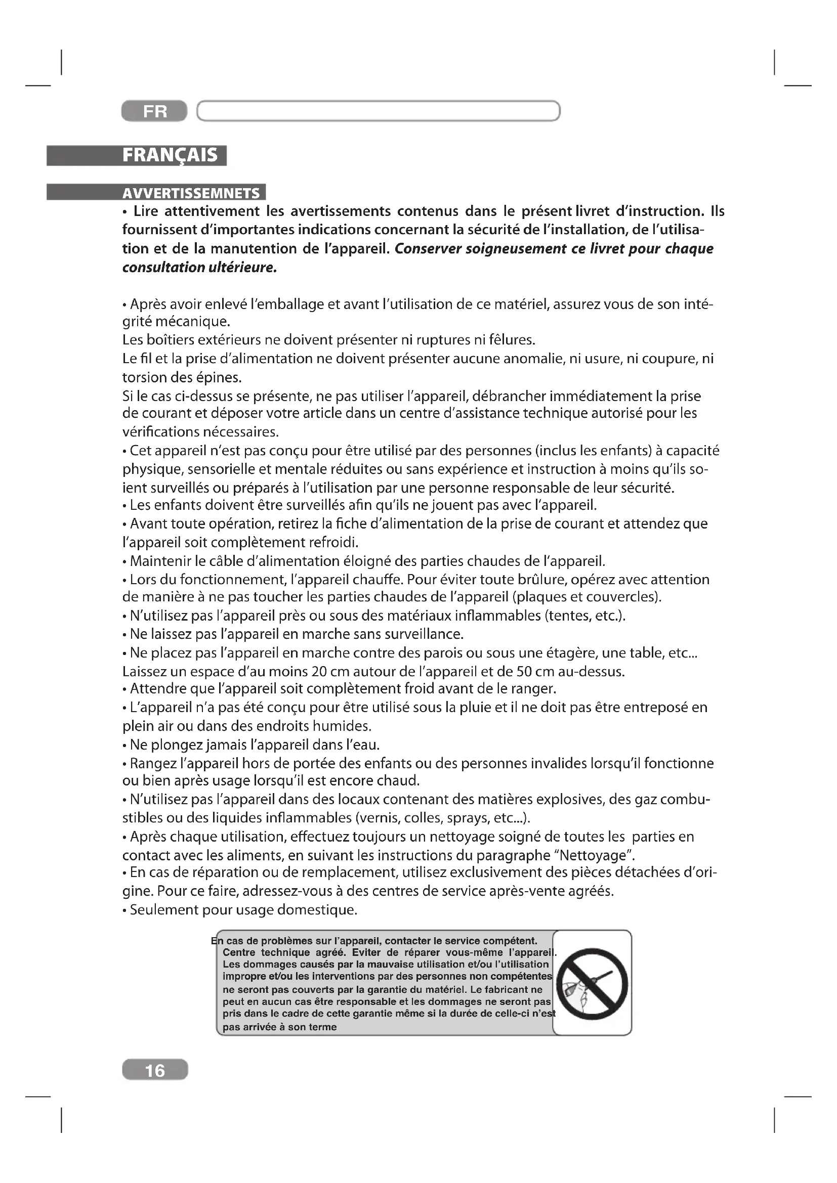 - Seulement pour usage domestique. En cas de problèmes sur l’appareil, contacter le service compétent. Centre technique agréé. Eviter de réparer vous-même l’appareil. Les dommages causés par la mauvaise utilisation et/ou l’utilisation impropre et/ou les interventions par des personnes non compétentes ne seront pas couverts par la garantie du matériel. Le fabricant ne peut en aucun cas être responsable et les dommages ne seront pas pris dans le cadre de cette garantie même si la durée de celle-ci n’est pas arrivée à son terme