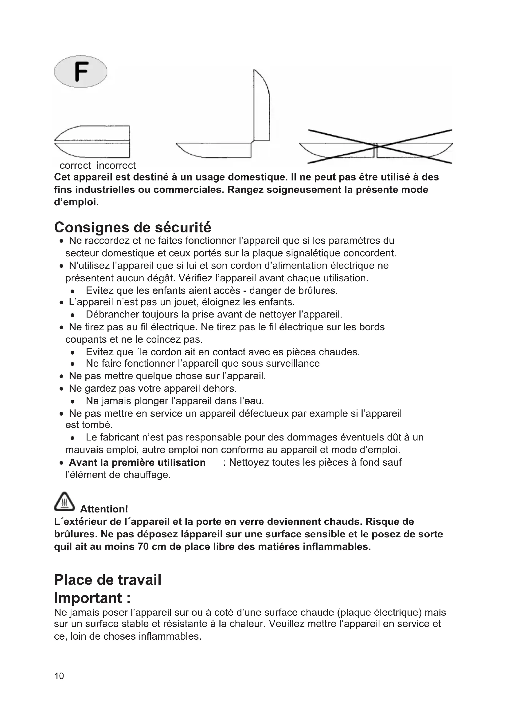 - Avant la première utilisation : Nettoyez toutes les pièces à fond sauf l’élément de chauffage. Attention! L´extérieur de l´appareil et la porte en verre deviennent chauds. Risque de brûlures. Ne pas déposez láppareil sur une surface sensible et le posez de sorte quíl ait au moins 70 cm de place libre des matiéres inflammables. Place de travail Important : Ne jamais poser l’appareil sur ou à coté d’une surface chaude (plaque électrique) mais sur un surface stable et résistante à la chaleur. Veuillez mettre l‘appareil en service et ce, loin de choses inflammables.11 Avant la première utilisation Graissez légèrement les plaques du grill. Préchauffez ensuite l’appareil avec les plaques fermées pendant 10 minutes sur température maximale. Passez avec un chiffon humide sur les plaques. N’utilisez pas des détergents agressifs car ceux-ci pourraient endommager la surface anti-adhésive. Préparation de plats