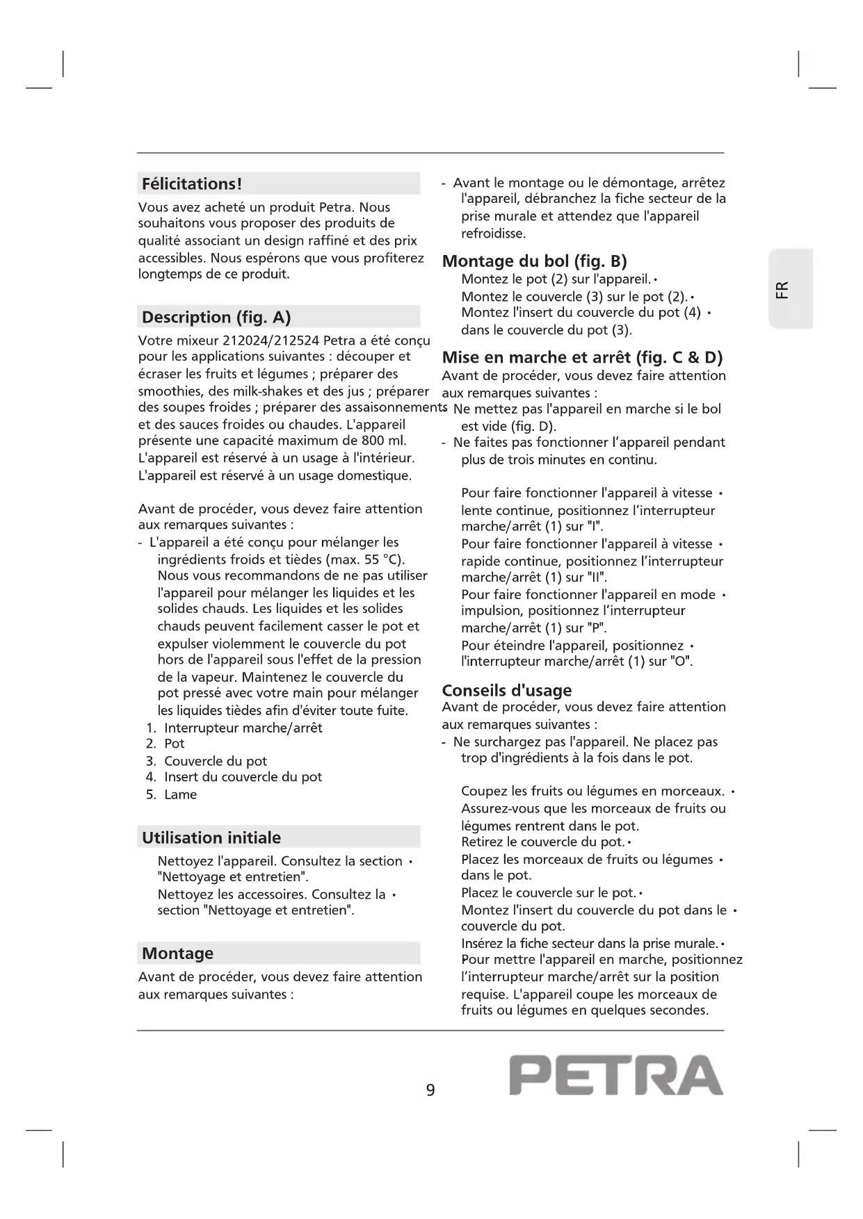 Félicitations! Vous avez acheté un produit Petra. Nous souhaitons vous proposer des produits de qualité associant un design raffiné et des prix accessibles. Nous espérons que vous profiterez longtemps de ce produit. Description (fig. A) Votre mixeur 212024/212524 Petra a été conçu pour les applications suivantes : découper et écraser les fruits et légumes ; préparer des smoothies, des milk-shakes et des jus ; préparer des soupes froides ; préparer des assaisonnements et des sauces froides ou chaudes. L'appareil présente une capacité maximum de 800 ml. L'appareil est réservé à un usage à l'intérieur. L'appareil est réservé à un usage domestique. Avant de procéder, vous devez faire attention aux remarques suivantes : - L'appareil a été conçu pour mélanger les ingrédients froids et tièdes (max. 55 °C). Nous vous recommandons de ne pas utiliser l'appareil pour mélanger les liquides et les solides chauds. Les liquides et les solides chauds peuvent facilement casser le pot et expulser violemment le couvercle du pot hors de l'appareil sous l'effet de la pression de la vapeur. Maintenez le couvercle du pot pressé avec votre main pour mélanger les liquides tièdes afin d'éviter toute fuite.