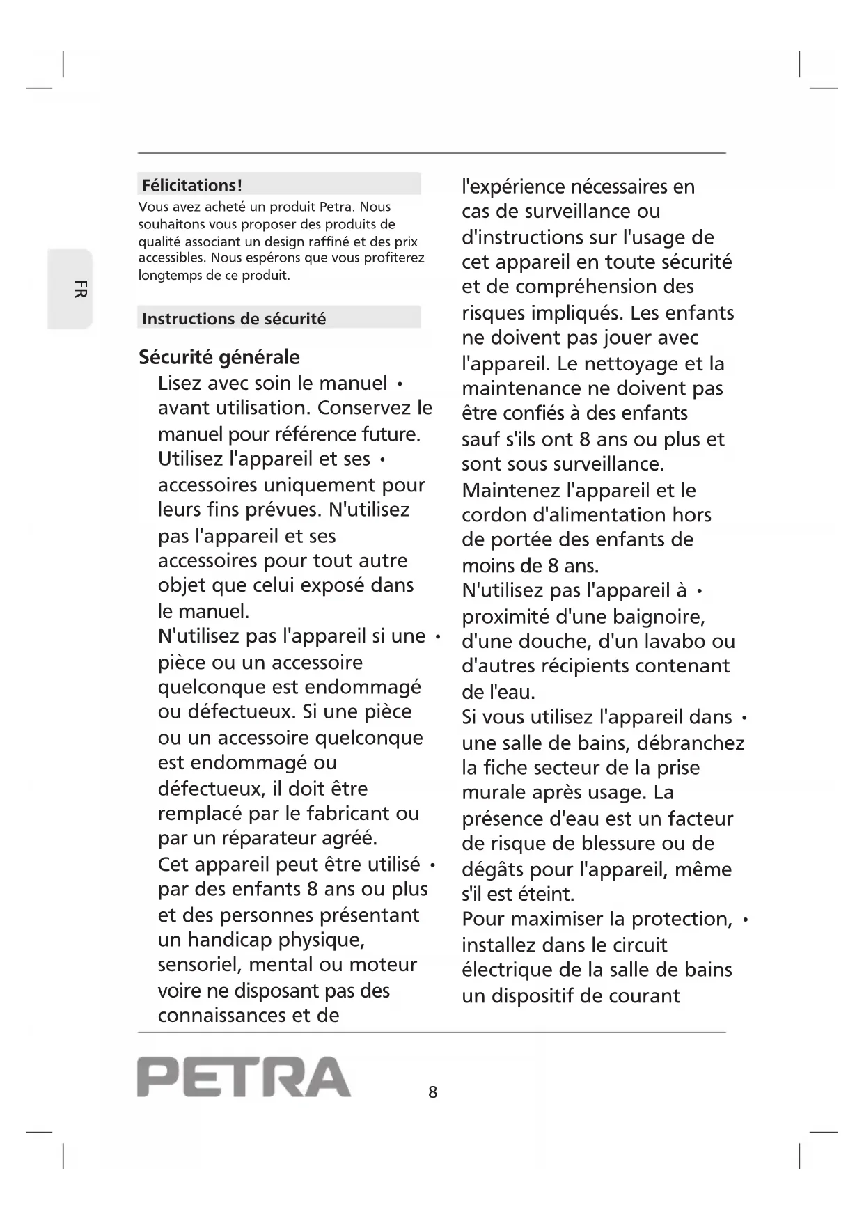 Félicitations! Vous avez acheté un produit Petra. Nous souhaitons vous proposer des produits de qualité associant un design raffiné et des prix accessibles. Nous espérons que vous profiterez longtemps de ce produit. Instructions de sécurité Sécurité générale Lisez avec soin le manuel • avant utilisation. Conservez le manuel pour référence future. Utilisez l'appareil et ses • accessoires uniquement pour leurs fins prévues. N'utilisez pas l'appareil et ses accessoires pour tout autre objet que celui exposé dans le manuel. N'utilisez pas l'appareil si une • pièce ou un accessoire quelconque est endommagé ou défectueux. Si une pièce ou un accessoire quelconque est endommagé ou défectueux, il doit être remplacé par le fabricant ou par un réparateur agréé. Cet appareil peut être utilisé • par des enfants 8 ans ou plus et des personnes présentant un handicap physique, sensoriel, mental ou moteur voire ne disposant pas des connaissances et de l'expérience nécessaires en cas de surveillance ou d'instructions sur l'usage de cet appareil en toute sécurité et de compréhension des risques impliqués. Les enfants ne doivent pas jouer avec l'appareil. Le nettoyage et la maintenance ne doivent pas être confiés à des enfants sauf s'ils ont 8 ans ou plus et sont sous surveillance. Maintenez l'appareil et le cordon d'alimentation hors de portée des enfants de moins de 8 ans. N'utilisez pas l'appareil à • proximité d'une baignoire, d'une douche, d'un lavabo ou d'autres récipients contenant de l'eau. Si vous utilisez l'appareil dans • une salle de bains, débranchez la fiche secteur de la prise murale après usage. La présence d'eau est un facteur de risque de blessure ou de dégâts pour l'appareil, même s'il est éteint. Pour maximiser la protection, • installez dans le circuit électrique de la salle de bains un dispositif de courant9