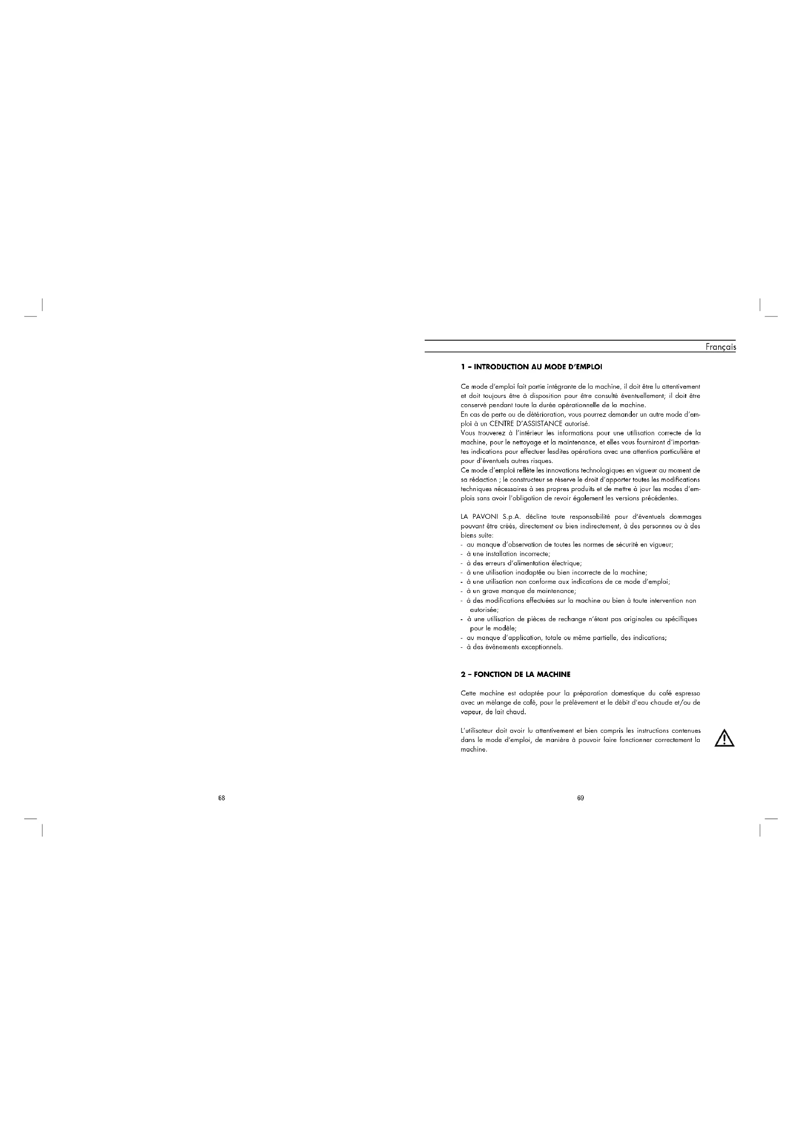 Cette machine est adaptée pour la préparation domestique du café espresso avec un mélange de café, pour le prélèvement et le débit d’eau chaude et/ou de vapeur, de lait chaud. L’utilisateur doit avoir lu attentivement et bien compris les instructions contenues dans le mode d’emploi, de manière à pouvoir faire fonctionner correctement la machine.