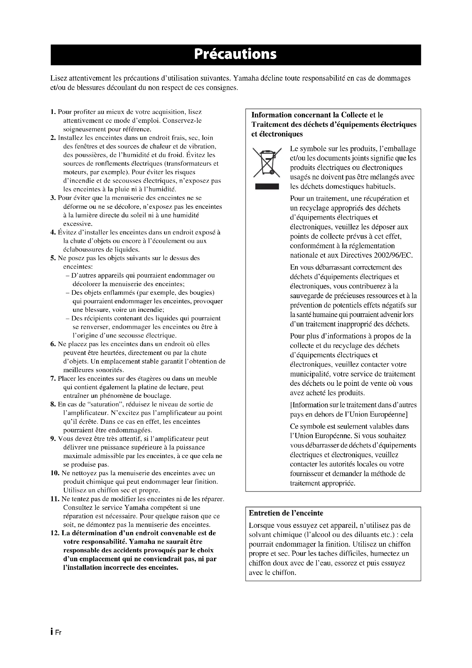 votre responsabilité. Yamaha ne saurait être responsable des accidents provoqués par le choix d’un emplacement qui ne conviendrait pas, ni par l’installation incorrecte des enceintes. Précautions Information concernant la Collecte et le Traitement des déchets d’équipements électriques et électroniques Le symbole sur les produits, l’emballage et/ou les documents joints signifie que les produits électriques ou électroniques usagés ne doivent pas être mélangés avec les déchets domestiques habituels. Pour un traitement, une récupération et un recyclage appropriés des déchets d’équipements électriques et électroniques, veuillez les déposer aux points de collecte prévus à cet effet, conformément à la réglementation nationale et aux Directives 2002/96/EC. En vous débarrassant correctement des déchets d’équipements électriques et électroniques, vous contribuerez à la sauvegarde de précieuses ressources et à la prévention de potentiels effets négatifs sur la santé humaine qui pourraient advenir lors d’un traitement inapproprié des déchets. Pour plus d’informations à propos de la collecte et du recyclage des déchets d’équipements électriques et électroniques, veuillez contacter votre municipalité, votre service de traitement des déchets ou le point de vente où vous avez acheté les produits. [Information sur le traitement dans d’autres pays en dehors de l’Union Européenne] Ce symbole est seulement valables dans l’Union Européenne. Si vous souhaitez vous débarrasser de déchets d’équipements électriques et électroniques, veuillez contacter les autorités locales ou votre fournisseur et demander la méthode de traitement appropriée. Entretien de l’enceinte Lorsque vous essuyez cet appareil, n’utilisez pas de solvant chimique (l’alcool ou des diluants etc.) : cela pourrait endommager la finition. Utilisez un chiffon propre et sec. Pour les taches difficiles, humectez un chiffon doux avec de l’eau, essorez et puis essuyez avec le chiffon.1 Fr Français Veuillez-vous assurer que l’emballage contient les éléments suivants. Avant de connecter les enceintes, placez chaque enceinte dans sa position respective. Le positionnement de l’enceinte est très important car il affecte toute la qualité sonore du système. Placez les enceintes dans des positions qui optimiseront la qualité sonore dans votre position d’écoute. Référez- vous à l’illustration.