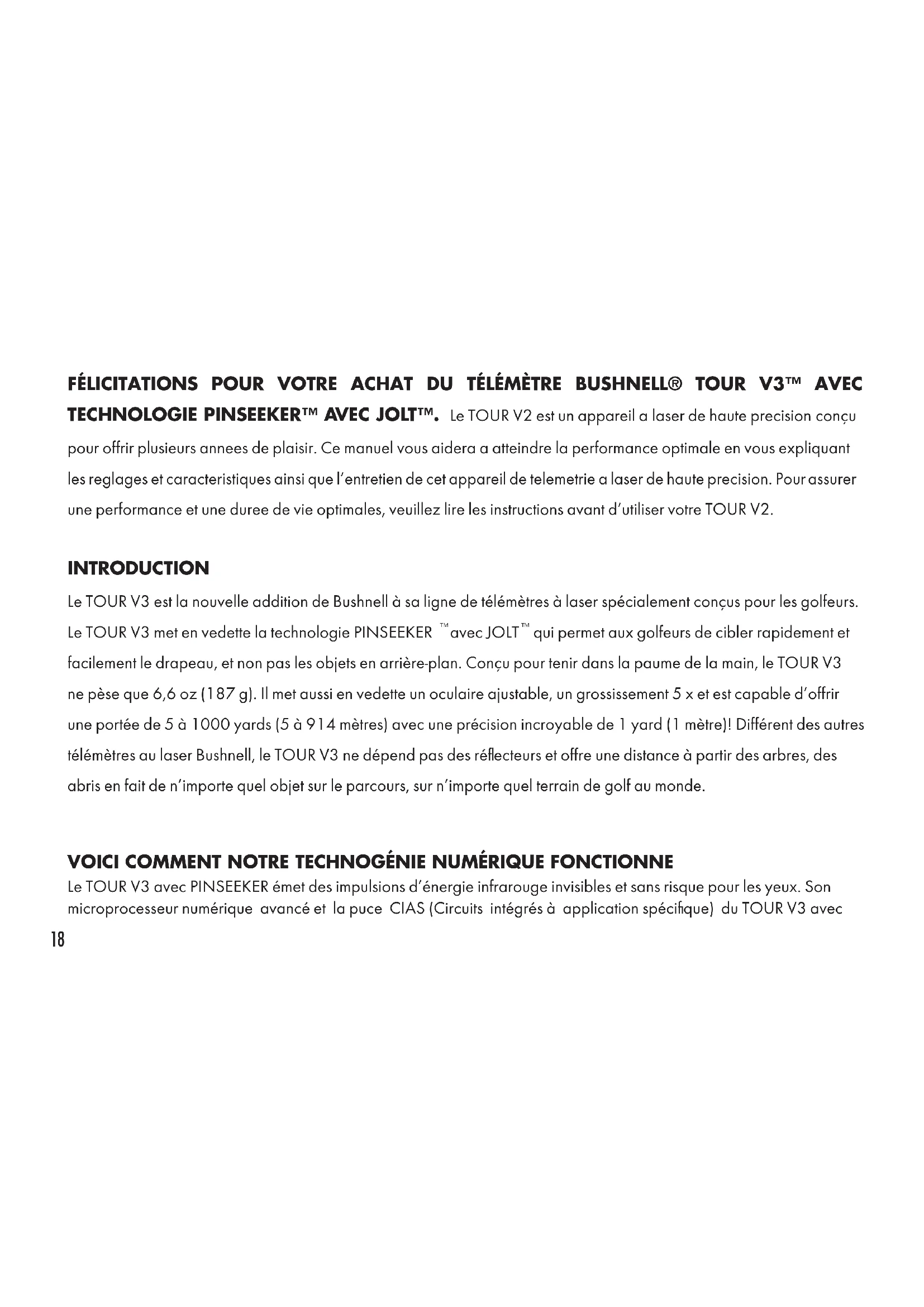 qui permet aux golfeurs de cibler rapidement et facilement le drapeau, et non pas les objets en arrière-plan. Conçu pour tenir dans la paume de la main, le TOUR V3 ne pèse que 6,6 oz (187 g). Il met aussi en vedette un oculaire ajustable, un grossissement 5 x et est capable d’offrir une portée de 5 à 1000 yards (5 à 914 mètres) avec une précision incroyable de 1 yard (1 mètre)! Différent des autres télémètres au laser Bushnell, le TOUR V3 ne dépend pas des réflecteurs et offre une distance à partir des arbres, des abris en fait de n’importe quel objet sur le parcours, sur n’importe quel terrain de golf au monde. VOICI COMMENT NOTRE TECHNOGÉNIE NUMÉRIQUE FONCTIONNE Le TOUR V3 avec PINSEEKER émet des impulsions d’énergie infrarouge invisibles et sans risque pour les yeux. Son microprocesseur numérique avancé et la puce CIAS (Circuits intégrés à application spécifique) du TOUR V3 avec19 PINSEEKER produisent chaque fois des relevés de distances précises et instantanées. La technogénie numérique sophistiquée calcule instantanément les distances en mesurant le temps requis par le parcours aller-retour de chaque impulsion du télémètre à la cible. PRÉCISION DE L’ÉVALUATION DES DISTANCES La précision de l’évaluation des distances du TOUR V3 est de +/- 1 yard/mètre dans la pluspart des cas. La distance maximale du télémètre dépend de la réflectivité de la cible. La distance maximale pour la majorité des objets est de 700 yards/640 mètres alors que le maximum pour les objets à haute réflectivité est de 1000 yards/914 mètres. Note: Vous obtiendrez les distances maximales et minimales selon les propriétés réfléchissantes d’une cible particulière et les conditions environnementales au moment de la mesure de la distance d’une cible. La couleur, le fini de la surface, la dimension et la forme de la cible affectent la réflectivité et la plage de mesure. Plus la couleur est vive, plus la plage est longue. Par exemple, le rouge a une grande reflectivité et permet une plus grande distance que le noir, la couleur ayant le moins de réflectivité. Un fini brillant permet une plage plus longue qu’un fini mât. L’évaluation de la distance d’une cible de petite taille est plus difficile que celle d’une grande taille. L’angle de la cible a également un effet. Viser une cible avec un angle de 90 degrés (alors que la surface de la cible est perpendiculaire à la trajectoire émise par les amplitudes d’impulsion) offre une distance maximale tandis qu’une pente raide offre une distance limitée. De plus, les conditions d’éclairage (p. ex. le niveau d’ensoleillement) affectera les capacités de distance de l’appareil. Moins d’ensoleillement (par ex.: journée nuageuse) permet de maximiser l’évaluation de la distance de l’appareil. De manière générale, les journées très ensoleillées diminuent l’évaluation de la distance maximale de l’appareil.