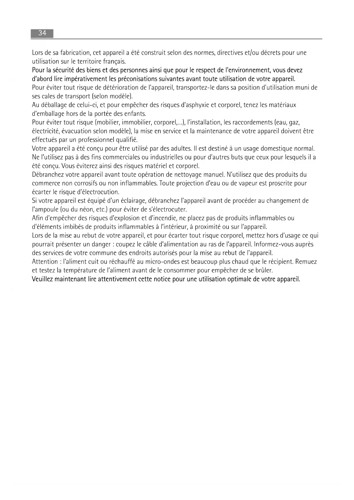 Bergensesteenweg, 719 – B-1502 LEMBEEK Tel. 02.363044434 Lors de sa fabrication, cet appareil a été construit selon des normes, directives et/ou décrets pour une utilisation sur le territoire français. Pour la sécurité des biens et des personnes ainsi que pour le respect de l’environnement, vous devez d’abord lire impérativement les préconisations suivantes avant toute utilisation de votre appareil. Pour éviter tout risque de détérioration de l’appareil, transportez-le dans sa position d’utilisation muni de ses cales de transport (selon modèle). Au déballage de celui-ci, et pour empêcher des risques d’asphyxie et corporel, tenez les matériaux d’emballage hors de la portée des enfants. Pour éviter tout risque (mobilier, immobilier, corporel,…), l’installation, les raccordements (eau, gaz, électricité, évacuation selon modèle), la mise en service et la maintenance de votre appareil doivent être effectués par un professionnel qualifié. Votre appareil a été conçu pour être utilisé par des adultes. Il est destiné à un usage domestique normal. Ne l’utilisez pas à des fins commerciales ou industrielles ou pour d’autres buts que ceux pour lesquels il a été conçu. Vous éviterez ainsi des risques matériel et corporel. Débranchez votre appareil avant toute opération de nettoyage manuel. N’utilisez que des produits du commerce non corrosifs ou non inflammables. Toute projection d’eau ou de vapeur est proscrite pour écarter le risque d’électrocution. Si votre appareil est équipé d’un éclairage, débranchez l’appareil avant de procéder au changement de l’ampoule (ou du néon, etc.) pour éviter de s’électrocuter. Afin d’empêcher des risques d’explosion et d’incendie, ne placez pas de produits inflammables ou d’éléments imbibés de produits inflammables à l’intérieur, à proximité ou sur l’appareil. Lors de la mise au rebut de votre appareil, et pour écarter tout risque corporel, mettez hors d’usage ce qui pourrait présenter un danger : coupez le câble d’alimentation au ras de l’appareil. Informez-vous auprès des services de votre commune des endroits autorisés pour la mise au rebut de l’appareil. Attention : l’aliment cuit ou réchauffé au micro-ondes est beaucoup plus chaud que le récipient. Remuez et testez la température de l’aliment avant de le consommer pour empêcher de se brûler. Veuillez maintenant lire attentivement cette notice pour une utilisation optimale de votre appareil.35Sommaire