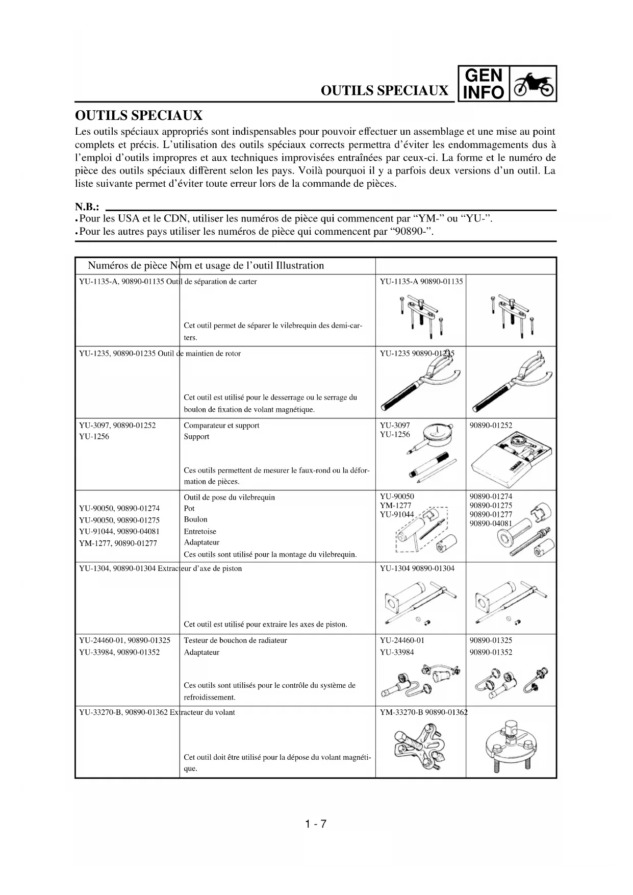 OUTILS SPECIAUX Les outils spéciaux appropriés sont indispensables pour pouvoir effectuer un assemblage et une mise au point complets et précis. L’utilisation des outils spéciaux corrects permettra d’éviter les endommagements dus à l’emploi d’outils impropres et aux techniques improvisées entraînées par ceux-ci. La forme et le numéro de pièce des outils spéciaux diffèrent selon les pays. Voilà pourquoi il y a parfois deux versions d’un outil. La liste suivante permet d’éviter toute erreur lors de la commande de pièces. N.B.: ● Pour les USA et le CDN, utiliser les numéros de pièce qui commencent par “YM-” ou “YU-”. ● Pour les autres pays utiliser les numéros de pièce qui commencent par “90890-”. Numéros de pièce Nom et usage de l’outil Illustration YU-1135-A, 90890-01135 Outil de séparation de carter Cet outil permet de séparer le vilebrequin des demi-car- ters. YU-1135-A 90890-01135 YU-1235, 90890-01235 Outil de maintien de rotor Cet outil est utilisé pour le desserrage ou le serrage du boulon de fixation de volant magnétique. YU-1235 90890-01235 YU-3097, 90890-01252 YU-1256 Comparateur et support Support Ces outils permettent de mesurer le faux-rond ou la défor- mation de pièces. YU-3097 YU-1256 90890-01252 YU-90050, 90890-01274 YU-90050, 90890-01275 YU-91044, 90890-04081 YM-1277, 90890-01277 Outil de pose du vilebrequin Pot Boulon Entretoise Adaptateur Ces outils sont utilisé pour la montage du vilebrequin. YU-90050 YM-1277 YU-91044 90890-01274 90890-01275 90890-01277 90890-04081 YU-1304, 90890-01304 Extracteur d’axe de piston Cet outil est utilisé pour extraire les axes de piston. YU-1304 90890-01304 YU-24460-01, 90890-01325 YU-33984, 90890-01352 Testeur de bouchon de radiateur Adaptateur Ces outils sont utilisés pour le contrôle du système de refroidissement. YU-24460-01 YU-33984 90890-01325 90890-01352 YU-33270-B, 90890-01362 Extracteur du volant Cet outil doit être utilisé pour la dépose du volant magnéti- que.