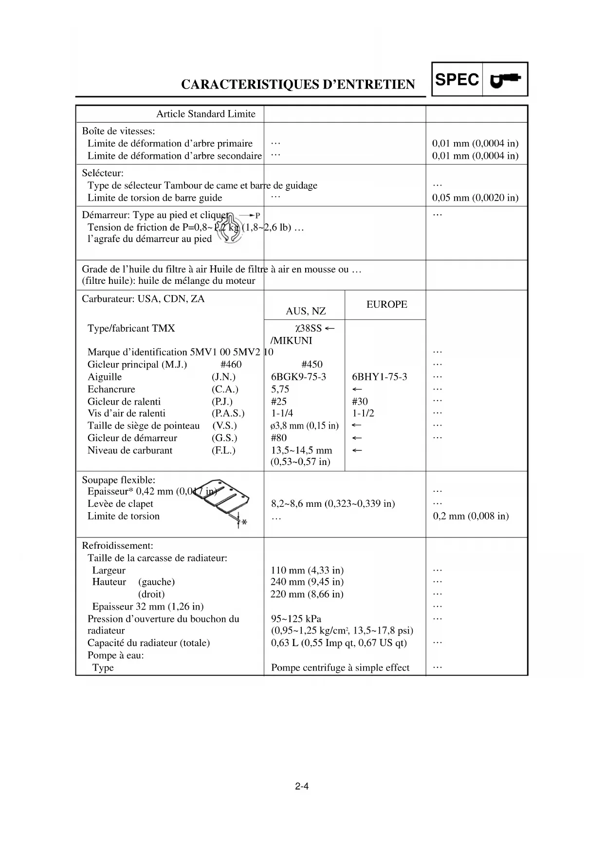 #25 #25 #25 #25 #25 #25 Gicleur *#30 *#30 *#30 *#30 *#30 *#30 Vis de richesse 1 1-1/4 1-1/2 1 1-1/4 1-1/2 *1-1/4 *1-1/2 *1-3/4 *1-1/4 *1-1/2 *1-3/4 Conditions Pièce Générales Moins de 10°C (50°F) (Hiver) 15 à 25°C (59 à 77°F) (Printemps, automne) Plus de 30°C (86°F) (Eté) Moins de 10°C (50°F) (Hiver) 15 à 25°C (59 à 77°F) (Printemps, automne) Plus de 30°C (86°F) (Eté) Sablonneux *Pour EUROPE Appauvri (Norme) Enrichi 5MV-9-30-7A 6/19/00 1:24 PM Page 267-11 TUN REGLAGE Symptômes 0~1/4 de papillon *Attaque difficile Perte de vitesse 0~1/4 de papillon Mauvaise accélération Fumée blanche Instabilité aux régimes inférieurs Bruit rosé Mauvaise réponse au régime extrêmement lent Mauvaise réponse dans la plage des régimes bas à intermédiaire Mauvaise réponse quand le papillon est ouvert rapidement. Mauvaise fonctionnement du moteur Réglages Utiliser une aiguille de gicleur avec un diamètre inférieur. Utiliser une aiguille de gicleur avec un diamètre supérieur. Abaisser la position de fixation de l’aiguille de gicleur (1 rainure plus bas) Visser la vis de richesse Réduire le n°de calibrage du gicleur de ralenti. Tourner en devissant la vis de richesse Si l’effet est nul, inverser les procédures mentionnées ci-dessus. Elever la position de fixation de l’aiguille de gicleur Si l’effet est nul, inverser les procédures mentionnées ci-dessus. Contrôler tous les réglages d’ensemble. Utiliser un gicleur principal avec un n° de calibrage inférieur. Elever la position de fixation de l’aiguille de gicleur (1 rainure plus haut). Si l’effet est nul, inverser les procédures mentionnées ci-dessus. Visser la vis de richesse Contrôler Nombre de tours de dévissage → Corriger correctement Fuite en provenance du carburateur Fein d’entraînement Fuite en provenance du carburateur Vérifier si le filtre à air n’est pas encrassé. Vérifier le fonctionnement du papillon des gaz. Ceci n’est qu’un simple exemple. Il est néces- saire de régler le carburateur tout en vérifiant les conditions de fonctionnement du moteur et la décoloration des bougies. Normalement, le réglage du carburateur se fait au moyen du gicleur principal, de la position de fixation de l'aiguille de gicleur (y compris avec une différence de 0,5), du gicleur de ralenti et de la vis de richesse. Si le résultat du réglage n'est toujours pas satisfaisant, il est recommandé de changer le diamètre de la sec- tion droite de l'aiguille de gicleur. *En cas d’attaque difficile, vérifier si le tuyau d’aération n’est pas obstrué. 5MV-9-30-7A 6/19/00 1:24 PM Page 277-10 TUN EINSTELLUNG Straßenbedingungen und Beispiele für die Vergasereinstellung Hauptdüse #470 #460 #450 #490 #480 #470 *#460 *#450 *#440 *#470 *#460 *#450 Düsennadel 6BGK10-75-3 6BGK9-75-3 6BGK9-75-3 6BGK9-75-4 6BGK10-75-3 6BGK10-75-3
