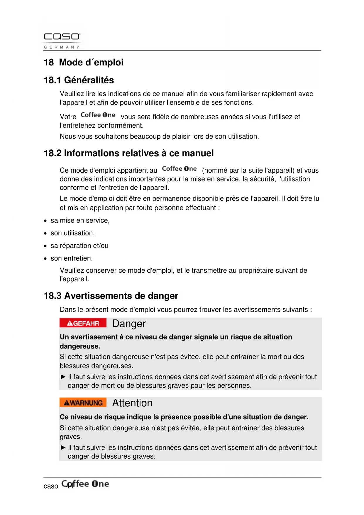 Retrouvez gratuitement la notice de l'appareil Coffee One CASO au format PDF.