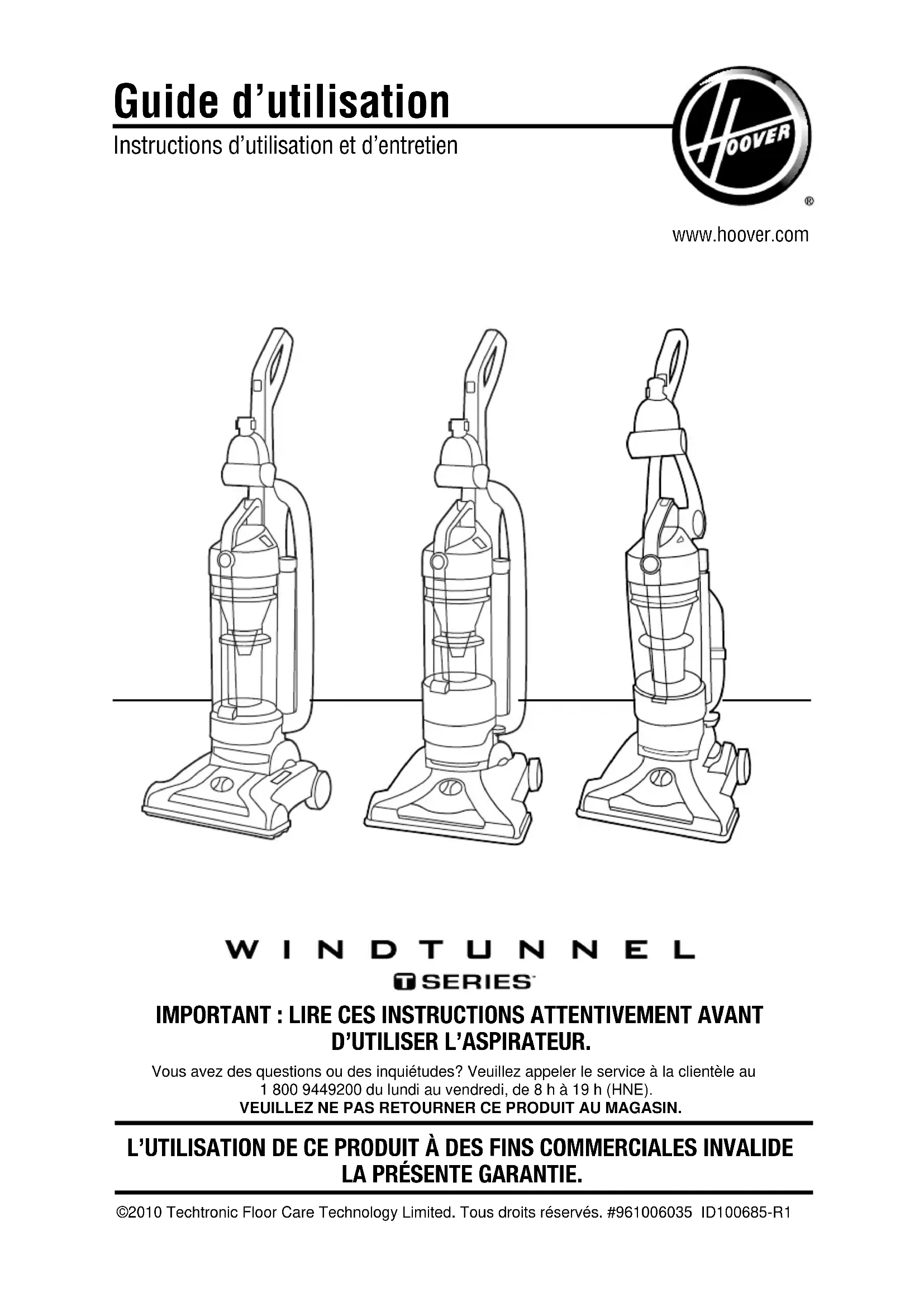 D’UTILISER L’ASPIRATEUR. Vous avez des questions ou des inquiétudes? Veuillez appeler le service à la clientèle au 1 800 9449200 du lundi au vendredi, de 8 h à 19 h (HNE). VEUILLEZ NE PAS RETOURNER CE PRODUIT AU MAGASIN.Merci d’avoir choisi un produit HOOVER