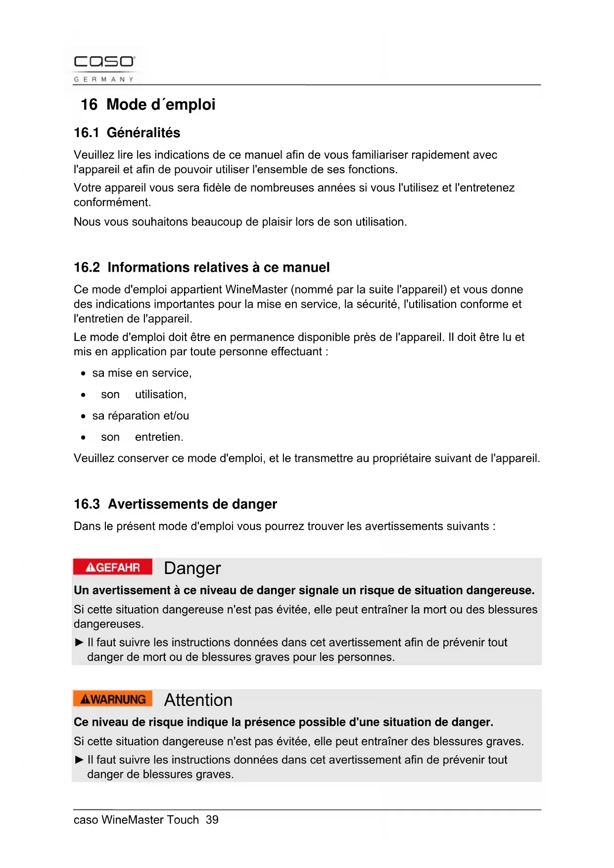 Dans le présent mode d'emploi vous pourrez trouver les avertissements suivants : Danger Un avertissement à ce niveau de danger signale un risque de situation dangereuse. Si cette situation dangereuse n'est pas évitée, elle peut entraîner la mort ou des blessures dangereuses. ► Il faut suivre les instructions données dans cet avertissement afin de prévenir tout danger de mort ou de blessures graves pour les personnes. Attention Ce niveau de risque indique la présence possible d'une situation de danger. Si cette situation dangereuse n'est pas évitée, elle peut entraîner des blessures graves. ► Il faut suivre les instructions données dans cet avertissement afin de prévenir tout danger de blessures graves.caso WineMaster Touch 40 Prudence Ce niveau de risque indique la présence possible d'une situation de danger. Si cette situation dangereuse n'est pas évitée, elle peut entraîner des blessures légères ou superficielles. ► Il faut suivre les instructions données dans cet avertissement afin de prévenir les blessures de personnes. Remarque Cette indication est accompagnée d'informations complémentaires pour faciliter l'utilisation de l'appareil.