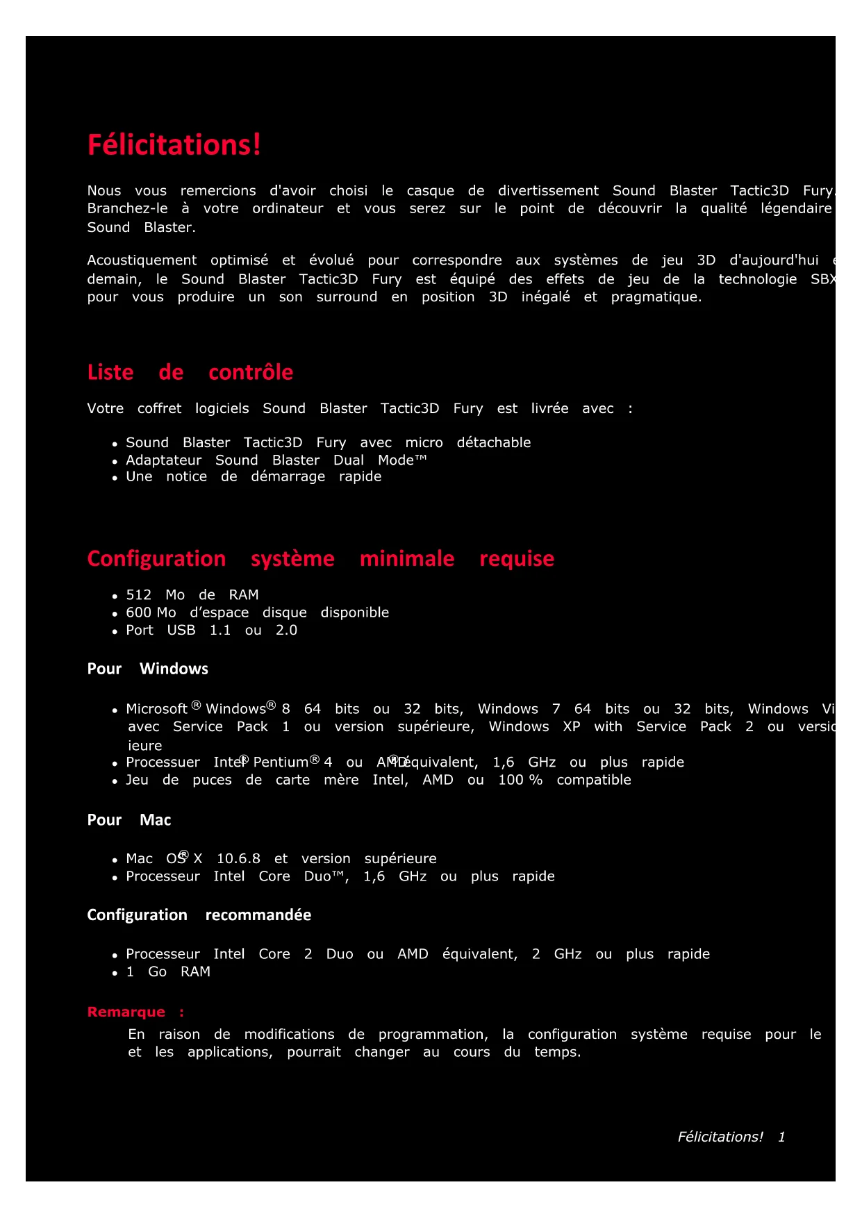 Félicitations! 1 Félicitations! Nous vous remercions d'avoir choisi le casque de divertissement Sound Blaster Tactic3D Fury. Branchez-le à votre ordinateur et vous serez sur le point de découvrir la qualité légendaire audio du Sound Blaster. Acoustiquement optimisé et évolué pour correspondre aux systèmes de jeu 3D d'aujourd'hui et de demain, le Sound Blaster Tactic3D Fury est équipé des effets de jeu de la technologie SBX Pro Studio™ pour vous produire un son surround en position 3D inégalé et pragmatique. Liste de contrôle Votre coffret logiciels Sound Blaster Tactic3D Fury est livrée avec : l Sound Blaster Tactic3D Fury avec micro détachablel Adaptateur Sound Blaster Dual Mode™l Une notice de démarrage rapide Configuration système minimale requise l 512 Mo de RAMl 600Mo d’espace disque disponiblel Port USB 1.1 ou 2.0 Pour Windows l Microsoft