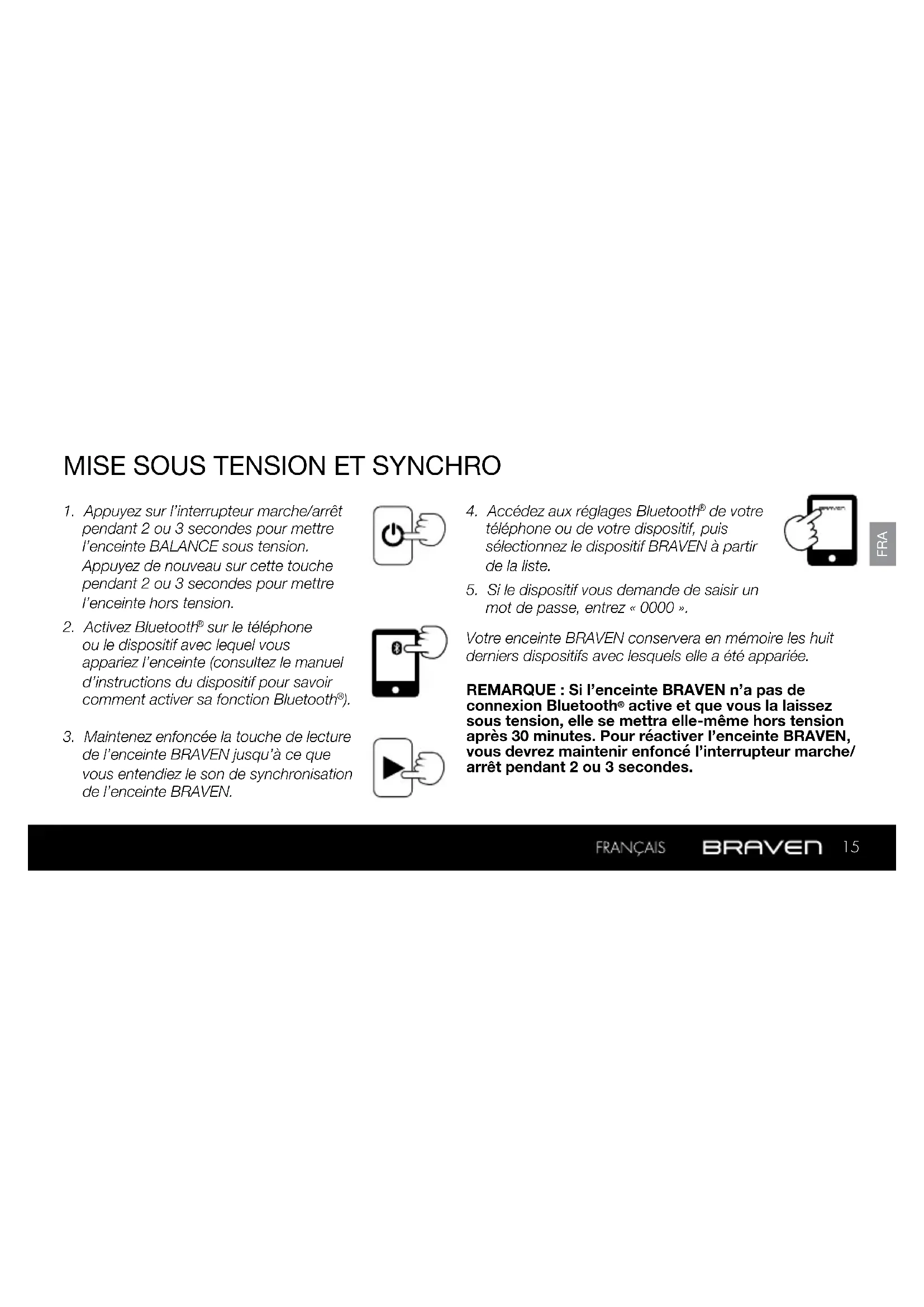 de l’enceinte BRAVEN jusqu’à ce que vous entendiez le son de synchronisation de l’enceinte BRAVEN.