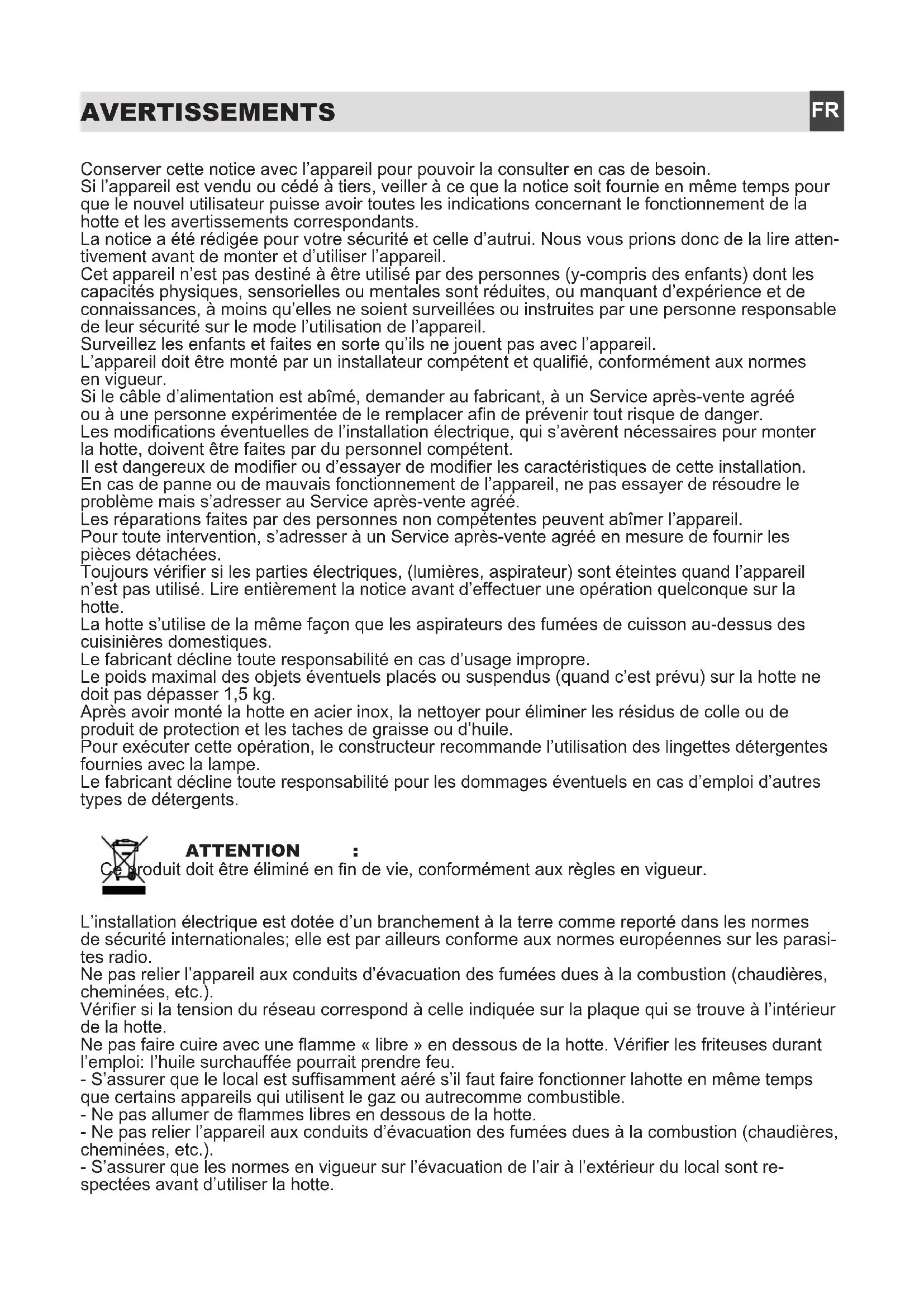 Si l'appareil est vendu ou cédé à tiers, veiller à ce que la notice soit fournie en même temps pour que le nouvel utilisateur puisse avoir toutes les indications concernant le fonctionnement de la hotte et les avertissements correspondants.