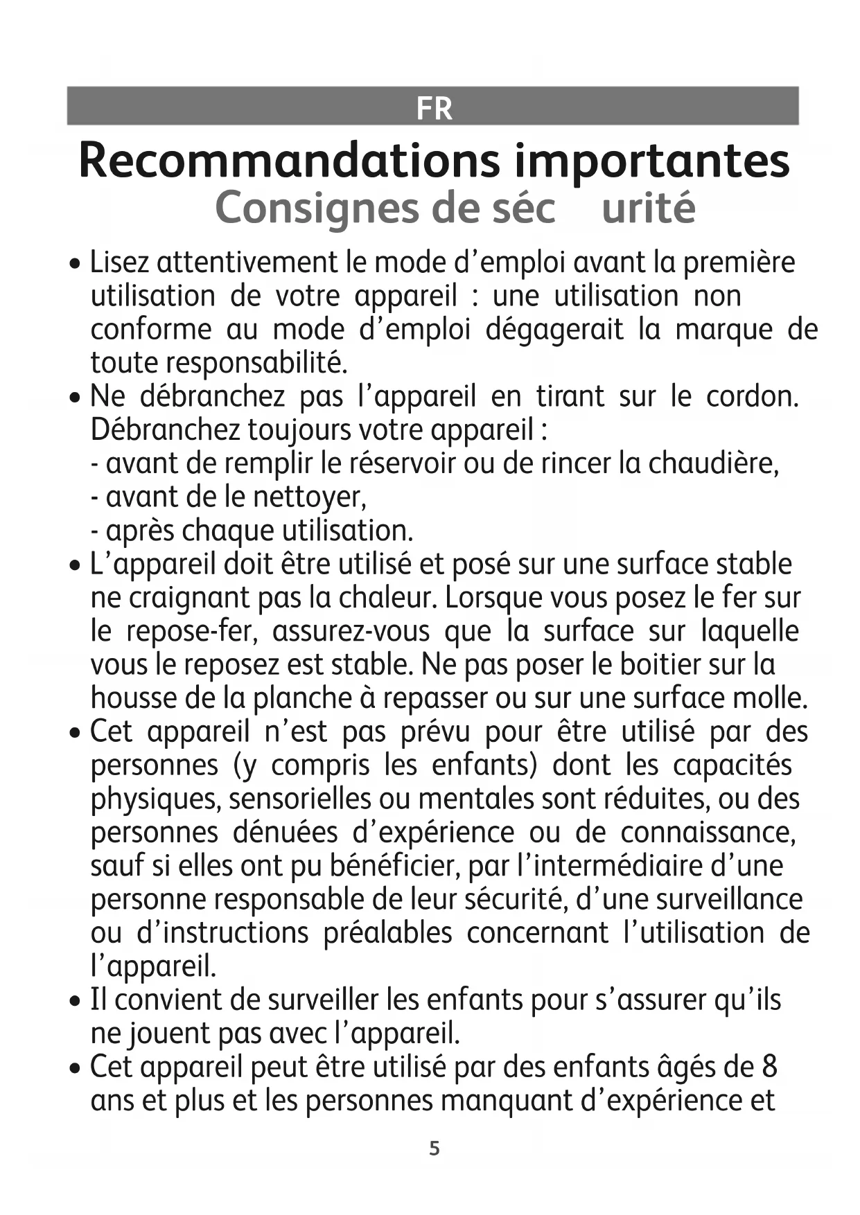 - Votre centrale vapeur est un appareil électrique: il doit être utilisé dans des conditions normales d’utilisation. Il est prévu pour un usage domestique uniquement.