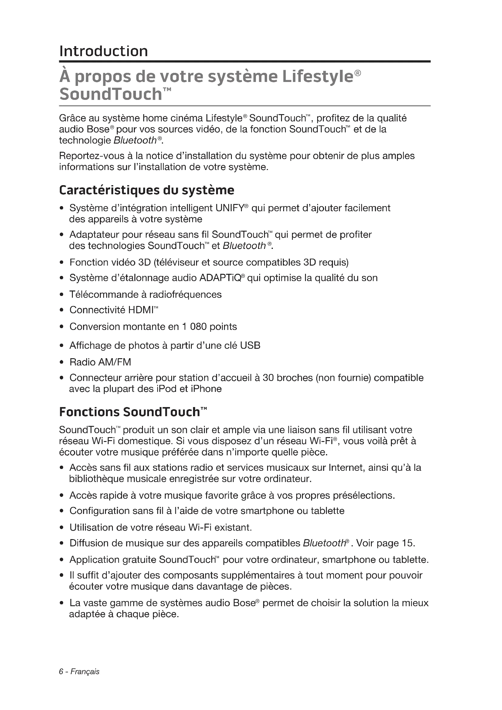 ©2015 Bose Corporation. Toute reproduction, modification, distribution ou autre utilisation, même partielle, de ce document est interdite sans autorisation écrite préalable.Français - 3 Sommaire Introduction À propos de votre système Lifestyle