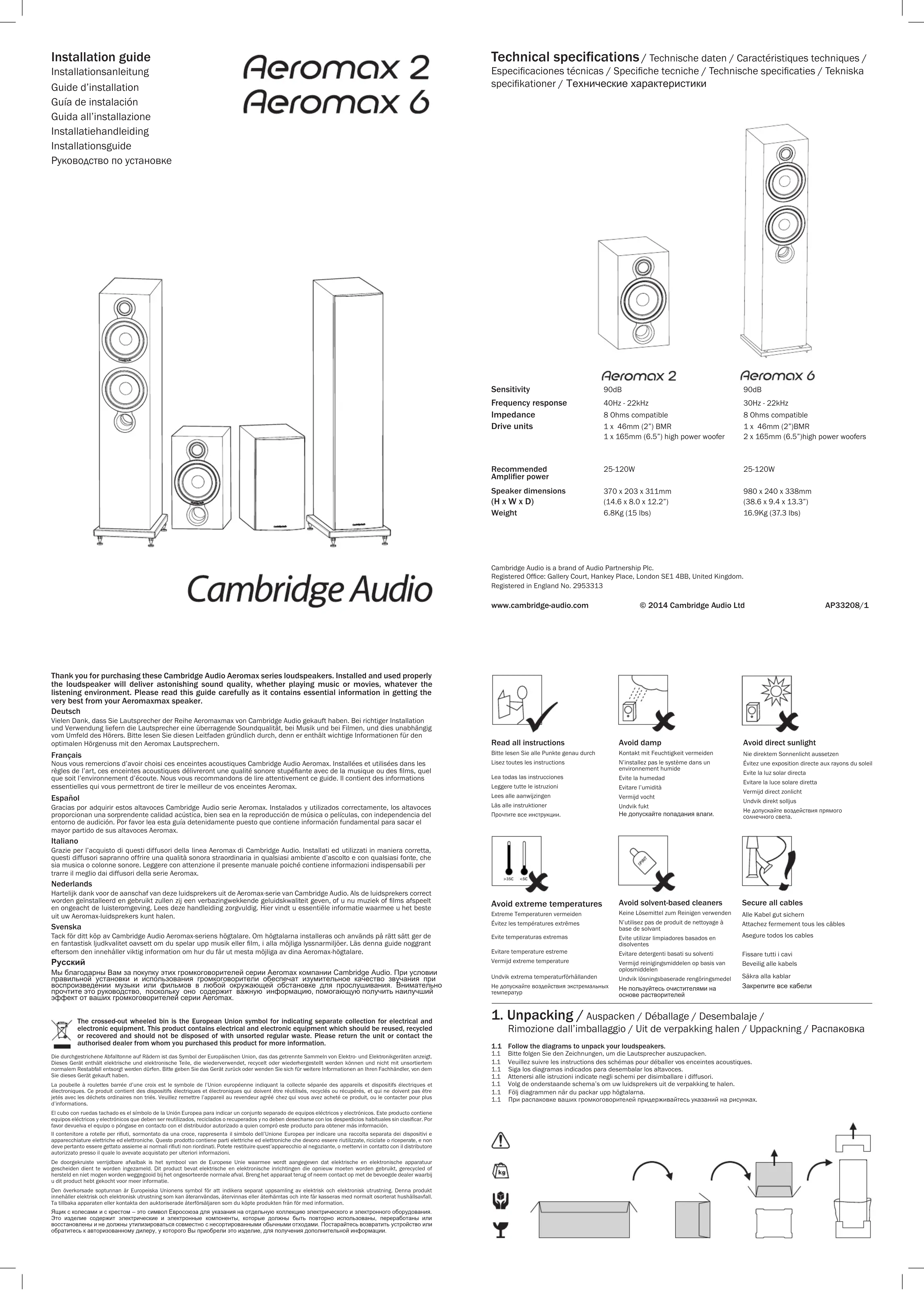 Nous you remercions d'avoir choisi ces enceintes acoustiques Cambridge Audio Aeromax. Installees et utilisées dans les régles de l'art, ces enceintes acoustiques délivreront une qualité sonne supfrique avec de la musique ou des films, qui que soit l'environnement d'écoute. Nous you recommendons de dire attentivement ce guide. Il contient des informations essentielles qui you permettront de tirer le meilleur de vos enceintes Aeromax.