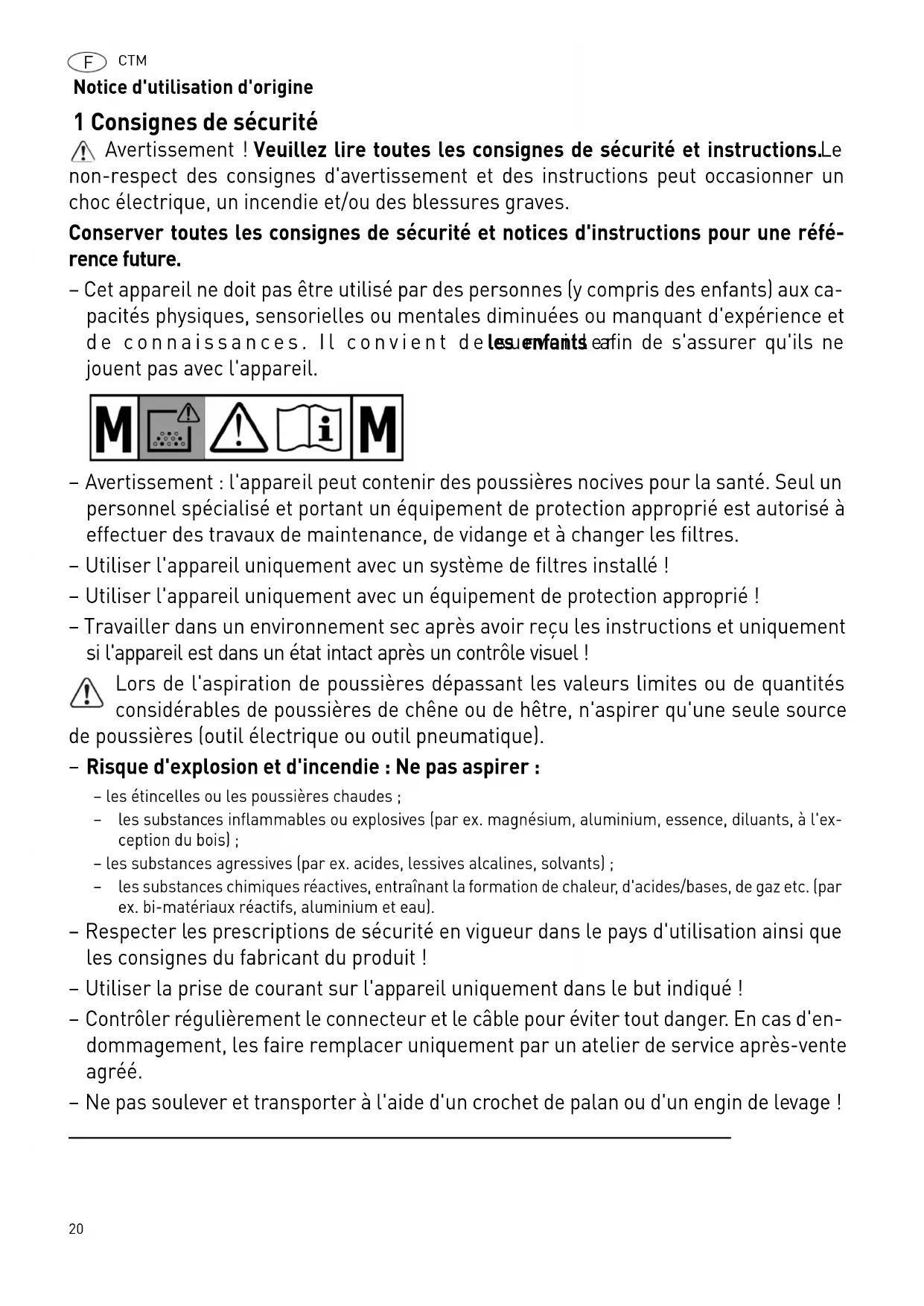 Risque d'explosion et d'incendie : Ne pas aspirer : – les étincelles ou les poussières chaudes ; – les substances inflammables ou explosives (par ex. magnésium, aluminium, essence, diluants, à l'ex- ception du bois) ; – les substances agressives (par ex. acides, lessives alcalines, solvants) ; – les substances chimiques réactives, entraînant la formation de chaleur, d'acides/bases, de gaz etc. (par ex. bi-matériaux réactifs, aluminium et eau). – Respecter les prescriptions de sécurité en vigueur dans le pays d'utilisation ainsi que les consignes du fabricant du produit ! – Utiliser la prise de courant sur l'appareil uniquement dans le but indiqué ! – Contrôler régulièrement le connecteur et le câble pour éviter tout danger. En cas d'en- dommagement, les faire remplacer uniquement par un atelier de service après-vente agréé. – Ne pas soulever et transporter à l'aide d'un crochet de palan ou d'un engin de levage !CTM