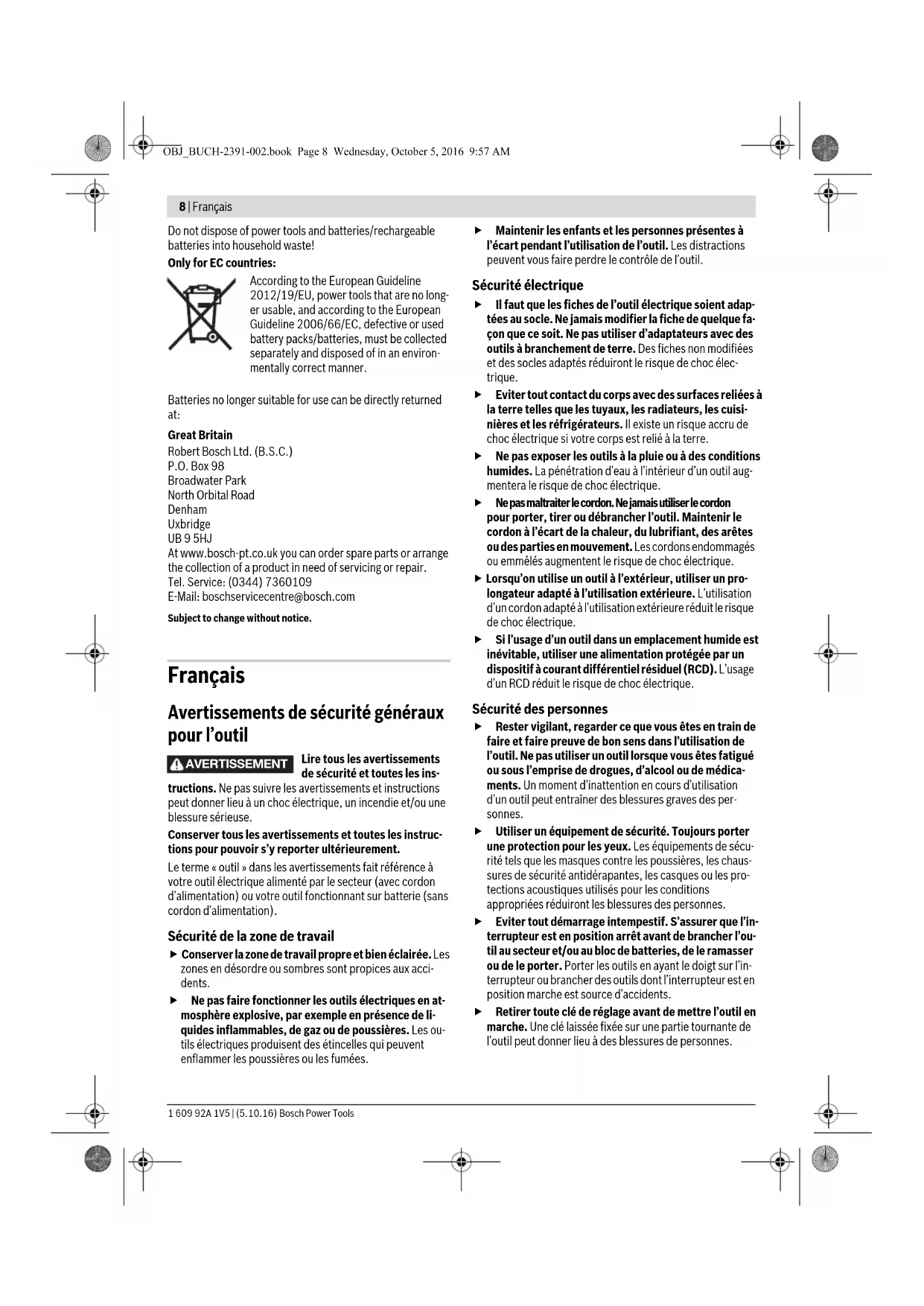 Floor Jl. Let. Jend. TB Simatupang II S/06 Jakarta Selatan 12960 Indonesia Tel.: (021) 3005 6565 Fax: (021) 3005 5801 E-Mail: boschpowertools@id.bosch.com www.bosch-pt.co.id Philippines Robert Bosch, Inc. 28th Floor Fort Legend Towers, 3rd Avenue corner 31st Street, Fort Bonifacio Global City, 1634 Taguig City, Philippines Tel.: (02) 8703871 Fax: (02) 8703870 matheus.contiero@ph.bosch.com www.bosch-pt.com.ph Bosch Service Center: 9725-27 Kamagong Street San Antonio Village Makati City, Philippines Tel.: (02) 8999091 Fax: (02) 8976432 rosalie.dagdagan@ph.bosch.com Malaysia Robert Bosch (S.E.A.) Sdn. Bhd. No. 8A, Jalan 13/6 G.P.O. Box 10818 46200 Petaling Jaya Selangor, Malaysia Tel.: (03) 79663194 Fax: (03) 79583838 cheehoe.on@my.bosch.com Toll-Free: 1800 880188 www.bosch-pt.com.my Thailand Robert Bosch Ltd. Liberty Square Building No. 287, 11 Floor Silom Road, Bangrak Bangkok 10500 Tel.: 02 6393111, 02 6393118 Fax: 02 2384783 Robert Bosch Ltd., P. O. Box 2054 Bangkok 10501, Thailand www.bosch.co.th Bosch Service – Training Centre La Salle Tower Ground Floor Unit No.2 10/11 La Salle Moo 16 Srinakharin Road Bangkaew, Bang Plee Samutprakarn 10540 Thailand Tel.: 02 7587555 Fax: 02 7587525 Singapore Robert Bosch (SEA) Pte. Ltd. 11 Bishan Street 21 Singapore 573943 Tel.: 6571 2772 Fax: 6350 5315 leongheng.leow@sg.bosch.com Toll-Free: 1800 3338333 www.bosch-pt.com.sg Vietnam Robert Bosch Vietnam Co. Ltd 10/F, 194 Golden Building 473 Dien Bien Phu Street Ward 25, Binh Thanh District 84 Ho Chi Minh City Vietnam Tel.: (08) 6258 3690 ext. 413 Fax: (08) 6258 3692 hieu.lagia@vn.bosch.com www.bosch-pt.com Australia, New Zealand and Pacific Islands Robert Bosch Australia Pty. Ltd. Power Tools Locked Bag 66 Clayton South VIC 3169 Customer Contact Center Inside Australia: Phone: (01300) 307044 Fax: (01300) 307045 Inside New Zealand: Phone: (0800) 543353 Fax: (0800) 428570 Outside AU and NZ: Phone: +61 3 95415555 www.bosch.com.au Transport The contained lithium-ion batteries are subject to the Danger- ous Goods Legislation requirements. The user can transport the batteries by road without further requirements. When being transported by third parties (e. g.: air transport or forwarding agency), special requirements on packaging and labelling must be observed. For preparation of the item being shipped, consulting an expert for hazardous material is re- quired. Dispatch batteries only when the housing is undamaged. Tape or mask off open contacts and pack up the battery in such a manner that it cannot move around in the packaging. Please also observe possibly more detailed national regula- tions. Disposal The machine, rechargeable batteries, accessories and packaging should be sorted for environmental- friendly recycling. OBJ_BUCH-2391-002.book Page 7 Wednesday, October 5, 2016 9:57 AM8 | Français 1 609 92A 1V5 | (5.10.16) Bosch Power Tools Do not dispose of power tools and batteries/rechargeable batteries into household waste! Only for EC countries: According to the European Guideline 2012/19/EU, power tools that are no long- er usable, and according to the European Guideline 2006/66/EC, defective or used battery packs/batteries, must be collected separately and disposed of in an environ- mentally correct manner. Batteries no longer suitable for use can be directly returned at: Great Britain Robert Bosch Ltd. (B.S.C.) P.O. Box 98 Broadwater Park North Orbital Road Denham Uxbridge UB 9 5HJ At www.bosch-pt.co.uk you can order spare parts or arrange the collection of a product in need of servicing or repair. Tel. Service: (0344) 7360109 E-Mail: boschservicecentre@bosch.com Subject to change without notice. Français Avertissements de sécurité généraux pour l’outil Lire tous les avertissements de sécurité et toutes les ins- tructions. Ne pas suivre les avertissements et instructions peut donner lieu à un choc électrique, un incendie et/ou une blessure sérieuse. Conserver tous les avertissements et toutes les instruc- tions pour pouvoir s’y reporter ultérieurement. Le terme « outil » dans les avertissements fait référence à votre outil électrique alimenté par le secteur (avec cordon d’alimentation) ou votre outil fonctionnant sur batterie (sans cordon d’alimentation). Sécurité de la zone de travail Conserver la zone de travail propre et bien éclairée. Les zones en désordre ou sombres sont propices aux acci- dents. Ne pas faire fonctionner les outils électriques en at- mosphère explosive, par exemple en présence de li- quides inflammables, de gaz ou de poussières. Les ou- tils électriques produisent des étincelles qui peuvent enflammer les poussières ou les fumées. Maintenir les enfants et les personnes présentes à l’écart pendant l’utilisation de l’outil. Les distractions peuvent vous faire perdre le contrôle de l’outil. Sécurité électrique Il faut que les fiches de l’outil électrique soient adap- tées au socle. Ne jamais modifier la fiche de quelque fa- çon que ce soit. Ne pas utiliser d’adaptateurs avec des outils à branchement de terre. Des fiches non modifiées et des socles adaptés réduiront le risque de choc élec- trique. Eviter tout contact du corps avec des surfaces reliées à la terre telles que les tuyaux, les radiateurs, les cuisi- nières et les réfrigérateurs. Il existe un risque accru de choc électrique si votre corps est relié à la terre. Ne pas exposer les outils à la pluie ou à des conditions humides. La pénétration d’eau à l’intérieur d’un outil aug- mentera le risque de choc électrique. Ne pas maltraiter le cordon. Ne jamais utiliser le cordon pour porter, tirer ou débrancher l’outil. Maintenir le cordon à l’écart de la chaleur, du lubrifiant, des arêtes ou des parties en mouvement. Les cordons endommagés ou emmêlés augmentent le risque de choc électrique. Lorsqu’on utilise un outil à l’extérieur, utiliser un pro- longateur adapté à l’utilisation extérieure. L’utilisation d’un cordon