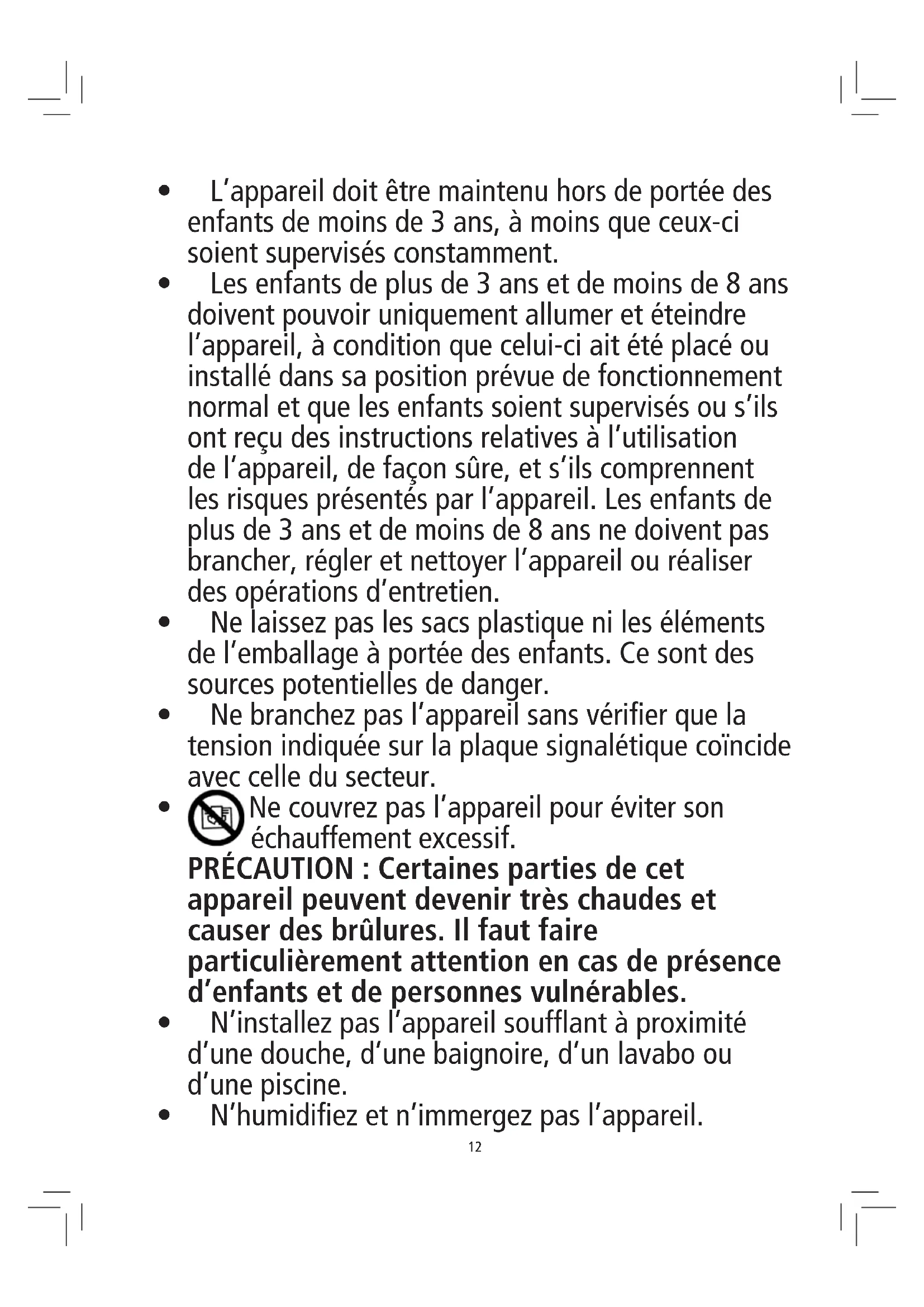 - L’appareil doit être maintenu hors de portée des enfants de moins de 3 ans, à moins que ceux-ci soient supervisés constamment.