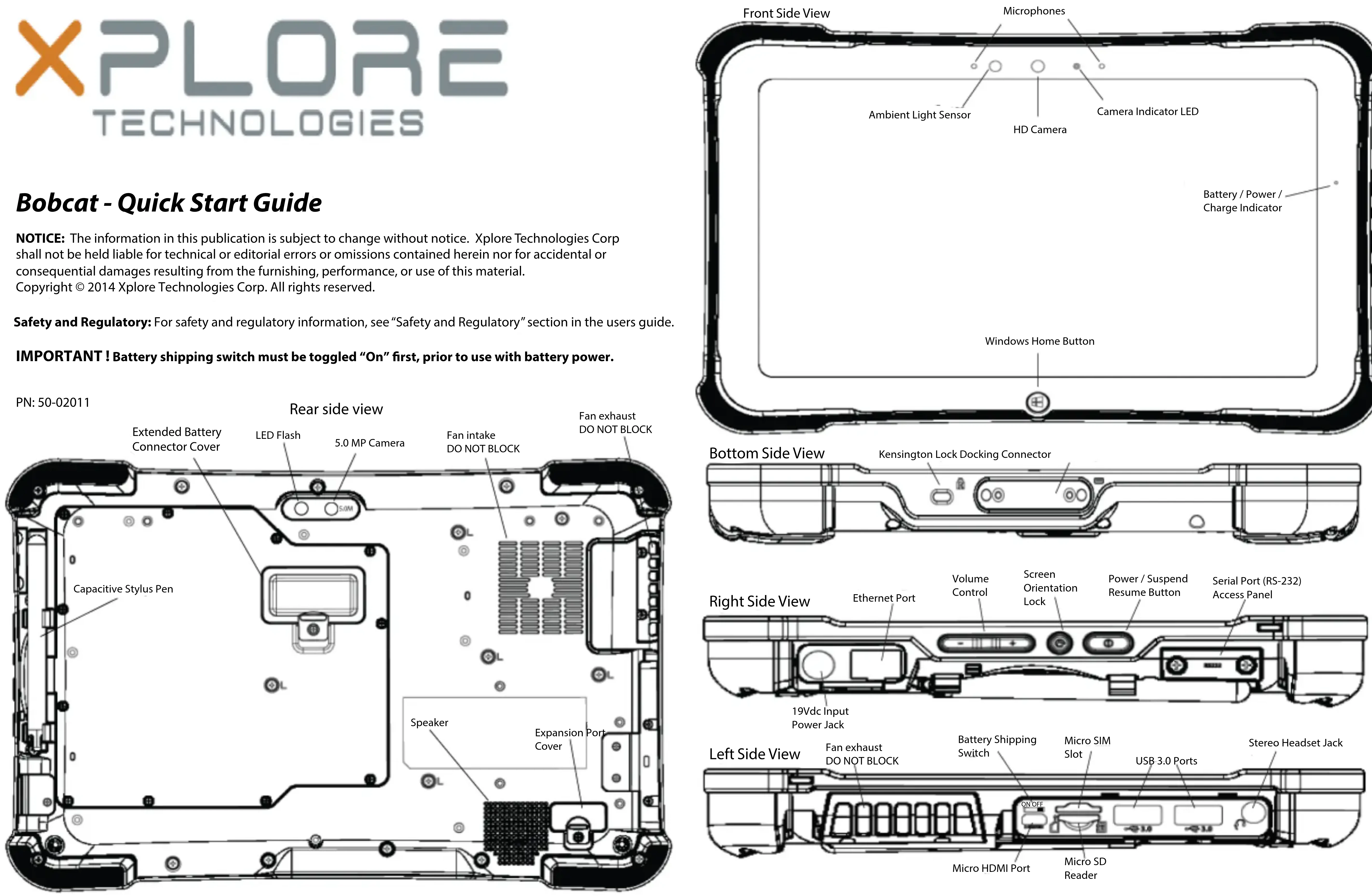 Battery Shipping Switch Micro SIM Slot Micro HDMI Port Micro SD Reader USB 3.0 Ports Capacitive Stylus Pen Speaker Expansion Port CoverAvis: Linformation ici est réservé de charger sans avis. Xplore Technologies Corp. nést responsible pour ni les erreurs techniques ou éditorialistes ni les omissions, ni les dommages- intérêts accidentels ou par conséquent qui resultent de l'emploi, ou performance de ce matériel. Copyright © 2014 Xplore Technologies Corp. All rights reserved Pour sécurité voir guide de dépannage. Guide de démarrage Vue latérale avant Vue de côté arrière Avis! L'expédiation de pile doit être basculer avant de l'employer avec la puissance de pile. Pal peur deluminére ambiante serrure Conduit de dock Contrôle de volume Connecteur étendu pour batterié capot Appareil D’admission du ventilateur ne pas bloquer Échappement du ventilateur ne pas bloquer Stylet capacitif haut-parleur port d’expansion couvercle Appareil HD Témoin dela caméra LED pile / puissance serrure de rotation d’ecran Windows Bouton Accueil Bas vue de côté Vue du Côté droit Vue du côté gauche Port d’ Ethernet Orientation de l’ecran verrouiller Alimentation bouton suspendre / reprendre Port série panneau d’accés Jack d’ entrée Échappement du ventilateur ne pas bloquer L’expédiation de pile Mirco SD Lecteur USB 3.0 Ports Micro SIM Slot Jack de casque Bobcat -
