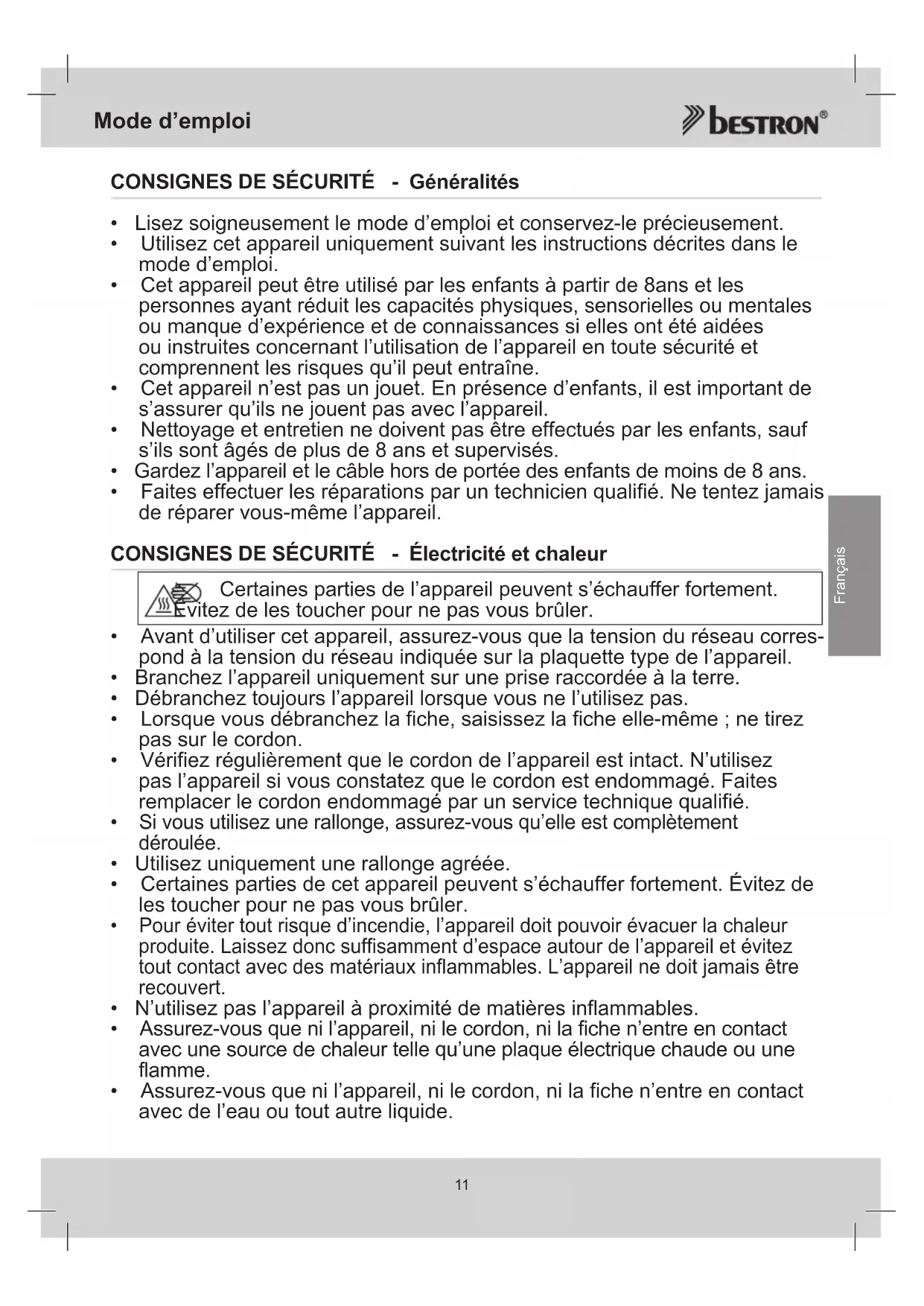 Retrouvez gratuitement la notice de l'appareil AFH218 BESTRON au format PDF.