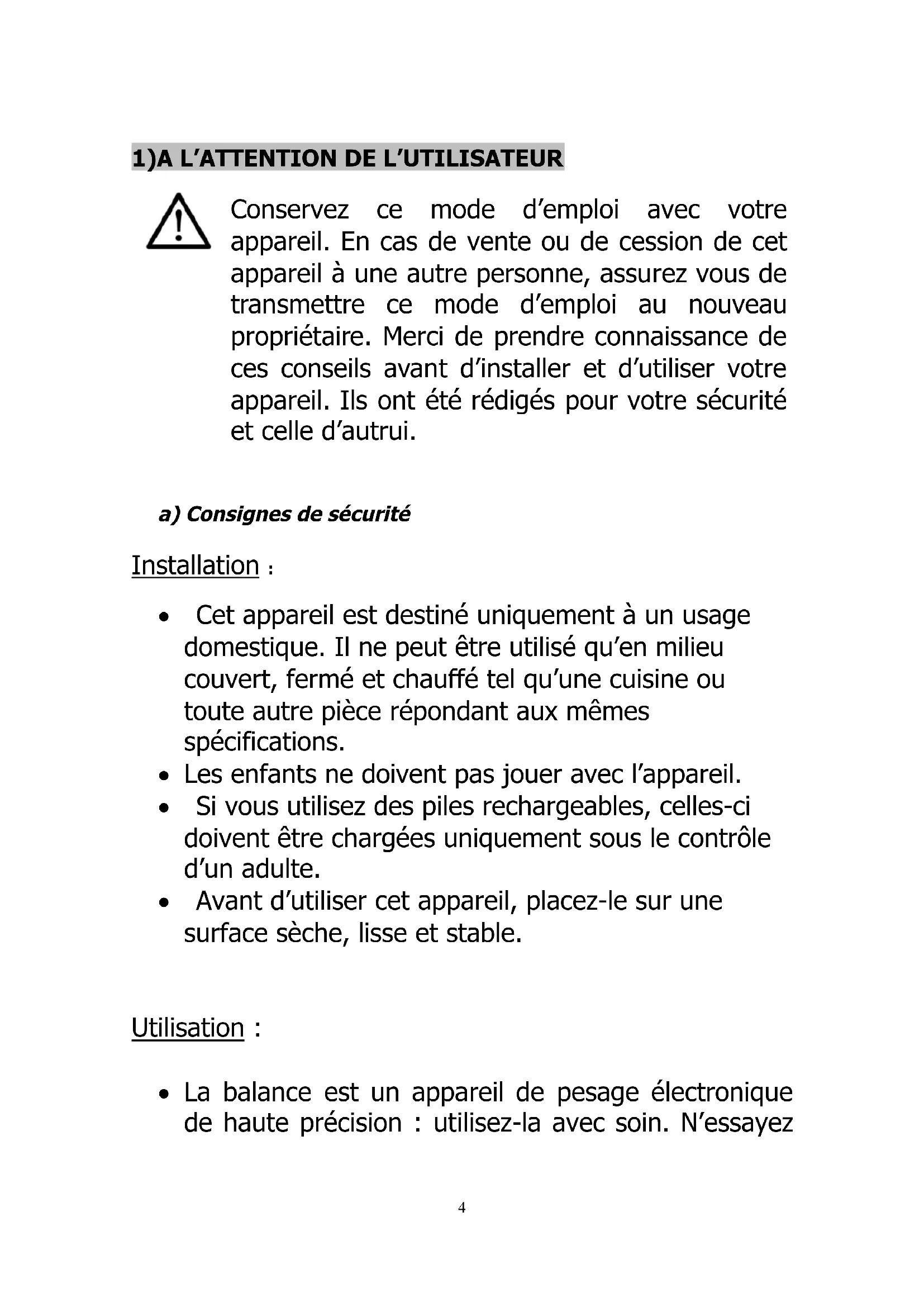 a) Consignes de sécurité Installation : Cet appareil est destiné uniquement à un usage domestique. Il ne peut être utilisé qu’en milieu couvert, fermé et chauffé tel qu’une cuisine ou toute autre pièce répondant aux mêmes spécifications. Les enfants ne doivent pas jouer avec l’appareil. Si vous utilisez des piles rechargeables, celles-ci doivent être chargées uniquement sous le contrôle d’un adulte. Avant d’utiliser cet appareil, placez-le sur une surface sèche, lisse et stable. Utilisation : La balance est un appareil de pesage électronique de haute précision : utilisez-la avec soin. N’essayez Conservez ce mode d’emploi avec votre appareil. En cas de vente ou de cession de cet appareil à une autre personne, assurez vous de transmettre ce mode d’emploi au nouveau propriétaire. Merci de prendre connaissance de ces conseils avant d’installer e t d’utiliser votre appareil. Ils ont été rédigés pour votre sécurité et celle d’autrui.5 pas de la démonter et évitez les fortes vibrations et les chocs. N’appuyez pas dessus, ne la laissez pas tomber, ne laissez pas tomber d’objets sur le plateau en verre Ne stockez pas d’objets sur l’appareil. N’exposez pas l’appareil à la lumière directe du soleil. Tenez-le éloigné de toute source de chaleur et de l’humidité. Ne surchargez pas la balance. Si le résultat s’affiche de façon incorrecte, vérifiez si les piles et les points de contact se touchent bien. Remplacez les piles si la balance n’a pas été utilisée depuis longtemps puis, essayez à nouveau. Évitez d’utiliser la balance de cuisine dans des endroits où des champs magnétiques pourraient interférer avec les informations transmises par la balance. Remplacez la pile lorsqu’elle est usagée ou en cas de fuite. Retirez la pile en cas de non utilisation prolongée de la balance. Lorsque vous déplacez la balance à un endroit présentant un écart de température de plus de 10°C, laissez-la reposer pendant au moins deux heures avant de la mettre en marche. Entretien et nettoyage : Ne pas utiliser de produits chimiques, de laine d’acier ou de nettoyants abrasifs pour nettoyer6 l’extérieur de l’appareil, cela risque de le détériorer. Utilisation non conforme : Utilisez cet appareil uniquement pour les usages décrits dans ce manuel. Le fabricant se dégage de toute responsabilité en cas d’utilisations non conformes.