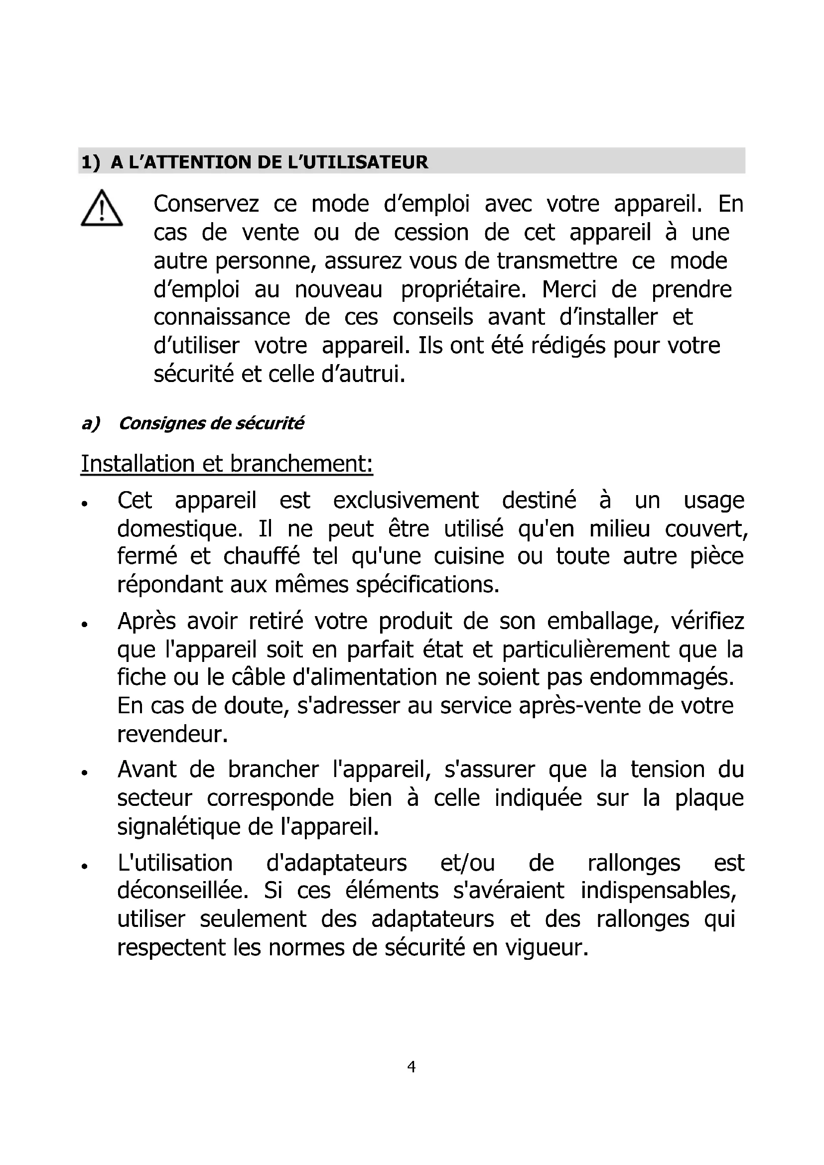 SOR15E2 Chère Cliente, Cher Client, Vous venez d’acquérir un produit BRANDT et nous vous remercions de la confiance que vous nous accordez. Nous avons conçu et fabriqué ce produit en pensant à vous, à votre mode de vie, à vos besoins, pour qu’il réponde au mieux à vos attentes. Nous y avons mis notre savoir- faire, notre esprit d’innovation et toute la passion qui nous anime depuis plus de 60 ans. Dans un souci permanent de toujours mieux satisfaire vos exigences, notre service consommateurs est à votre disposition et à votre écoute pour répondre à toutes vos questions ou suggestions. Connectez-vous aussi sur notre site www.brandt.com où vous trouverez nos dernières innovations, ainsi que des informations utiles et complémentaires. BRANDT est heureux de vous accompagner au quotidien et vous souhaite de profiter pleinement de votre achat. Important : Avant de mettre votre appareil en marche, veuillez lire attentivement ce guide d’installation et d’utilisation afin de vous familiariser plus rapidement avec son fonctionnement3 SOMMAIRE