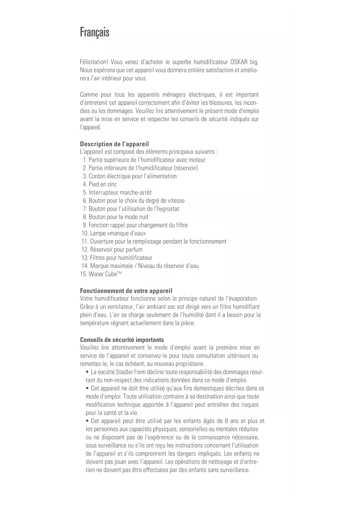 - Pour une utilisation hygiénique et optimale de l’humidificateur, les filtres doivent être changés tous les 2–3 mois. En cas d’utilisation prolongée des filtres, la capacité d’utilisation peut baisser fortement et d’autre part le traitement antimicrobien des filtres n’est plus garanti. Vous pouvez ache- ter les filtres pour humidificateur auprès du distributeur chez qui vous avez acheté votre Oskar big. Water Cube™ – Hygiène optimale pour votre humidificateur Le Water Cube™ (15) de Stadler Form garantit une hygiène optimale pour votre humidificateur. L’utilisation du Water Cube permet un excellent fonc- tionnement de l’humidificateur et prolonge sa durée de vie. Le Water Cube agit également sur les appareils éteints et garde l’humidificateur frais pour une saison. Nous conseillons de renouveler le Water Cube au début de chaque début de saison d’humidification. Réparations