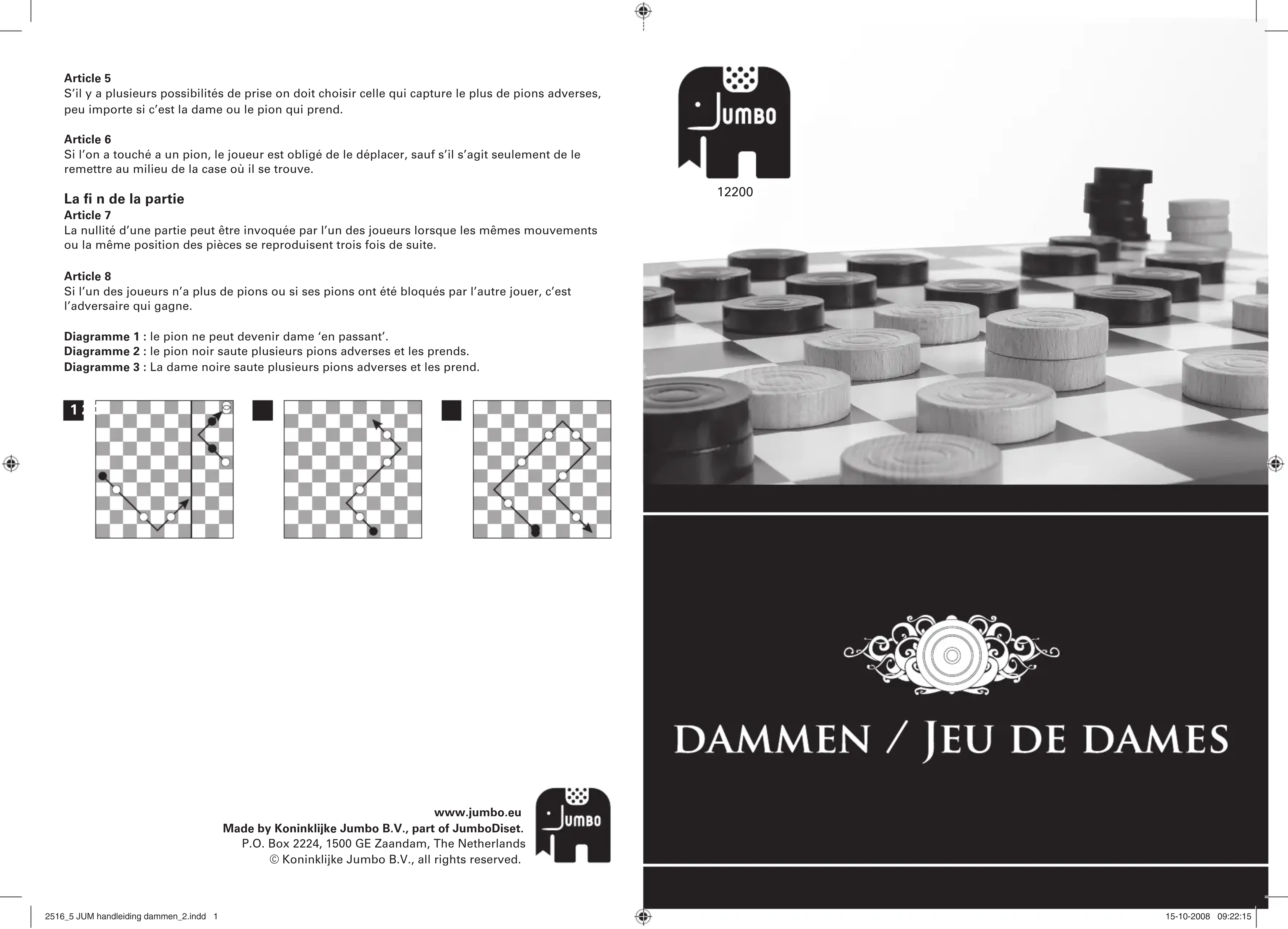 trouve en contact avec une pièce adverse, elle-même située devant une case vide, il doit obligatoirement sauter par-dessus la pièce et occuper la case libre. Il vient alors d’opérer une ‘prise’ et retire du jeu la pièce adverse. Il peut pratiquer plusieurs prises lors d’un même coup, voir diagramme 2. Déplacement des pions Article 1 Il n’est permis d’avancer ses pions qu’en diagonale. Il est défendu de les faire reculer ; les joueurs peuvent prendre soit en avant soit en arrière. Article 2 Chaque fois qu’avec un de ses pions un joueur parvient à la dernière rangée de l’autre côté du damier, il obtient une dame, c’est-à-dire que l’adversaire est obligé de placer un des pions gagnés sur celui qui a parcouru tout le damier. S’il atteint cette rangée à la suite d’une ou plusieurs prises, il ne devient dame que s’il n’a plus de prises à faire, sinon il est obligé de prendre et, ne faisant que passer sur cette rangée, il n’a pas le droit au titre de dame. Diagramme 1. Article 3 Une dame peut se déplacer diagonalement en avant et en arrière et traverser toutes les cases vides dans une même direction. Prendre Article 4 Il est obligatoire de prendre. Le pion saute un ou plusieurs pions adverses, pourvu que derrière chacun d’eux se trouve une case vide. Diagramme 2. La dame peut aussi prendre s’il y a une ou plusieurs cases vides derrière le(s) pion(s) adverse(s). Diagramme 3. 2516_5 JUM handleiding dammen_2.indd 22516_5 JUM handleiding dammen_2.indd 2 15-10-2008 09:22:1715-10-2008 09:22:17
