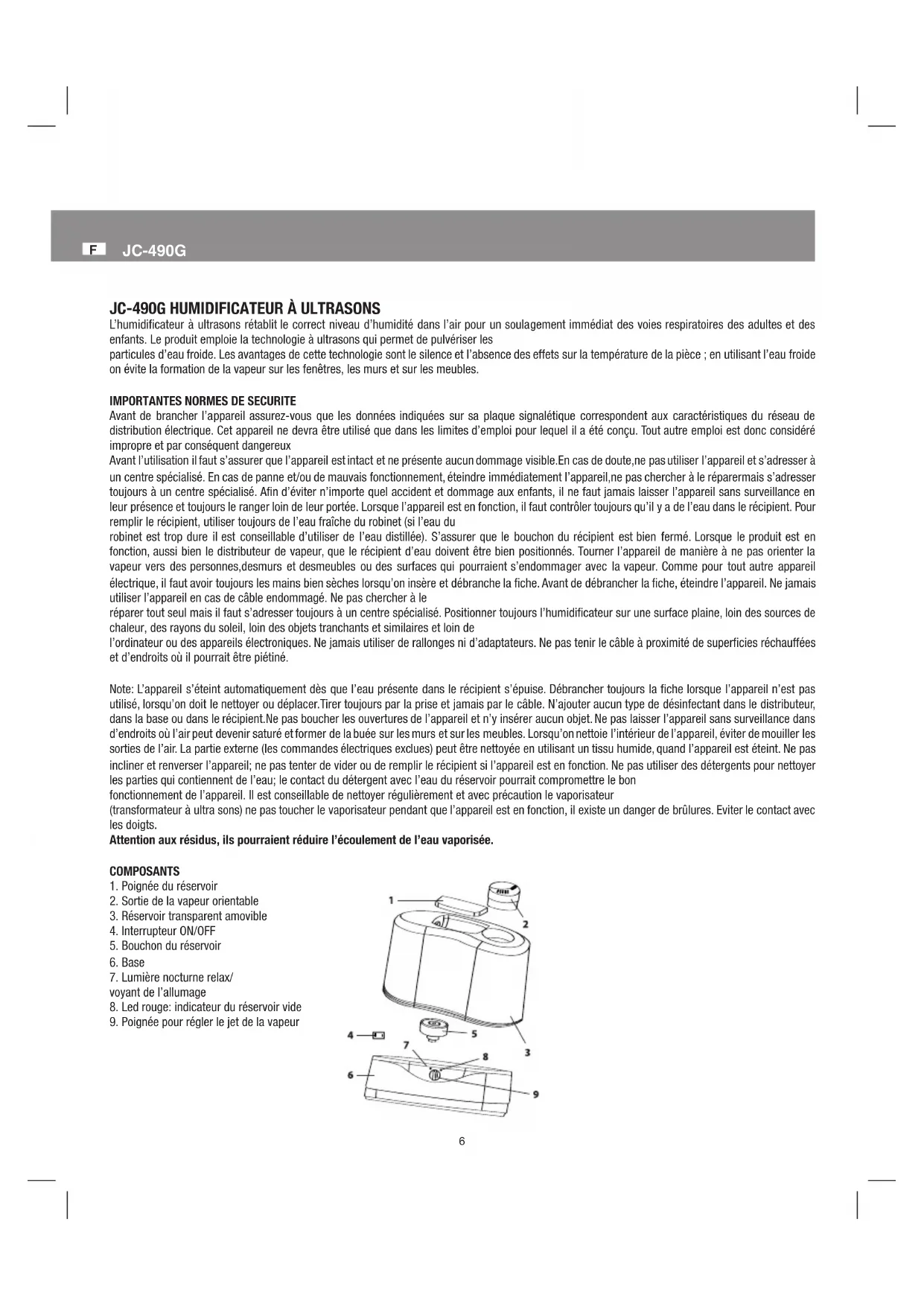 Avant de brancher l’appareil assurez-vous que les données indiquées sur sa plaque signalétique correspondent aux caractéristiques du réseau de distribution électrique. Cet appareil ne devra être utilisé que dans les limites d’emploi pour lequel il a été conçu. Tout autre emploi est donc considéré impropre et par conséquent dangereux Avant l’utilisation il faut s’assurer que l’appareil est intact et ne présente aucun dommage visible.En cas de doute,ne pas utiliser l’appareil et s’adresser à un centre spécialisé. En cas de panne et/ou de mauvais fonctionnement, éteindre immédiatement l’appareil,ne pas chercher à le réparermais s’adresser toujours à un centre spécialisé. Afin d’éviter n’importe quel accident et dommage aux enfants, il ne faut jamais laisser l’appareil sans surveillance en leur présence et toujours le ranger loin de leur portée. Lorsque l’appareil est en fonction, il faut contrôler toujours qu’il y a de l’eau dans le récipient. Pour remplir le récipient, utiliser toujours de l’eau fraîche du robinet (si l’eau du robinet est trop dure il est conseillable d’utiliser de l’eau distillée). S’assurer que le bouchon du récipient est bien fermé. Lorsque le produit est en fonction, aussi bien le distributeur de vapeur, que le récipient d’eau doivent être bien positionnés. Tourner l’appareil de manière à ne pas orienter la vapeur vers des personnes,desmurs et desmeubles ou des surfaces qui pourraient s’endommager avec la vapeur. Comme pour tout autre appareil électrique, il faut avoir toujours les mains bien sèches lorsqu’on insère et débranche la fiche. Avant de débrancher la fiche, éteindre l’appareil. Ne jamais utiliser l’appareil en cas de câble endommagé. Ne pas chercher à le réparer tout seul mais il faut s’adresser toujours à un centre spécialisé. Positionner toujours l’humidificateur sur une surface plaine, loin des sources de chaleur, des rayons du soleil, loin des objets tranchants et similaires et loin de l’ordinateur ou des appareils électroniques. Ne jamais utiliser de rallonges ni d’adaptateurs. Ne pas tenir le câble à proximité de superficies réchauffées et d’endroits où il pourrait être piétiné. Note: L’appareil s’éteint automatiquement dès que l’eau présente dans le récipient s’épuise. Débrancher toujours la fiche lorsque l’appareil n’est pas utilisé, lorsqu’on doit le nettoyer ou déplacer.Tirer toujours par la prise et jamais par le câble. N’ajouter aucun type de désinfectant dans le distributeur, dans la base ou dans le récipient.Ne pas boucher les ouvertures de l’appareil et n’y insérer aucun objet. Ne pas laisser l’appareil sans surveillance dans d’endroits où l’air peut devenir saturé et former de la buée sur les murs et sur les meubles. Lorsqu’on nettoie l’intérieur de l’appareil, éviter de mouiller les sorties de l’air. La partie externe (les commandes électriques exclues) peut être nettoyée en utilisant un tissu humide, quand l’appareil est éteint. Ne pas incliner et renverser l’appareil; ne pas tenter de vider ou de remplir le récipient si l’appareil est en fonction. Ne pas utiliser des détergents pour nettoyer les parties qui contiennent de l’eau; le contact du détergent avec l’eau du réservoir pourrait compromettre le bon fonctionnement de l’appareil. Il est conseillable de nettoyer régulièrement et avec précaution le vaporisateur (transformateur à ultra sons) ne pas toucher le vaporisateur pendant que l’appareil est en fonction, il existe un danger de brûlures. Eviter le contact avec les doigts. Attention aux résidus, ils pourraient réduire l’écoulement de l’eau vaporisée. COMPOSANTS