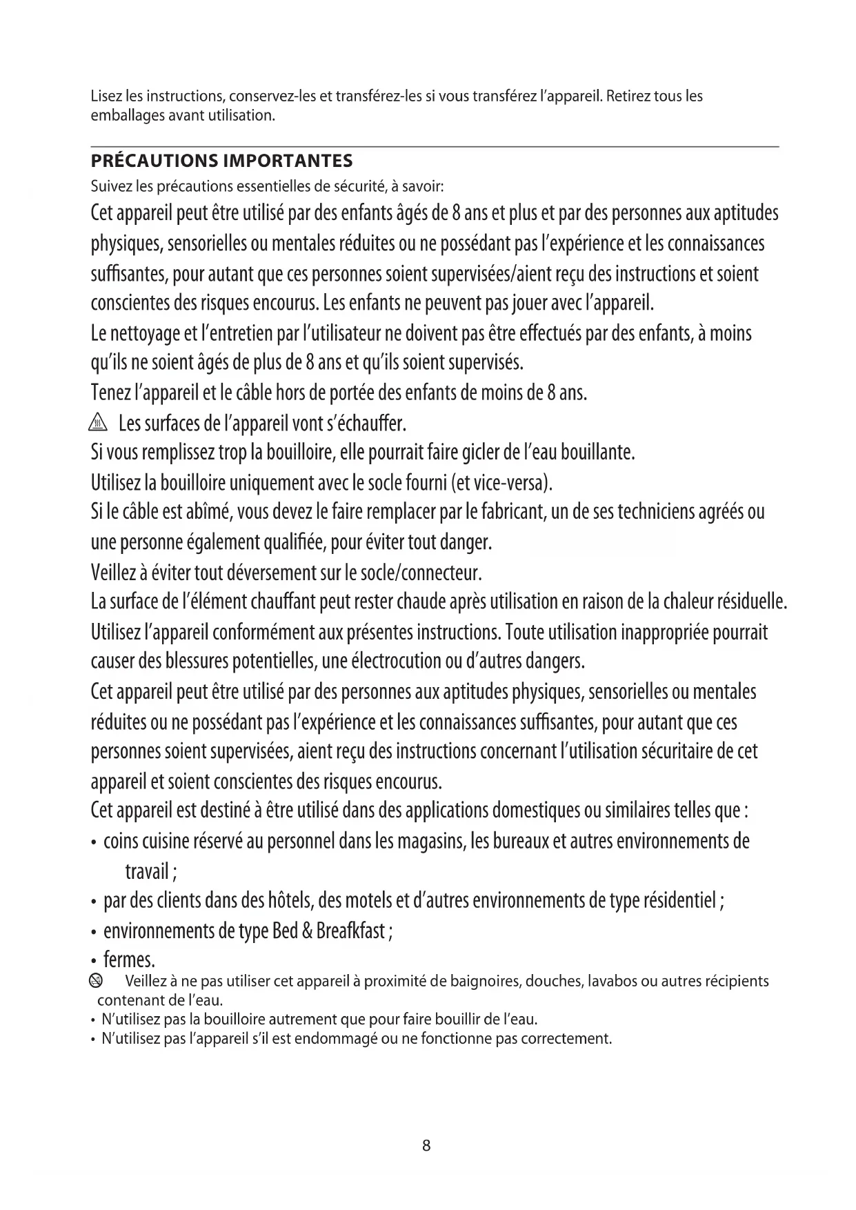 Suivez les précautions essentielles de sécurité, à savoir: Cet appareil peut être utilisé par des enfants âgés de 8 ans et plus et par des personnes aux aptitudes physiques, sensorielles ou mentales réduites ou ne possédant pas l’expérience et les connaissances suffisantes, pour autant que ces personnes soient supervisées/aient reçu des instructions et soient conscientes des risques encourus. Les enfants ne peuvent pas jouer avec l’appareil. Le nettoyage et l’entretien par l’utilisateur ne doivent pas être effectués par des enfants, à moins qu’ils ne soient âgés de plus de 8 ans et qu’ils soient supervisés. Tenez l’appareil et le câble hors de portée des enfants de moins de 8 ans. h Les surfaces de l’appareil vont s’échauffer. Si vous remplissez trop la bouilloire, elle pourrait faire gicler de l’eau bouillante. Utilisez la bouilloire uniquement avec le socle fourni (et vice-versa). Si le câble est abîmé, vous devez le faire remplacer par le fabricant, un de ses techniciens agréés ou une personne également qualifiée, pour éviter tout danger. Veillez à éviter tout déversement sur le socle/connecteur. La surface de l’élément chauffant peut rester chaude après utilisation en raison de la chaleur résiduelle. Utilisez l’appareil conformément aux présentes instructions. Toute utilisation inappropriée pourrait causer des blessures potentielles, une électrocution ou d’autres dangers. Cet appareil peut être utilisé par des personnes aux aptitudes physiques, sensorielles ou mentales réduites ou ne possédant pas l’expérience et les connaissances suffisantes, pour autant que ces personnes soient supervisées, aient reçu des instructions concernant l’utilisation sécuritaire de cet appareil et soient conscientes des risques encourus. Cet appareil est destiné à être utilisé dans des applications domestiques ou similaires telles que :