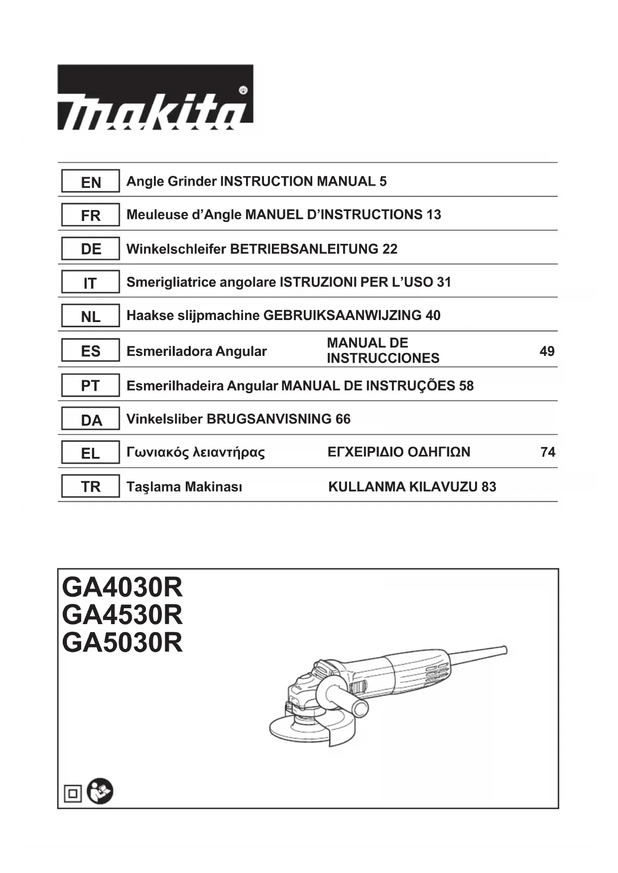 ATTENTION : Ces accessoires ou pièces complémentaires sont recommandés pour l’utilisation avec l’outil Makita spécié dans ce mode d’emploi. L’utilisation de tout autre accessoire ou pièce complémentaire peut comporter un risque de blessure. N’utilisez les accessoires ou pièces complémentaires qu’aux ns aux- quelles ils ont été conçus. Pour obtenir plus de détails sur ces accessoires, contactez votre centre d’entretien local Makita. ►Fig.20 - Modèle 100 mm Modèle 115 mm Modèle 125 mm 1 Poignée 36 2 Carter de meule (pour meule ordinaire) 3 Flasque intérieur Flasque intérieur/Super asque 4 Meule à moyeu déporté/Disque à lamelles 5 Contre-écrou 6 Semelle 7 Meule exible 8 Coussinet de caoutchouc 76 Coussinet de caoutchouc 100 Coussinet de caoutchouc 115 9 Disque abrasif 10 Contre-écrou de ponçage 11 Brosse métallique circulaire 12 Brosse métallique à coupelle 13 Carter de meule (pour meule à tronçonner) *1 14 Meule à tronçonner abrasive/Meule diamantée - Clé à contre-écrou21 FRANÇAIS NOTE : *1 Dans certains pays d’Europe, avec une meule diamantée, il est possible d’utiliser le carter de protection ordinaire au lieu du carter spécial qui recouvre les deux côtés de la meule. Respectez la réglementation en vigueur dans votre pays. NOTE : Il se peut que certains éléments de la liste soient compris dans l’emballage de l’outil en tant qu’acces- soires standard. Ils peuvent varier d’un pays à l’autre.22 DEUTSCH DEUTSCH (Original-Anleitung) TECHNISCHE DATEN Modell: GA4030R GA4530R GA5030R Scheibendurchmesser 100 mm 115 mm 125 mm Max. Scheibendicke 6,4 mm Spindelgewinde M10 M14 oder 5/8″ (länderspezisch) Nenndrehzahl (n) 11.000 min