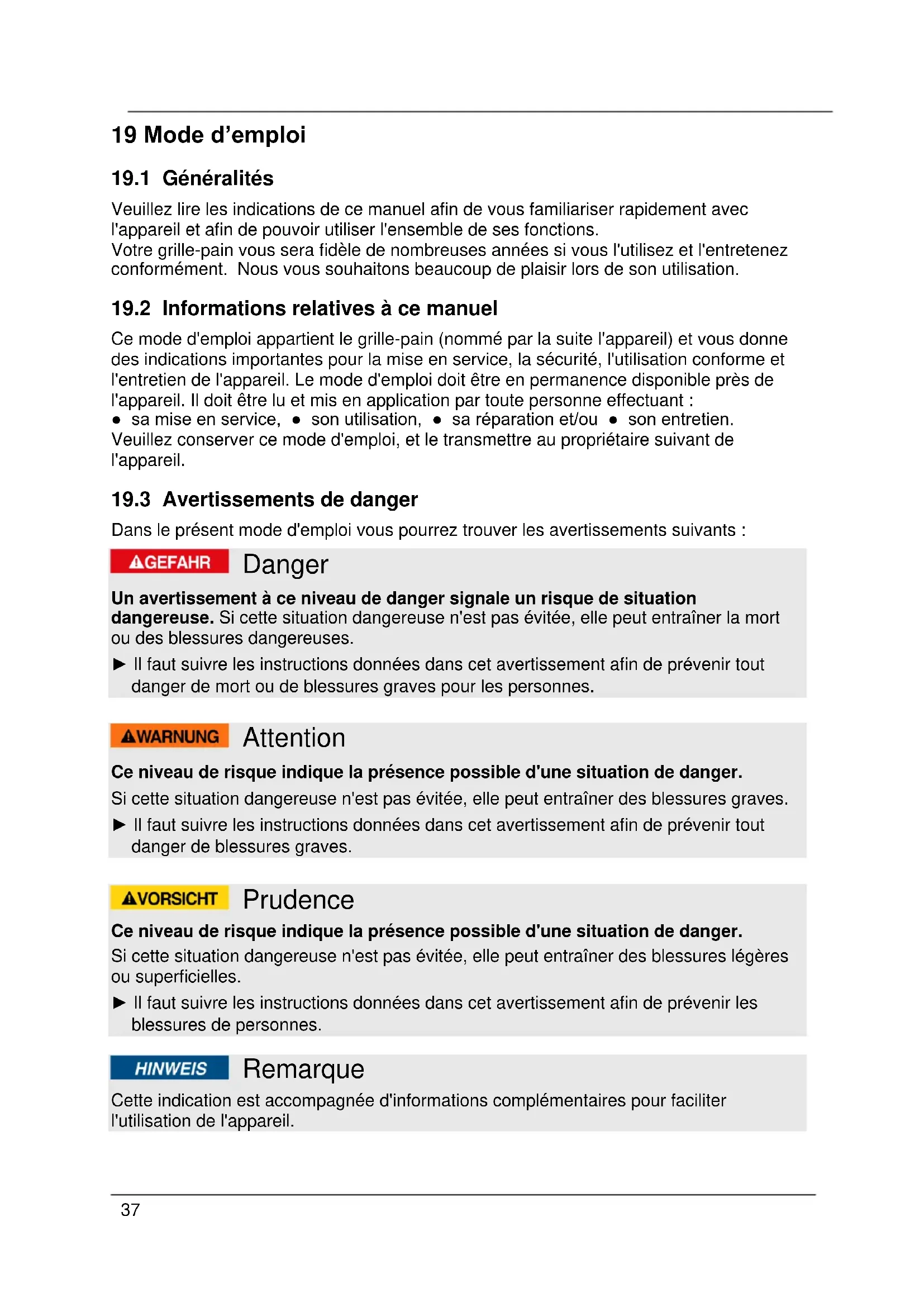 - dans les pensions proposant des petits déjeuners. Toute autre utilisation est considérée comme non conforme.39 Attention Danger en cas d'utilisation non conforme ! En cas d'usage non conforme et/ou non approprié l'appareil peut devenir une source de danger. ► Utiliser l'appareil uniquement de façon conforme. ► Respecter les procédures décrites dans ce mode d'emploi. Tout recours en garantie est supprimé en cas de dommages causés par une utilisation non conforme. L'utilisateur est entièrement responsable des risques encourus.